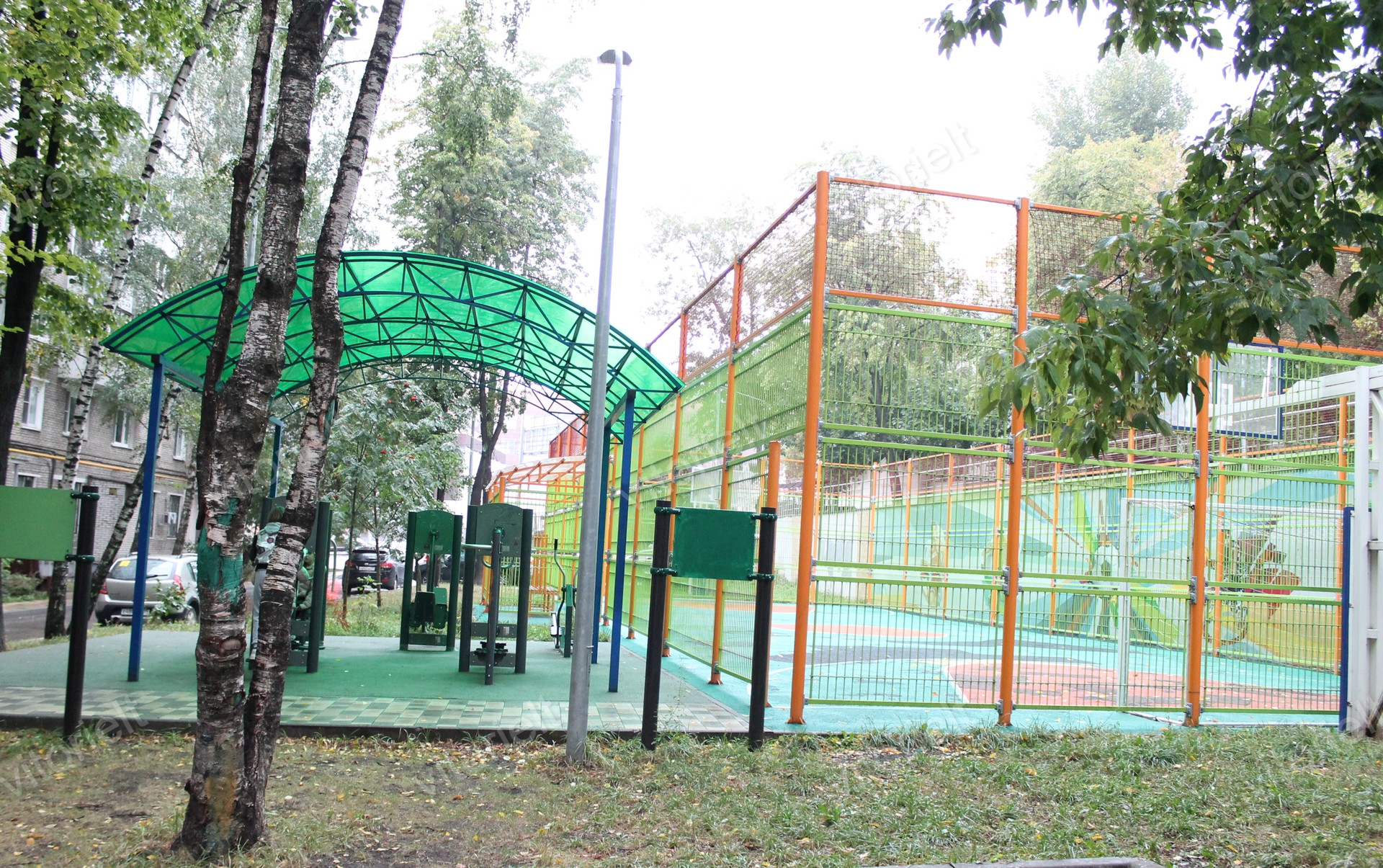 Выход из подъезда во двор, домофон. Двор уютный, тихий, во дворе детская и спортивная площадки.