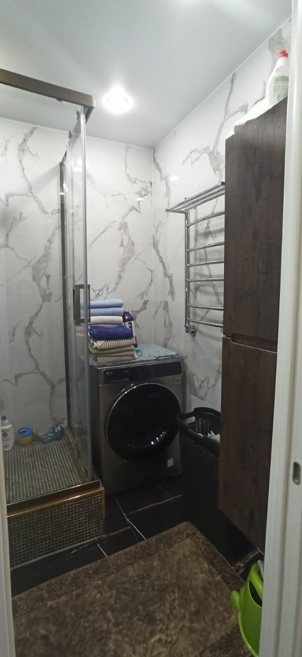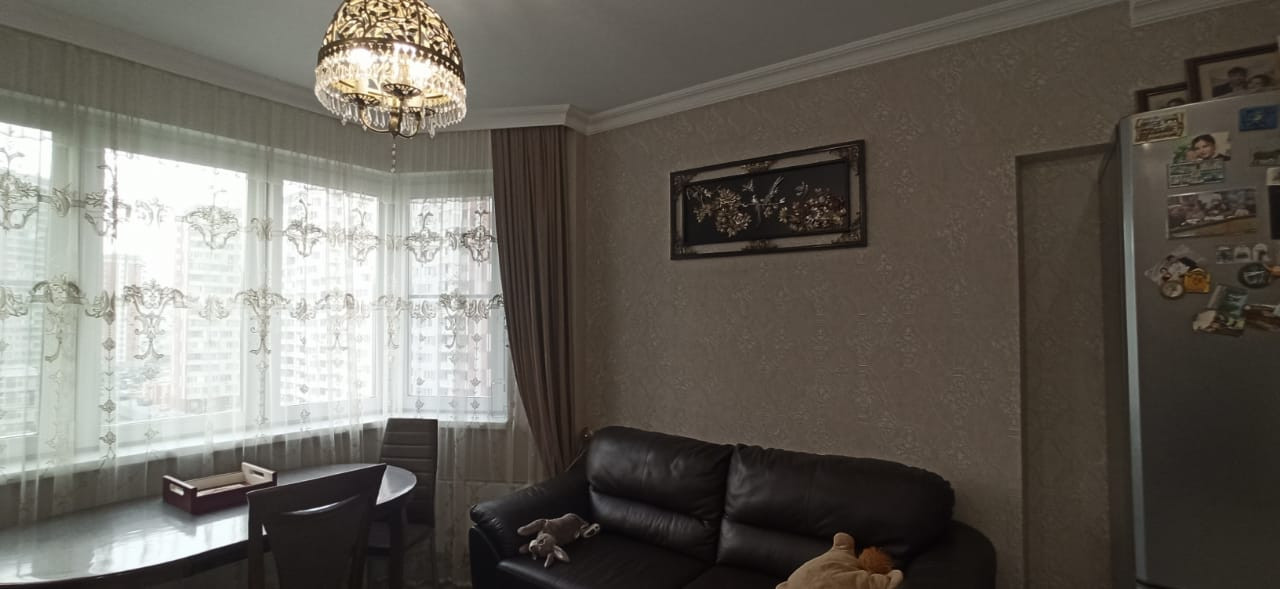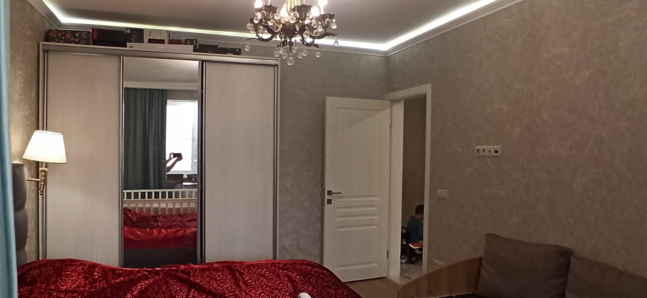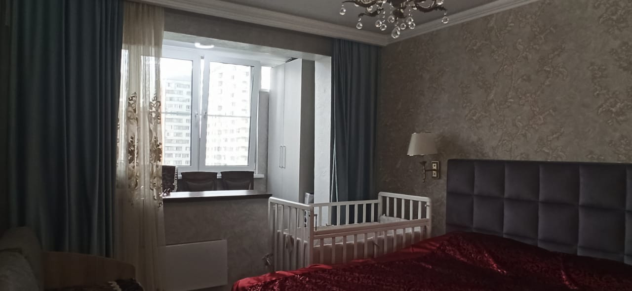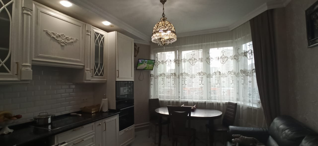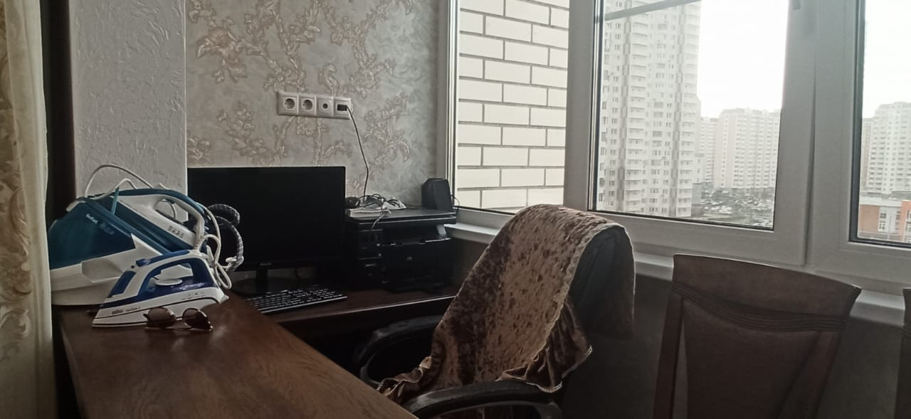 Квартира в отличном состоянии, сделан качественный ремонт. Натяжные потолки, на кухне двухуровневые потолки с точечным освещением. Установлен бойлер. Теплые полы. Лоджии утеплены, теплый пол. Одну лоджию объединили с комнатой, сделали кабинет, на второй лоджии организованы места для хранения. В квартире сделана шумоизоляция. Встроенный кухонный гарнитур со встроенной бытовой техникой, включая посудомоечную машину. Столешница – камень. Итальянская сантехника. В квартире остается вся мебель и бытовая техника. Во дворе детская площадка, школа, детские сады.