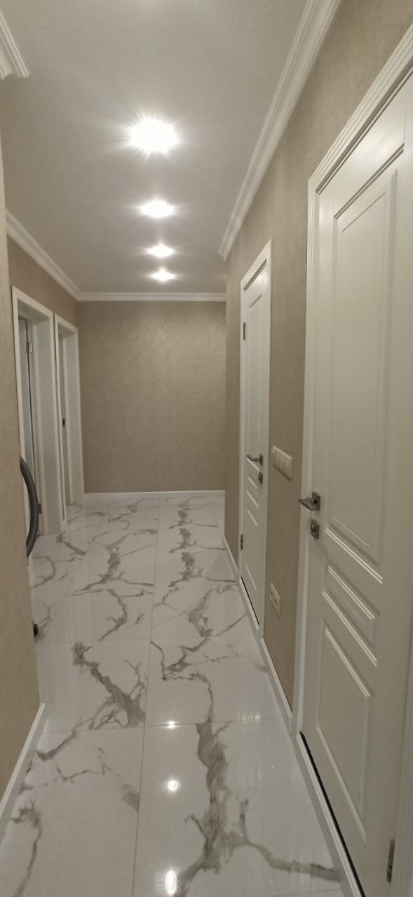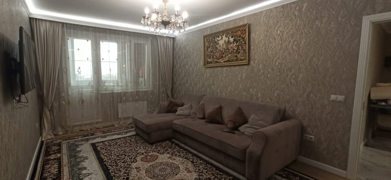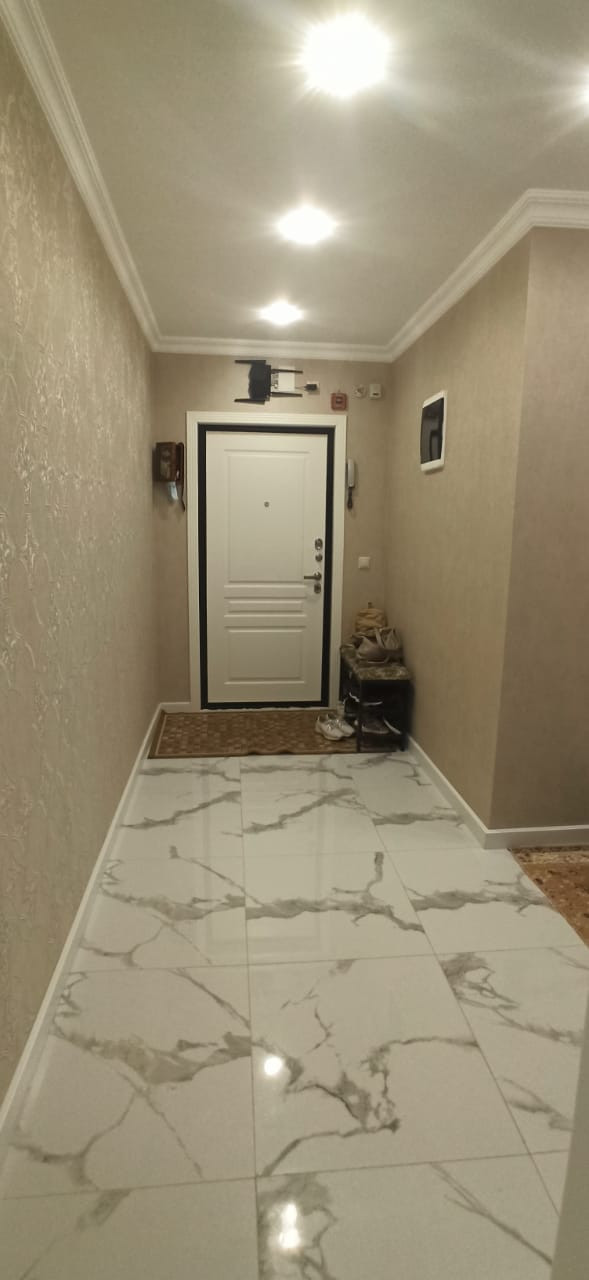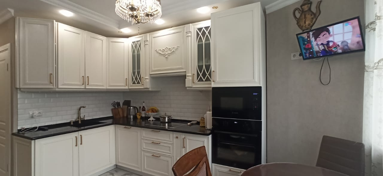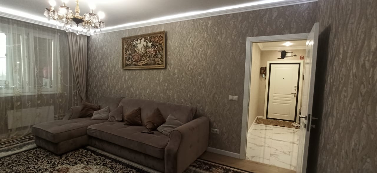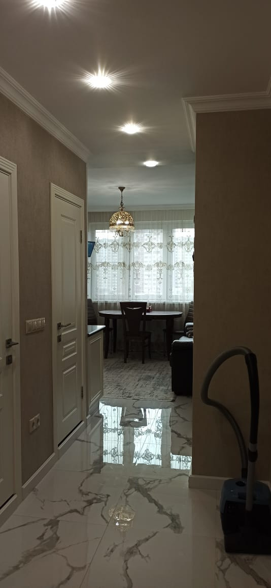 Квартира в отличном состоянии, сделан качественный ремонт. Натяжные потолки, на кухне двухуровневые потолки с точечным освещением. Установлен бойлер. Теплые полы. Лоджии утеплены, теплый пол. Одну лоджию объединили с комнатой, сделали кабинет, на второй лоджии организованы места для хранения. В квартире сделана шумоизоляция. Встроенный кухонный гарнитур со встроенной бытовой техникой, включая посудомоечную машину. Столешница – камень. Итальянская сантехника. В квартире остается вся мебель и бытовая техника. Во дворе детская площадка, школа, детские сады.