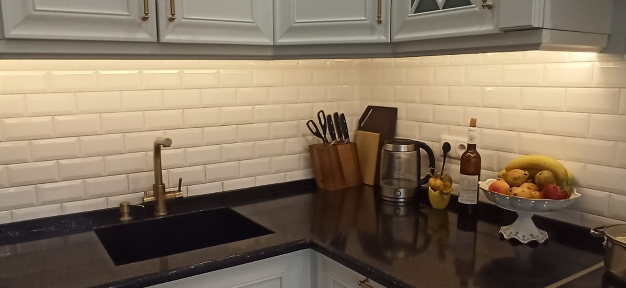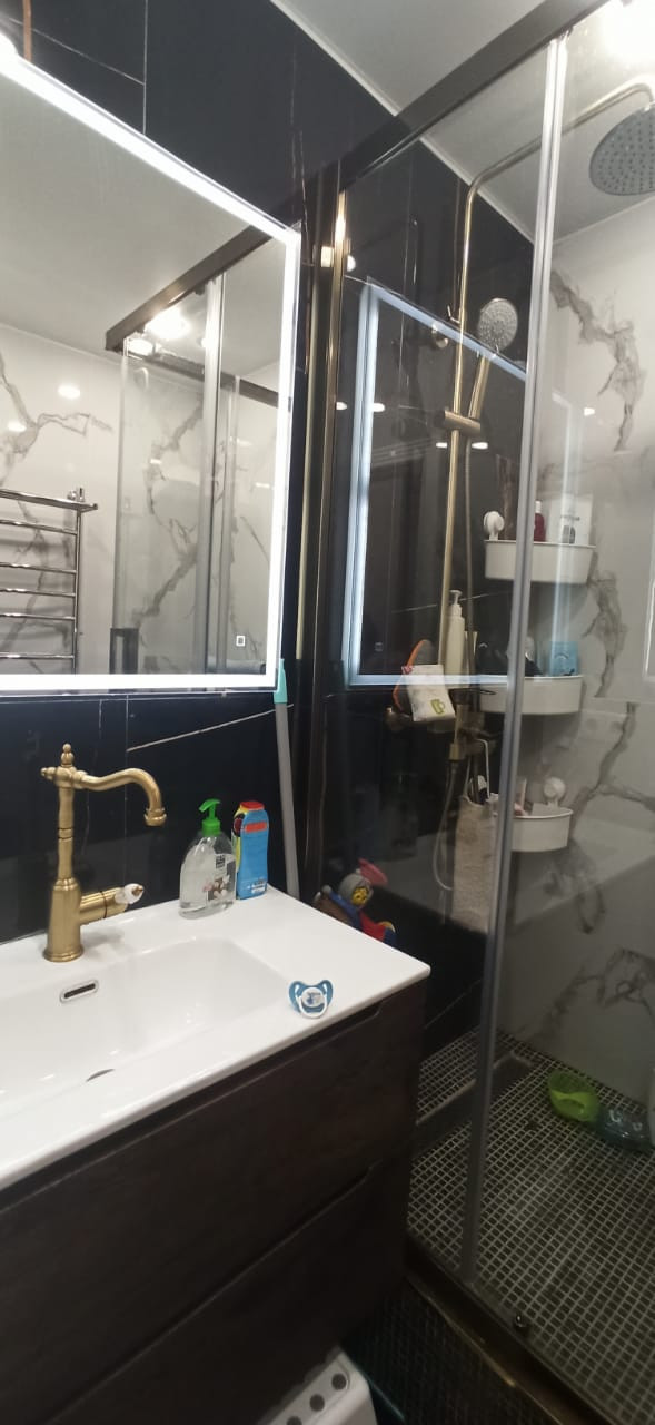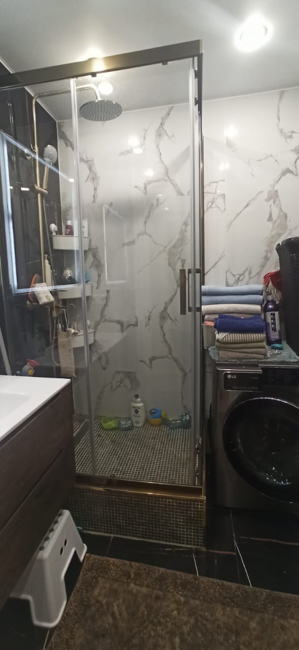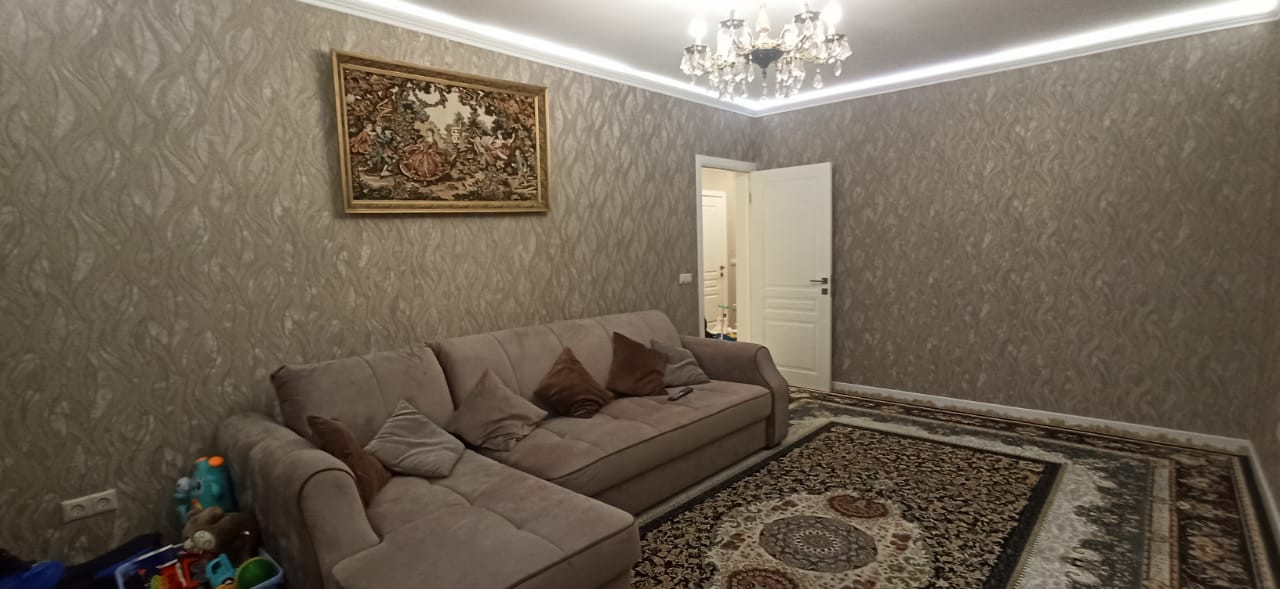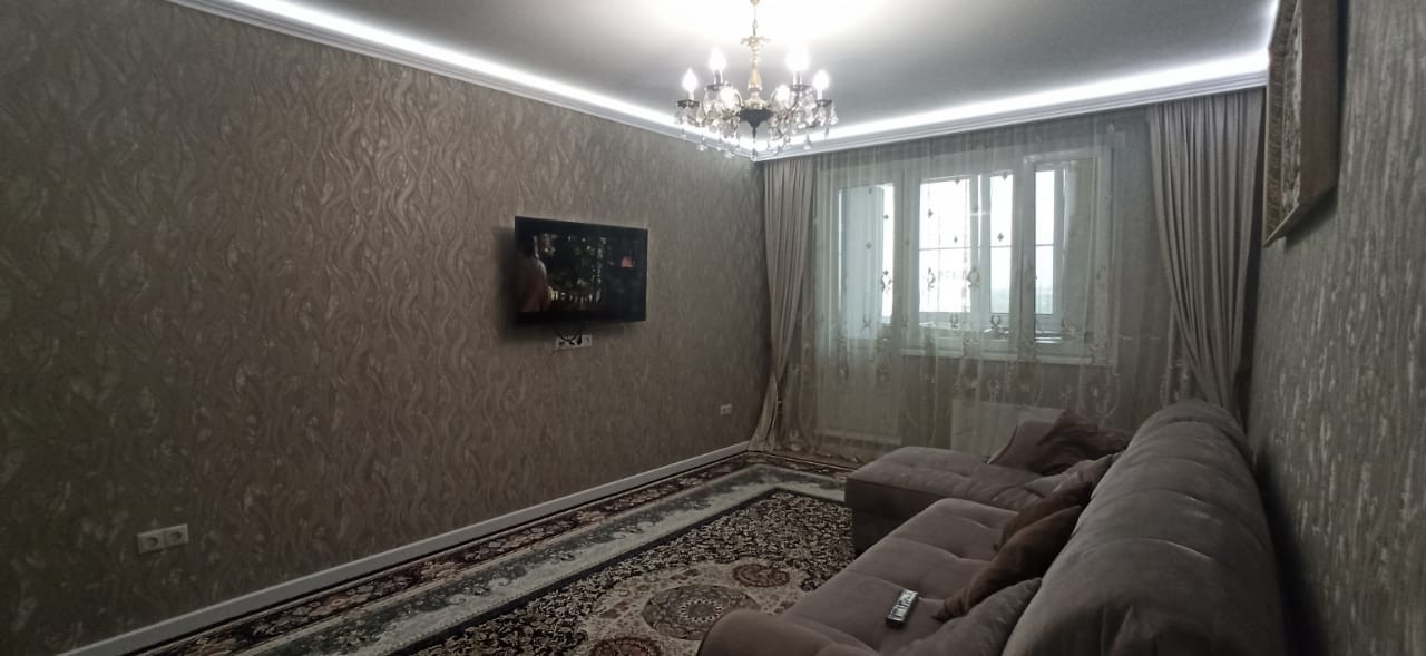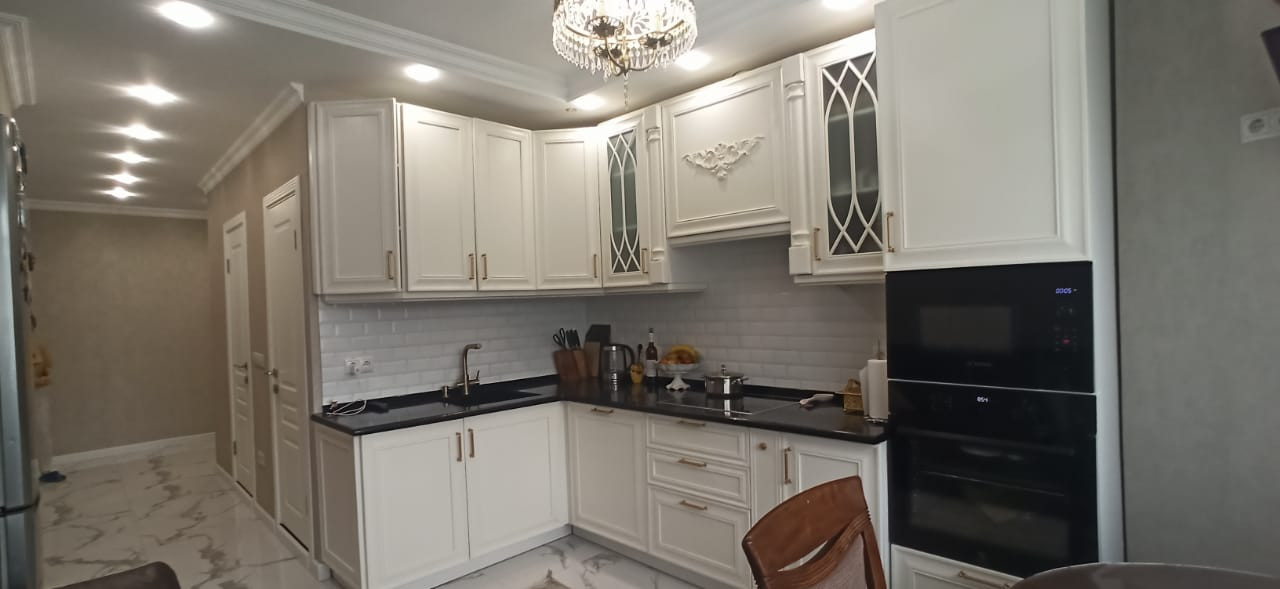 Квартира в отличном состоянии, сделан качественный ремонт. Натяжные потолки, на кухне двухуровневые потолки с точечным освещением. Установлен бойлер. Теплые полы. Лоджии утеплены, теплый пол. Одну лоджию объединили с комнатой, сделали кабинет, на второй лоджии организованы места для хранения. В квартире сделана шумоизоляция. Встроенный кухонный гарнитур со встроенной бытовой техникой, включая посудомоечную машину. Столешница – камень. Итальянская сантехника. В квартире остается вся мебель и бытовая техника. Во дворе детская площадка, школа, детские сады.