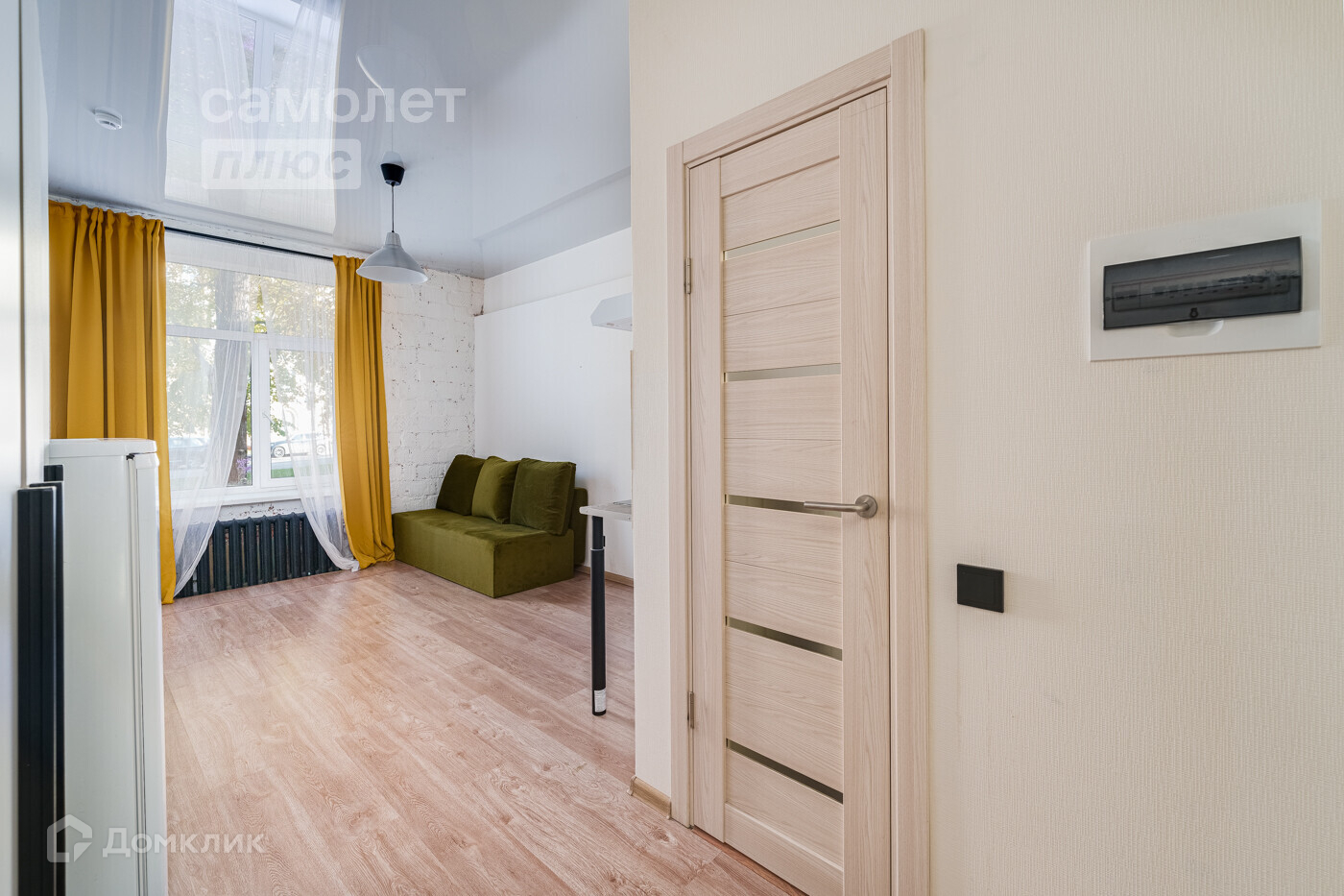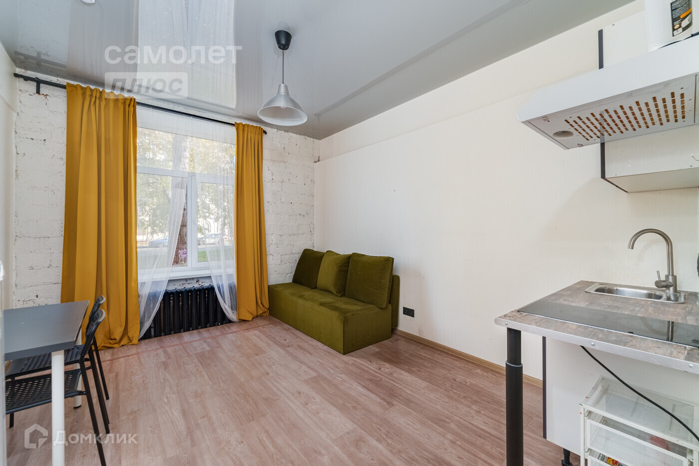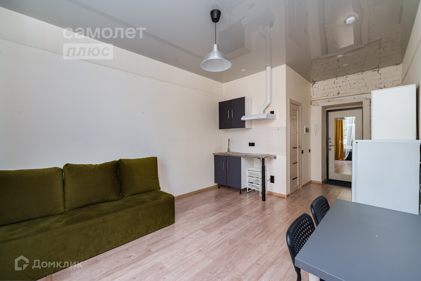 На полу ламинат, ремонт «Лофт», с мебелью, техникой и сан узлом.