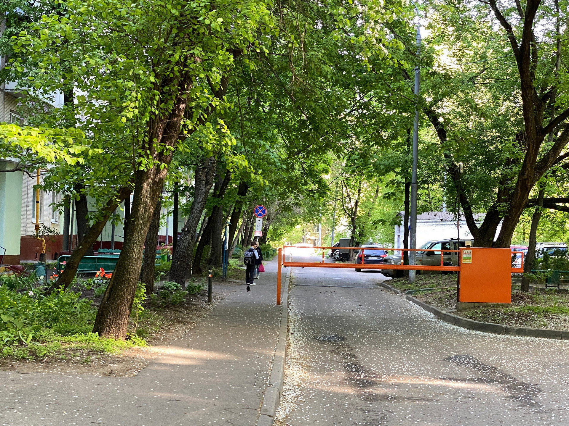 Двор зелёный с детскими площадками, за шлагбаумом.
