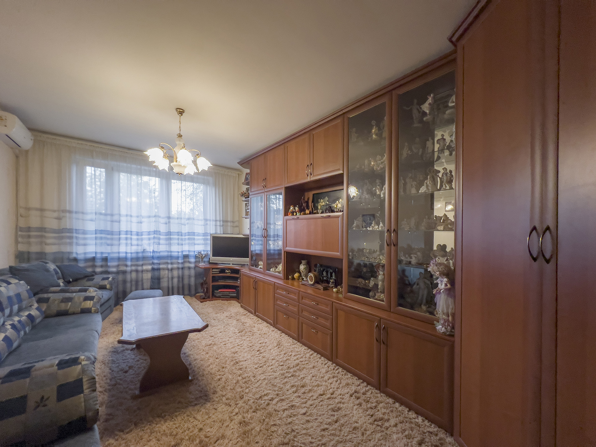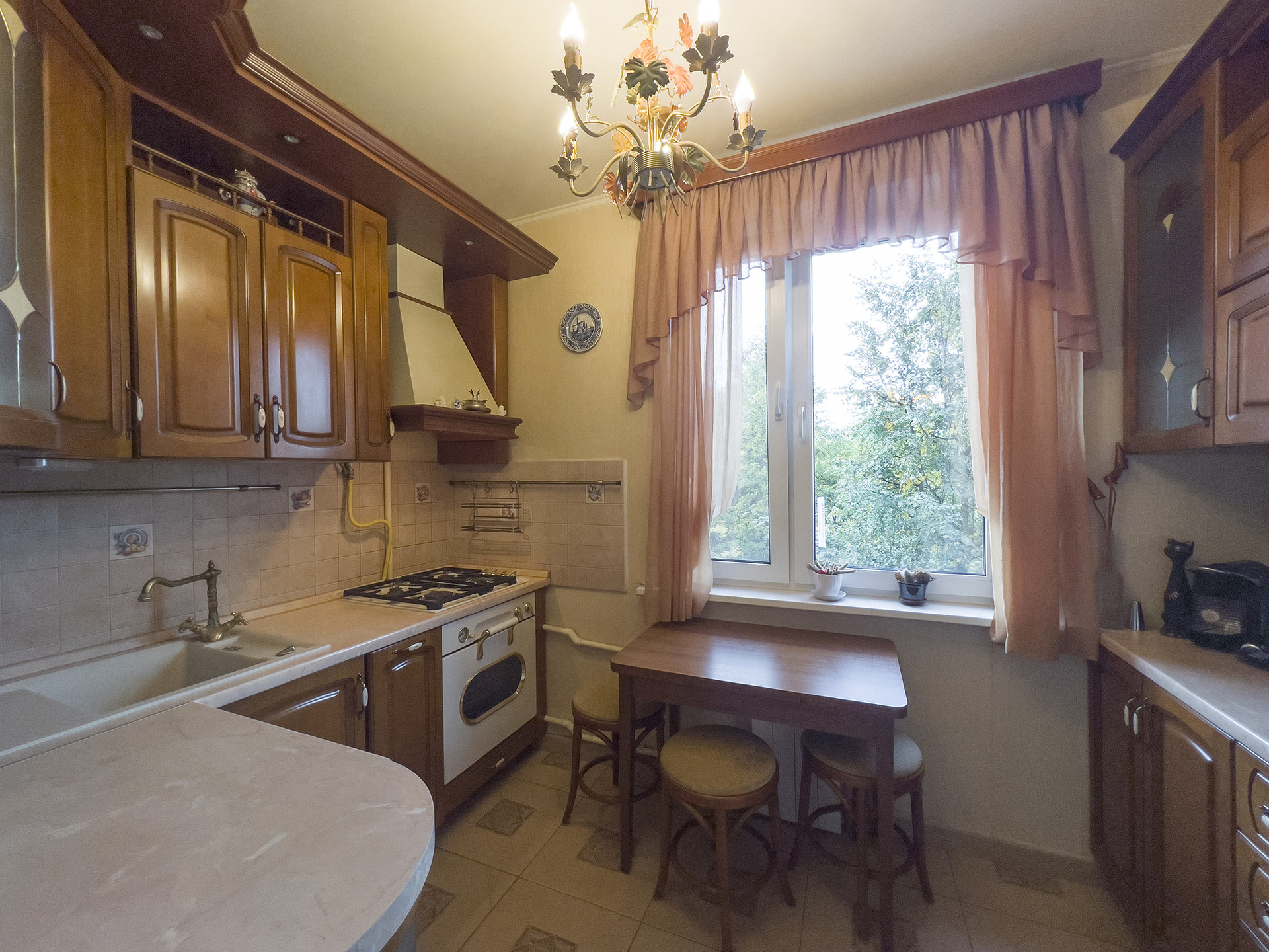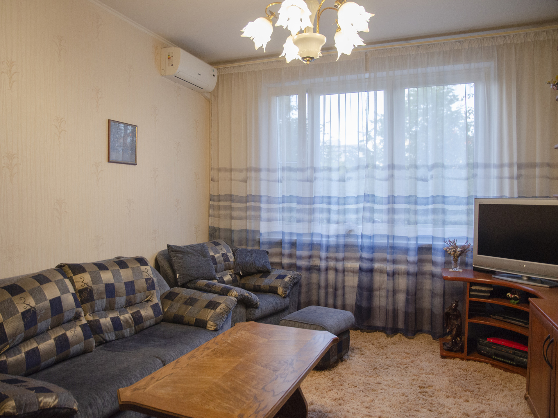 Планировка квартиры удобная, с окнами на разные стороны, а итальянская мебель в маленькой комнате, выполненная на заказ из массива дерева, придает интерьеру особую изысканность. В гостиной установлен мощный кондиционер. Полы на кухне и в ванной комнате оснащены подогревом.