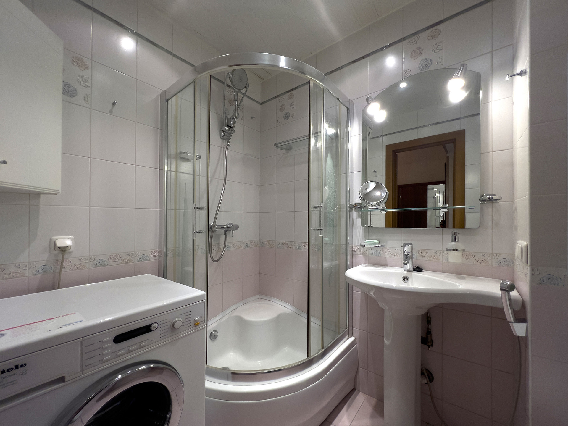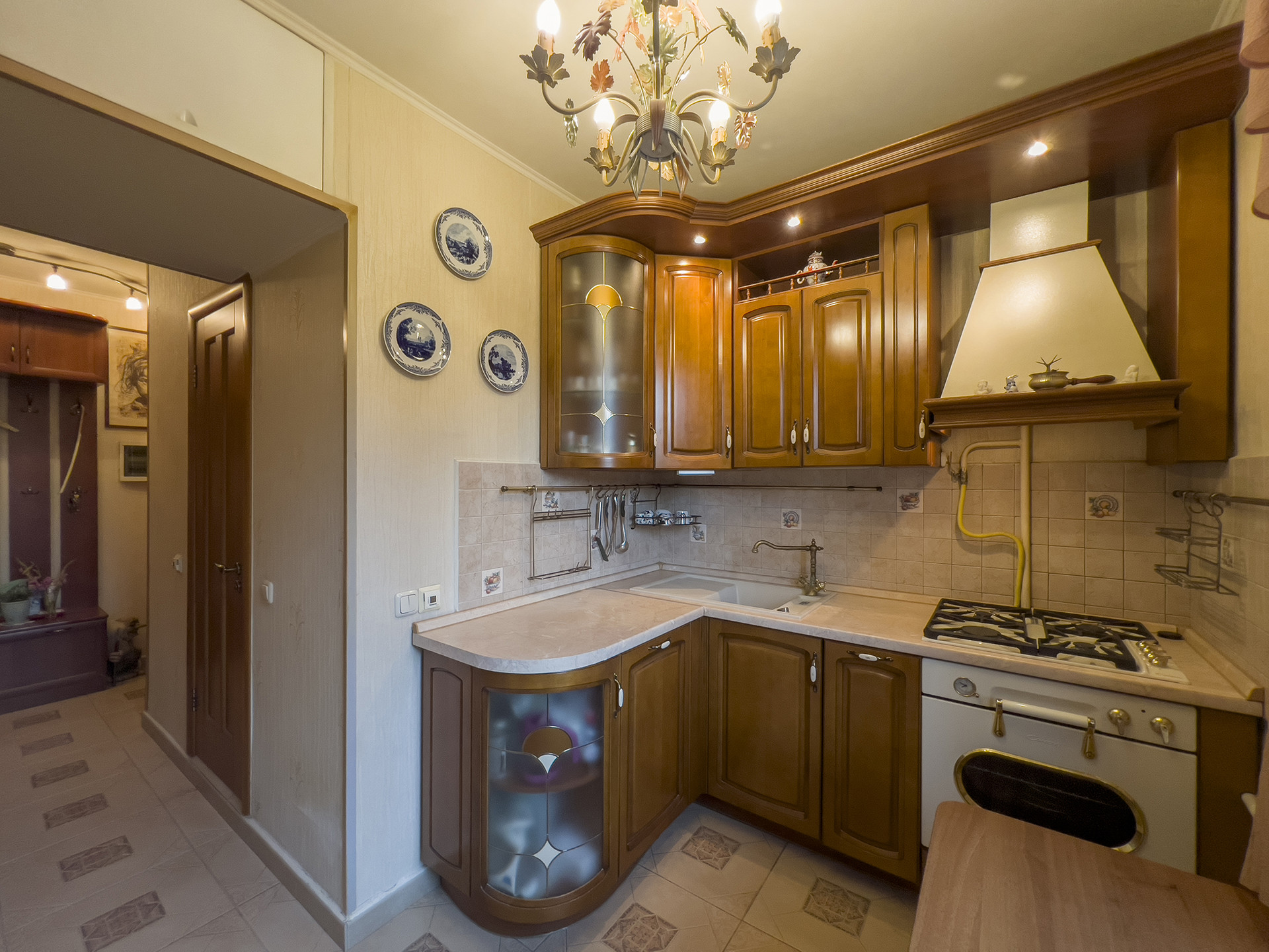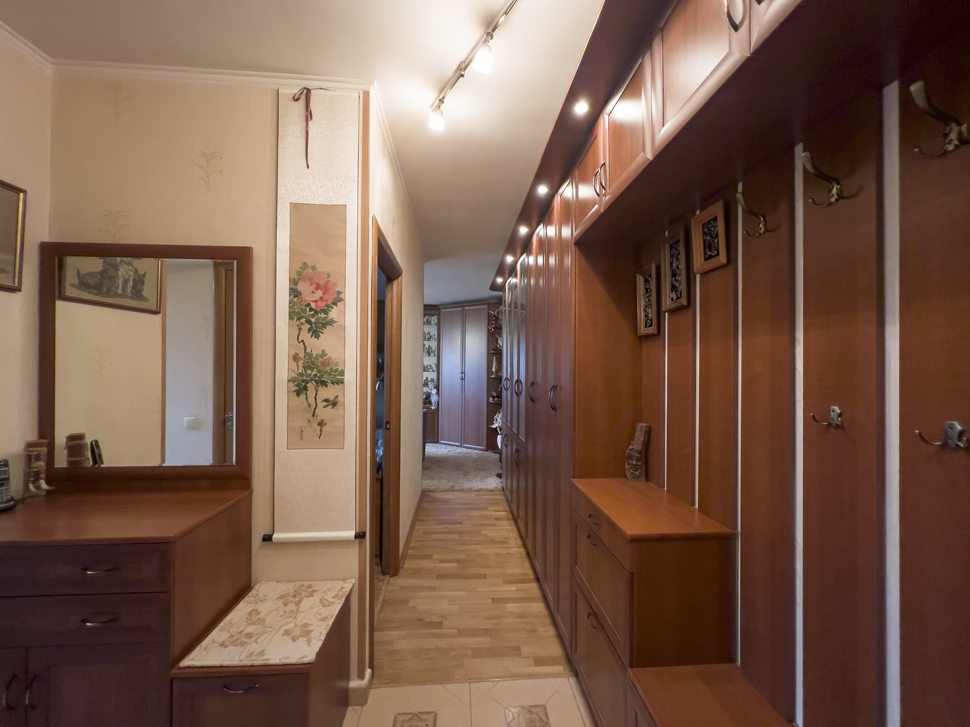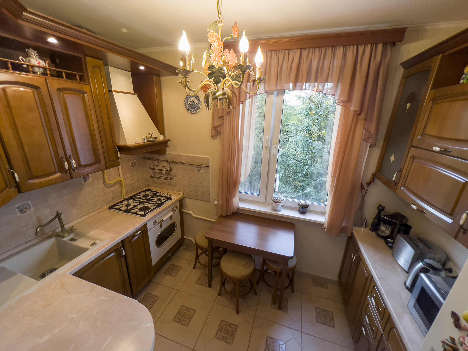 Планировка квартиры удобная, с окнами на разные стороны, а итальянская мебель в маленькой комнате, выполненная на заказ из массива дерева, придает интерьеру особую изысканность. В гостиной установлен мощный кондиционер. Полы на кухне и в ванной комнате оснащены подогревом.