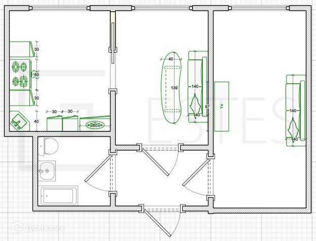 Общая площадь квартиры- 46,2 кв.м, функциональная планировка предусматривает: