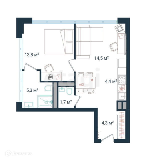 Общая площадь 45.7 м2