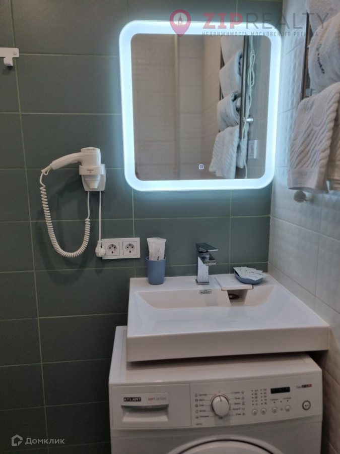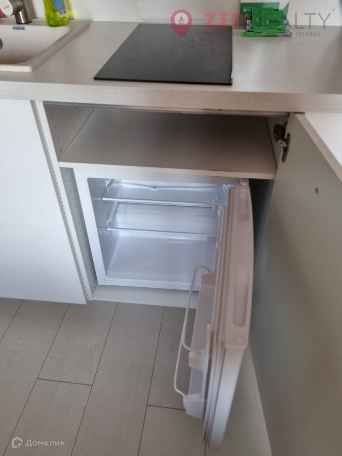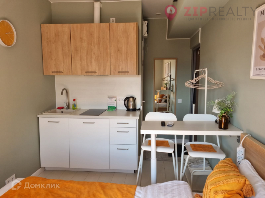 В студии выполнен качественный дизайнерский ремонт. Помещение полностью готово к проживанию: студия обставлена стильной мебелью, установлен новый кондиционер; кухня имеет встроенную плиту и мини-холодильник, а в санузле установлены душевая кабина и стиральная машина.