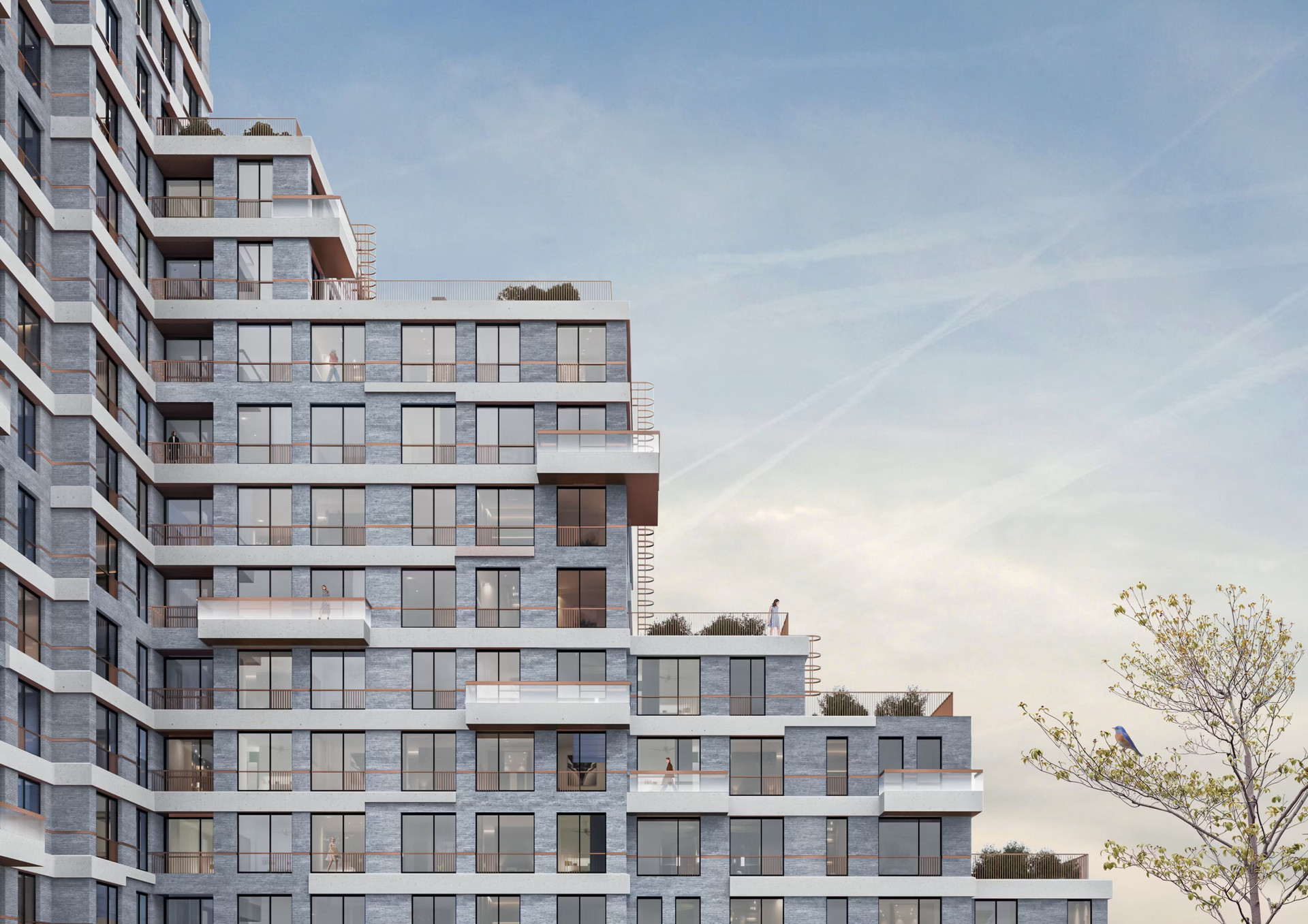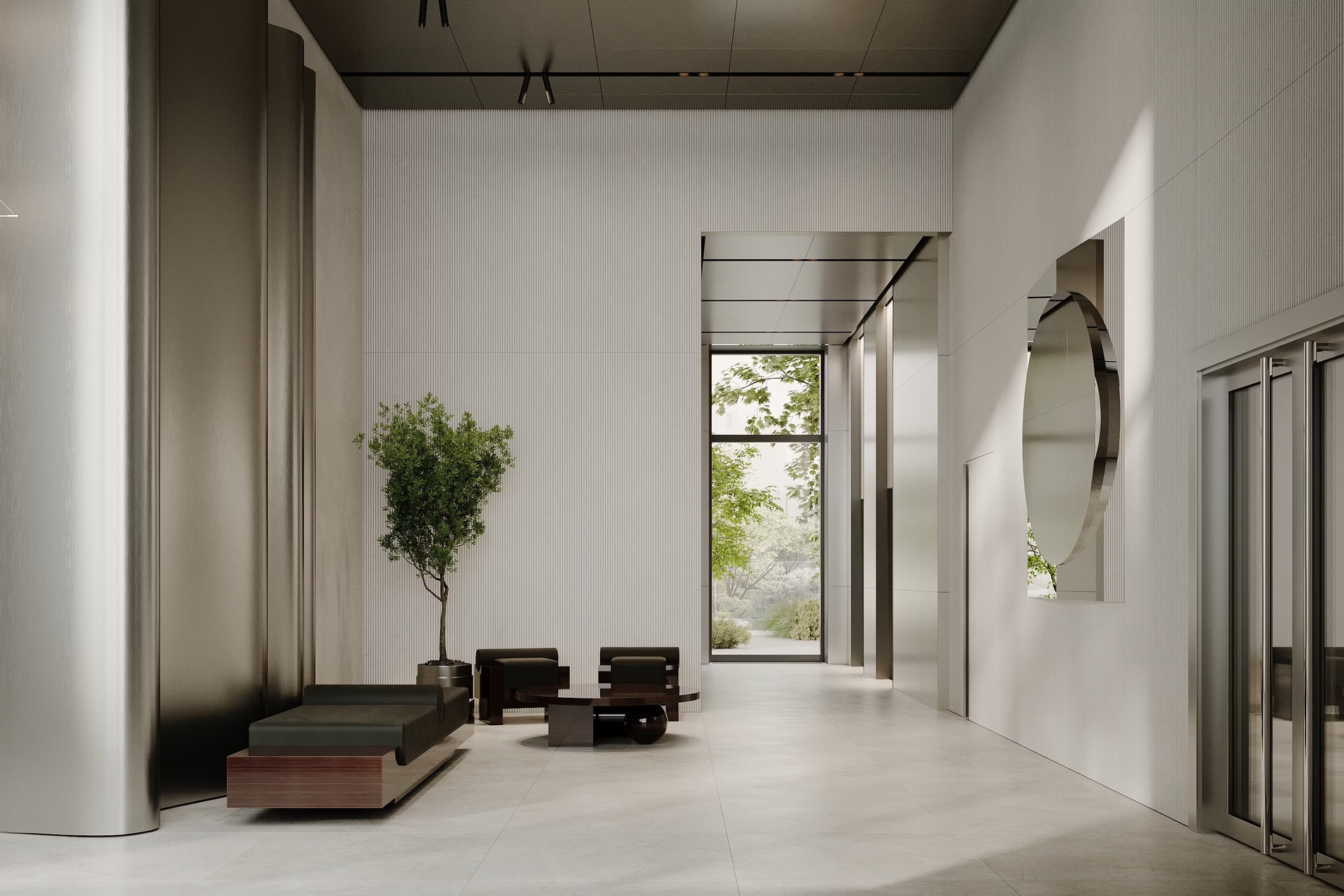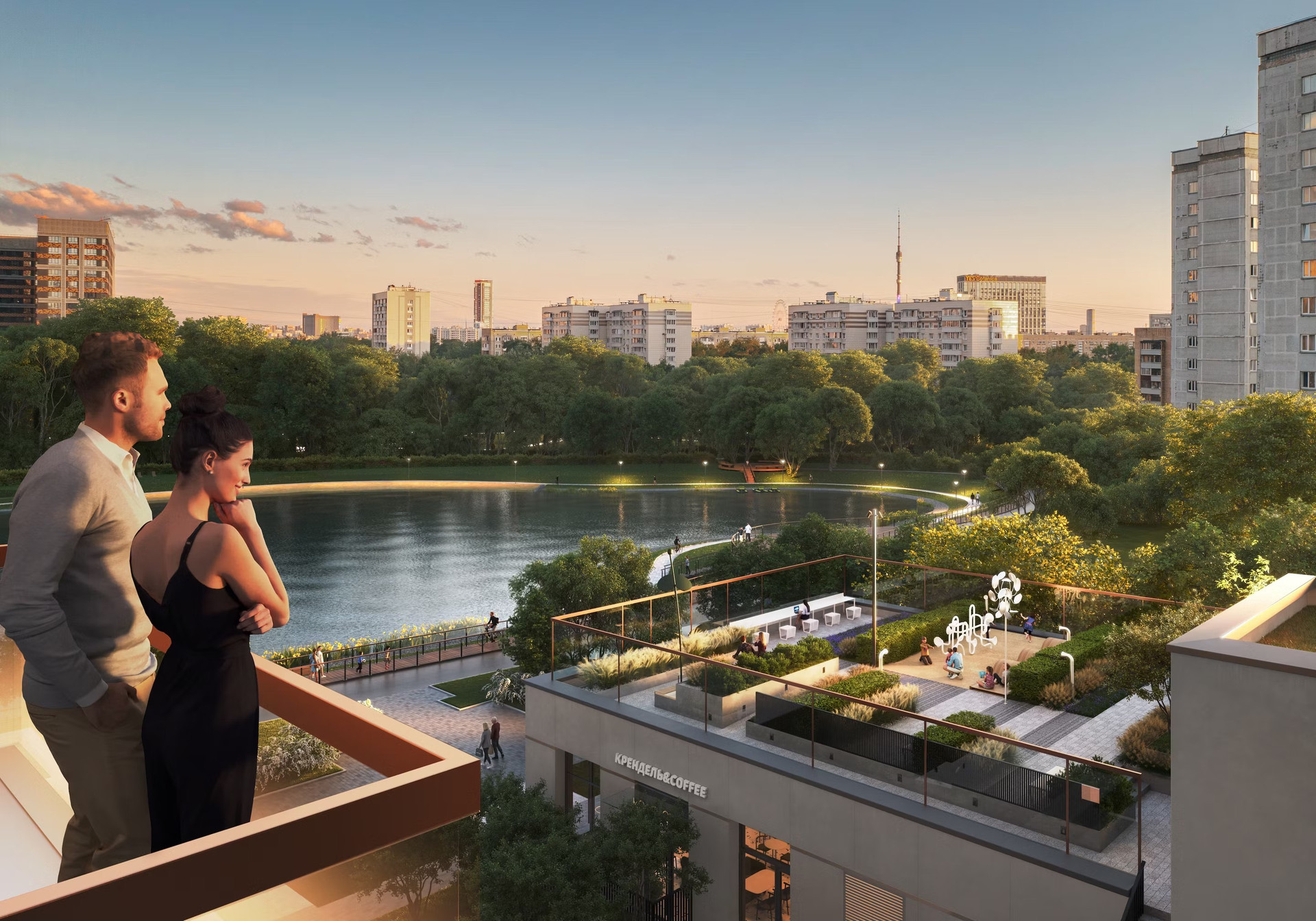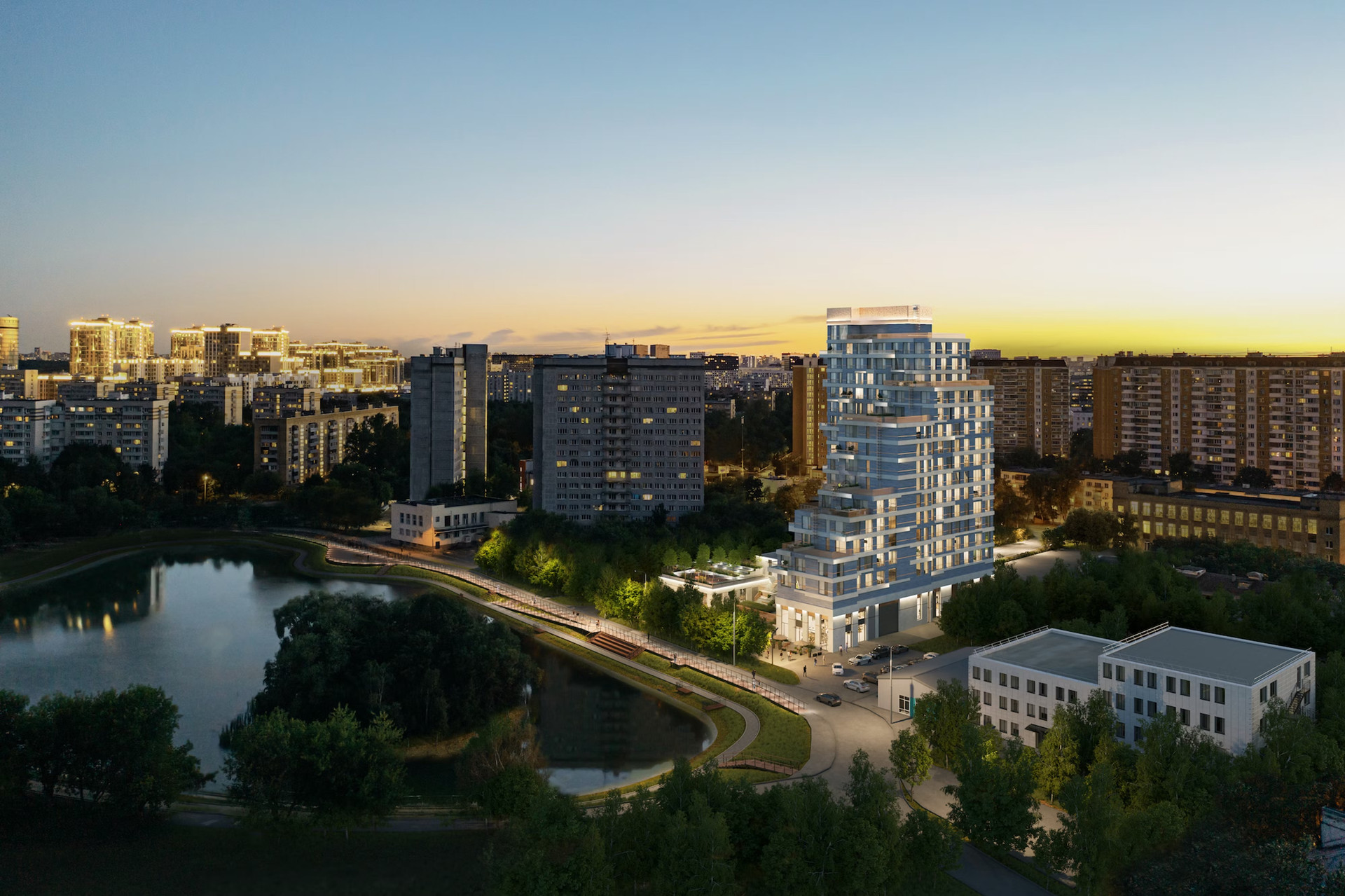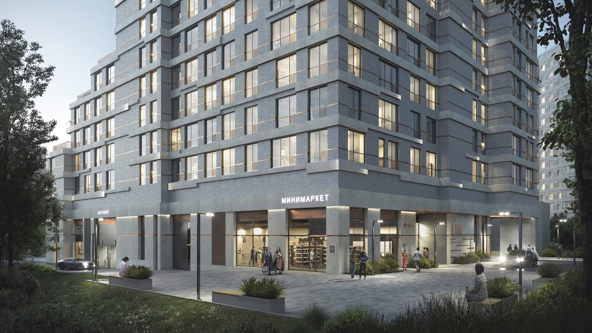 Жилой комплекс «The Lake» высотой от 10 до 16 этажей. В комплексе есть гранд-лобби с высокими 5-и метровыми потолками, витражными окнами, зонами отдыха, стойкой ресепшен и отдельной почтовой комнатой. Лобби спроектировано бюро ECUS. Имеет 2 скоростных лифта.