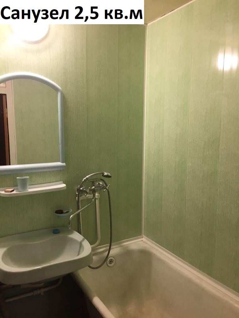 Квартира площадью 38 кв.м. (в ЕРГН 34,3 кв.м.). Комната 19,1 кв.м. с длинной лоджией 3,7 кв.м. (диван, раскладное кресло, стенка, шкаф), кухня 9,5 кв.м. (кухонный гарнитур, газовая плита с духовкой, холодильник, стиральная машинка, обеденный стол). Совмещенный санузел 2,5 кв.м. (раковина, зеркало, унитаз), коридор 3 кв.м.. Окна пластиковые.
