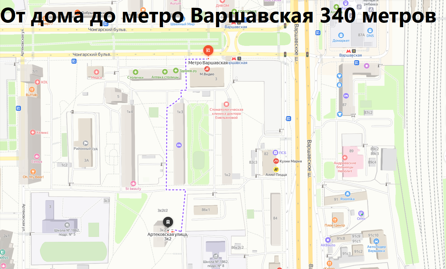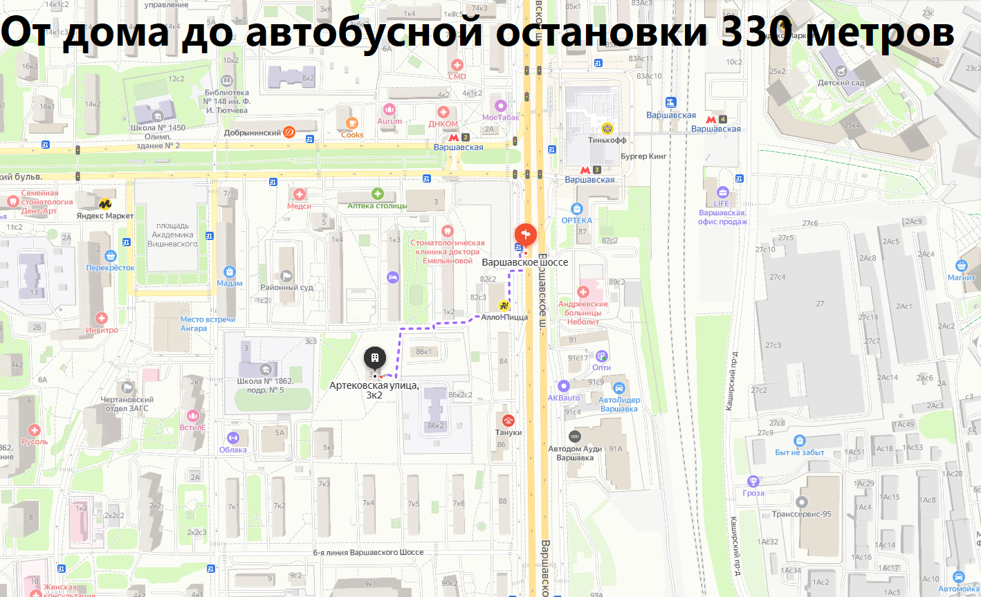 Удобная транспортная доступность. От дома до автобусной остановки 330 метров пешком. От дома до метро Варшавская 340 метров пешком.
