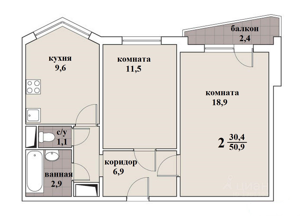 Общая площадь 50.9 м2