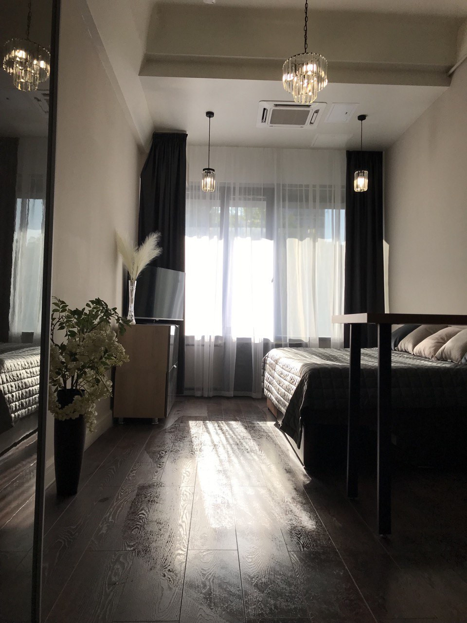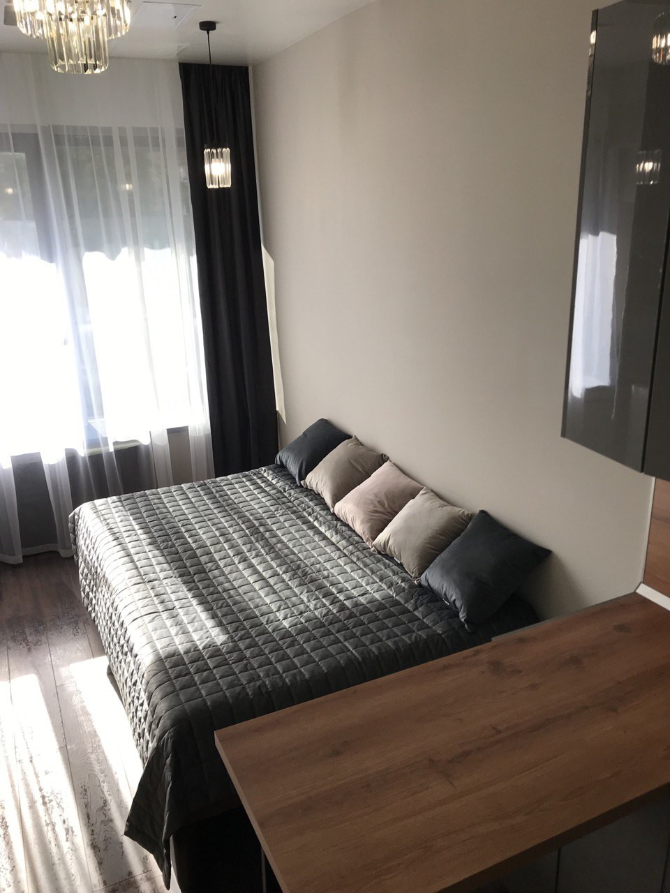 Апартаменты меблированы встроенной кухней, шкаф, тумба под телевизор, кровать. Есть телевизор, стиральная машина, высокий встроенный холодильник, духовка, плита, вытяжка, кондиционер.                                     В шаговой доступности находится ТЦ Метромаркет, Перекрёсток, Азбука Вкуса, рестораны, бары, банки, аптеки, парки, выставочный зал, концертный зал.