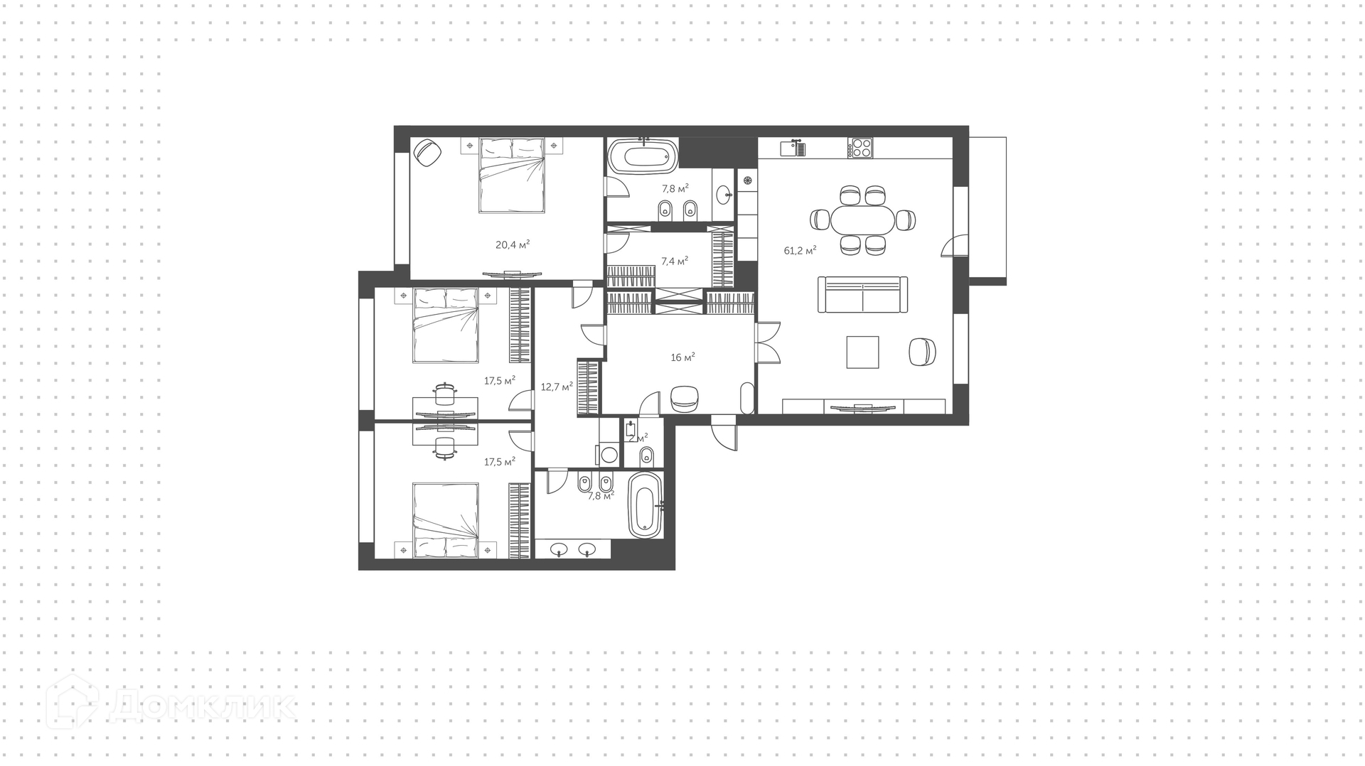Планировка: кухня, гостиная-столовая, мастер-спальня с собственным санузлом и гардеробной, 2 спальни с санузлами, постирочная, холл, гостевой санузел. В квартире установлена система «умный дом», полы с подогревом, шторы на электроприводе, канальная система приточно-вытяжной вентиляции и кондиционирования, встроенный пылесос.