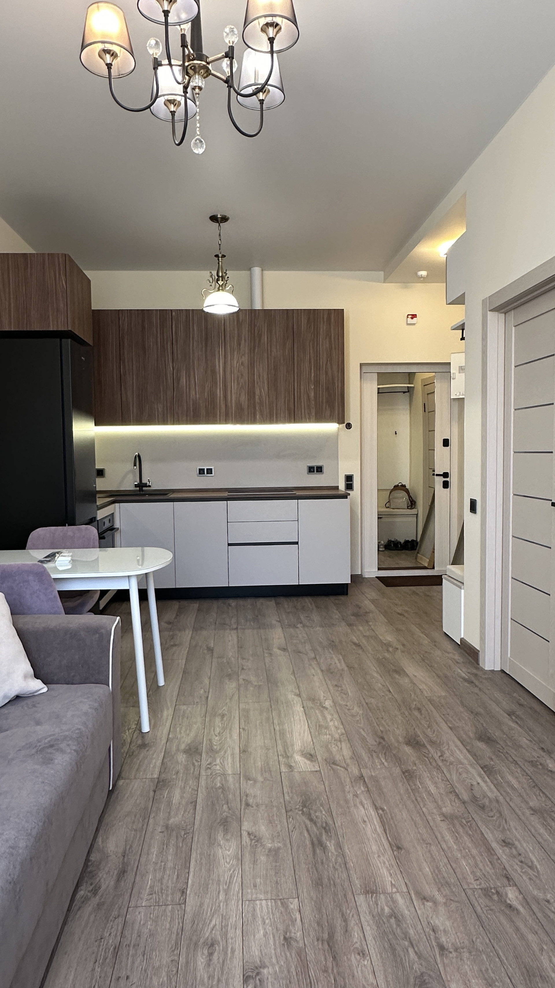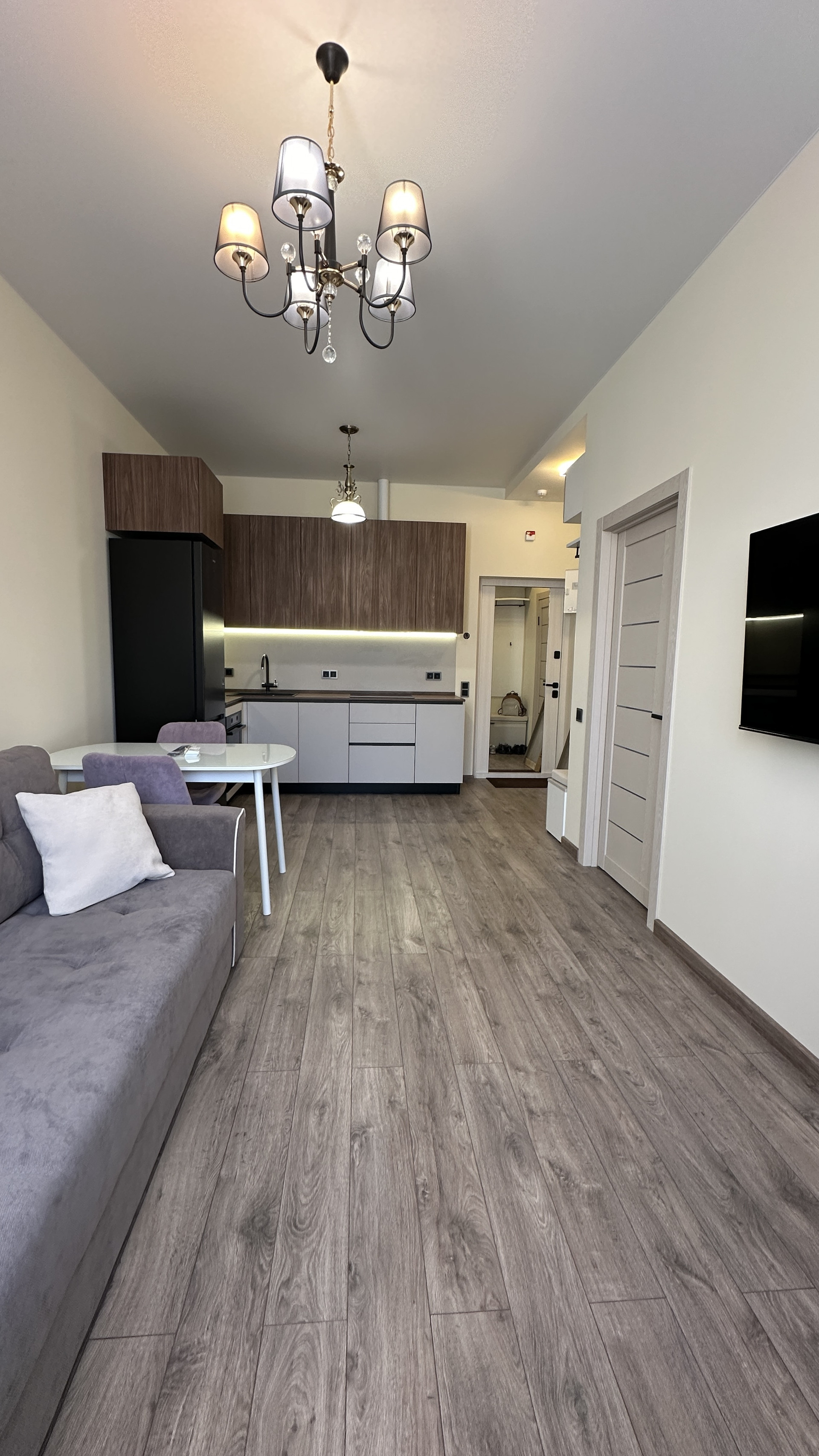 В гостиной установлен кухонный гарнитур "Стильные кухни" с подсветкой и встроенной бытовой техникой: посудомоечная машина, холодильник, СВЧ, индукционная плита, вытяжка, духовой шкаф, в зоне отдыха двуспальный диван, телевизор, кондиционер.