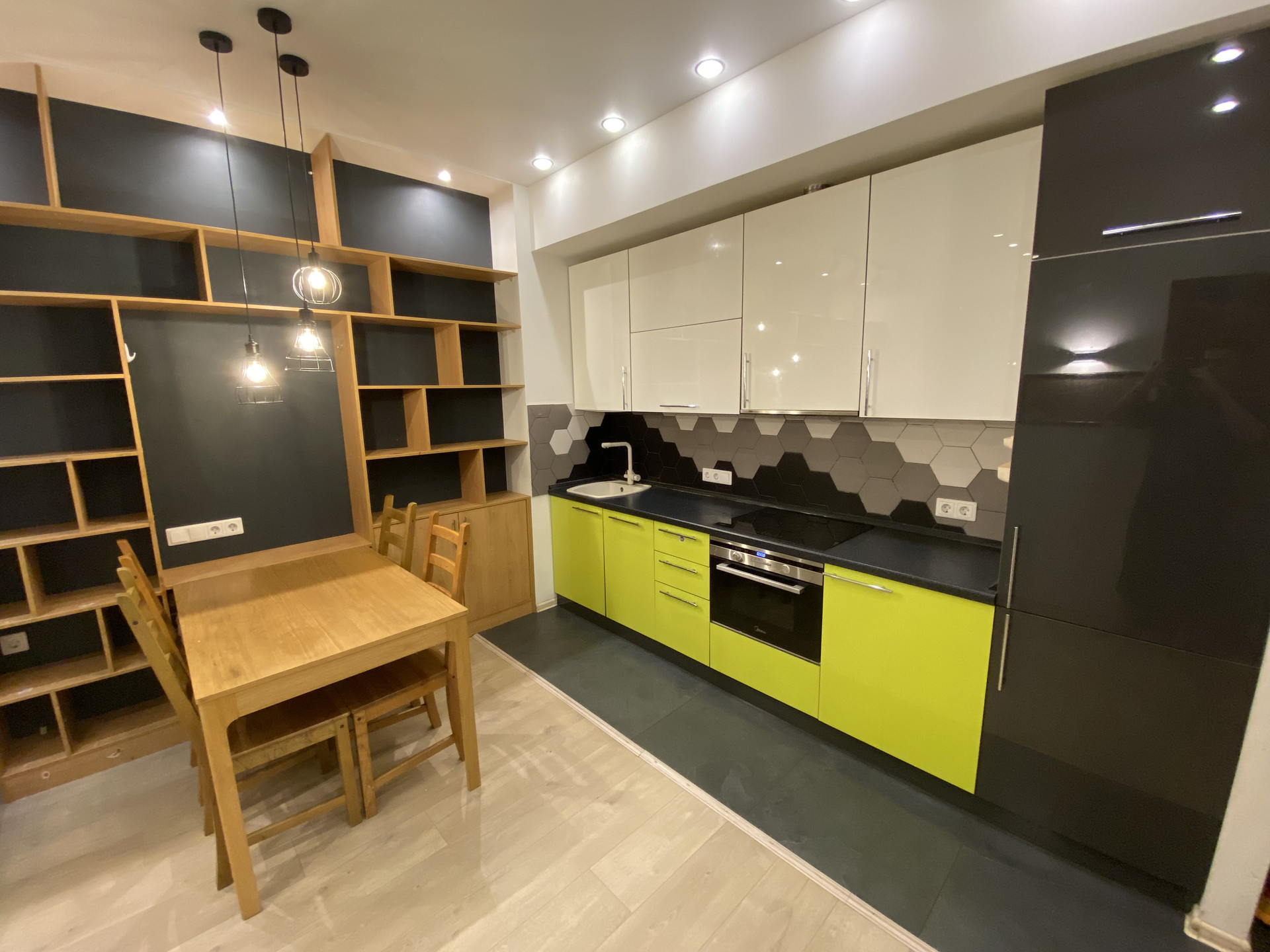 На кухне (всё встраиваемое): холодильник Haier, стиральная машинка с сушилкой два в одном Candy, духовка с СВЧ два в одном Midea, варочная панель Fornelli, посудомойка. Доводчики.