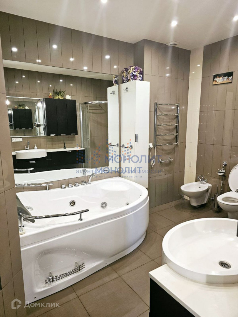В квартире две встроенные гардеробные, два санузла (один совмещен с хозблоком, стиральная машина и гостевой с/у), основной с/у с биде, джакузи и душевой.