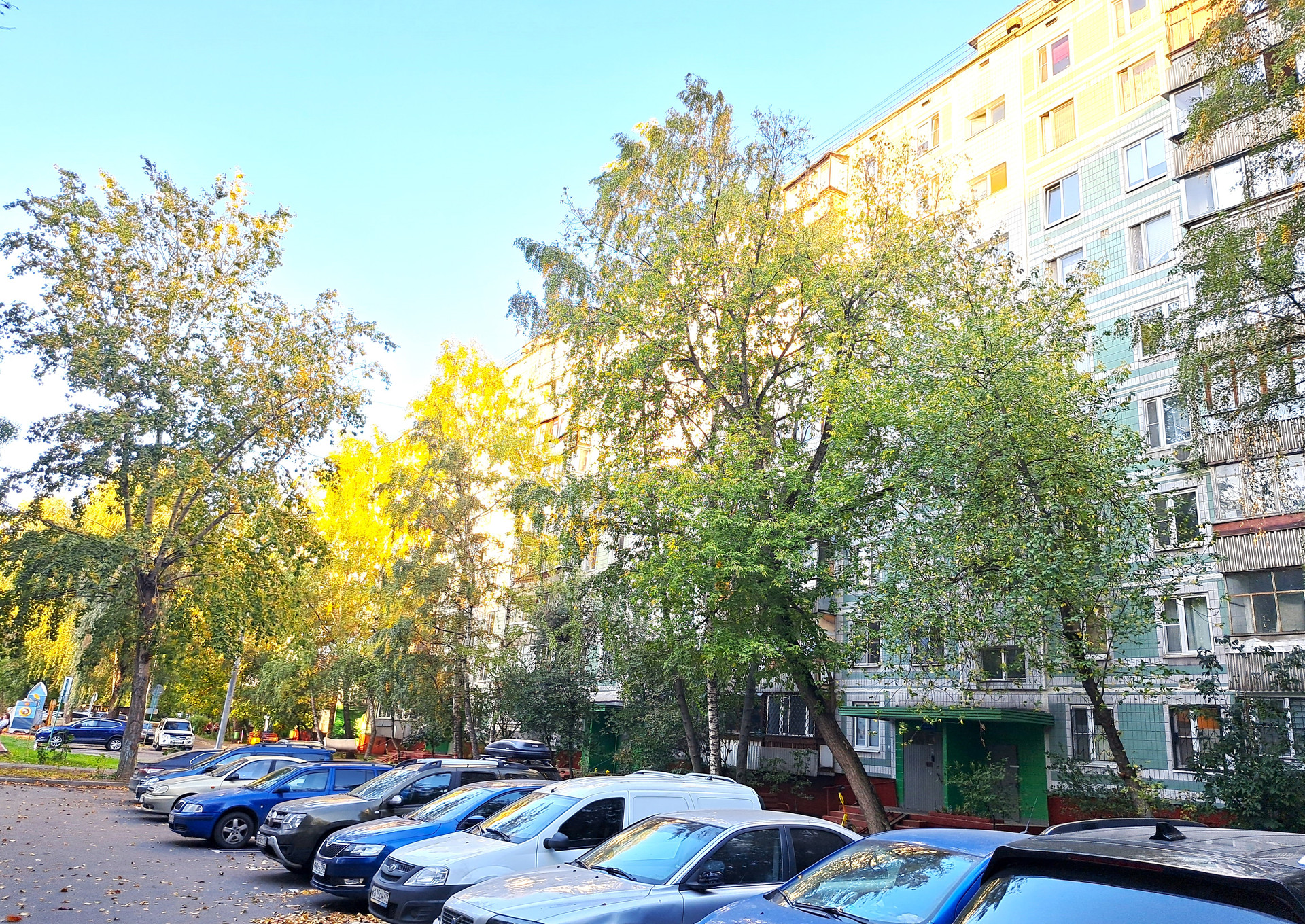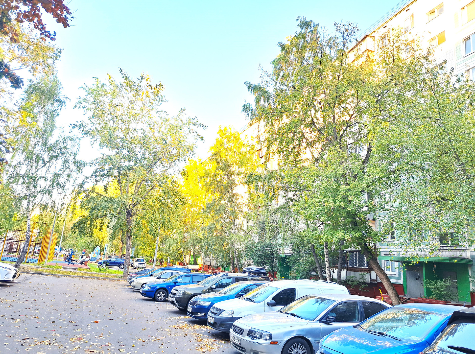 Стоянка для машин открытая во дворе.