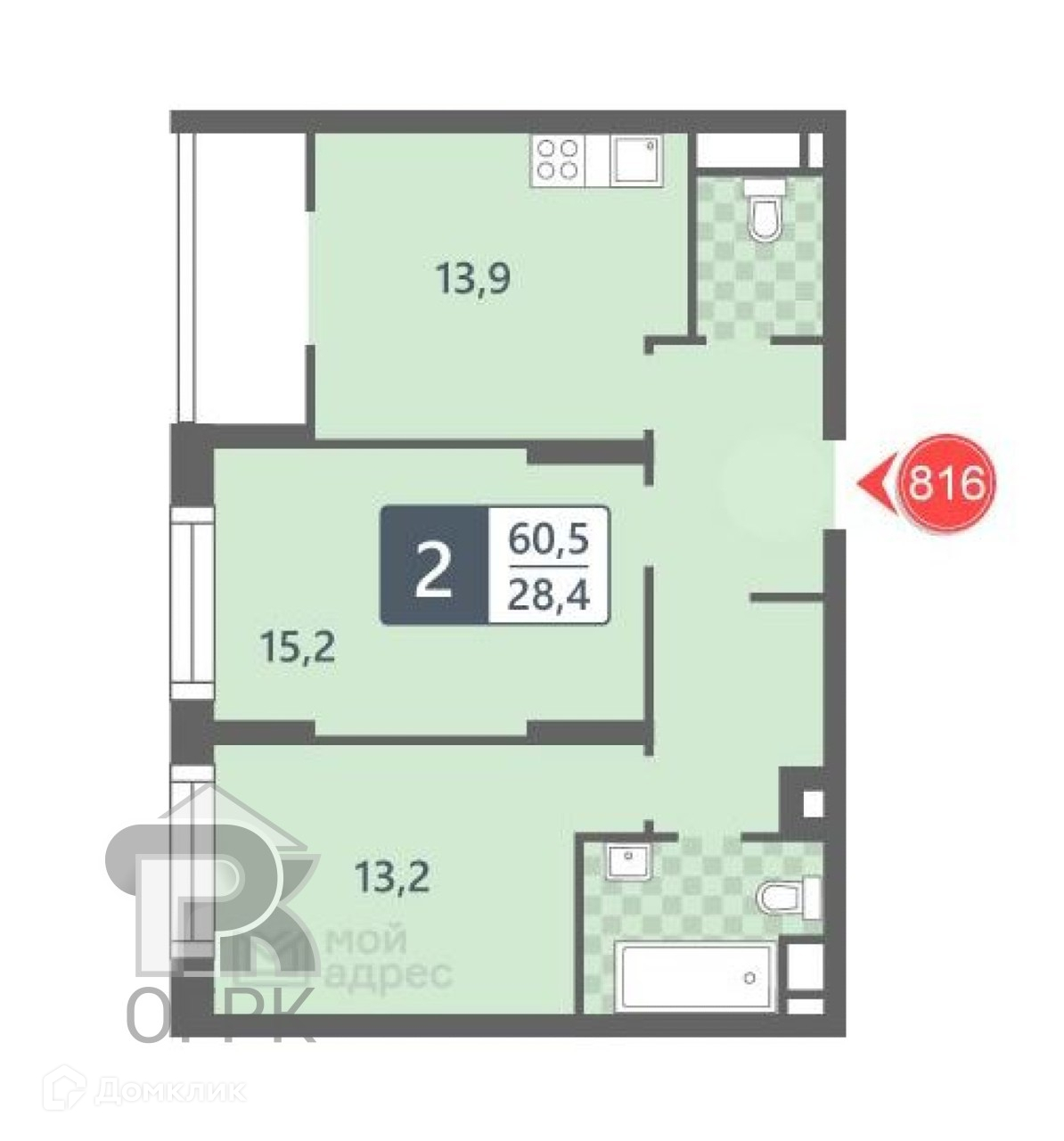 Жилая площадь 28.4 м2