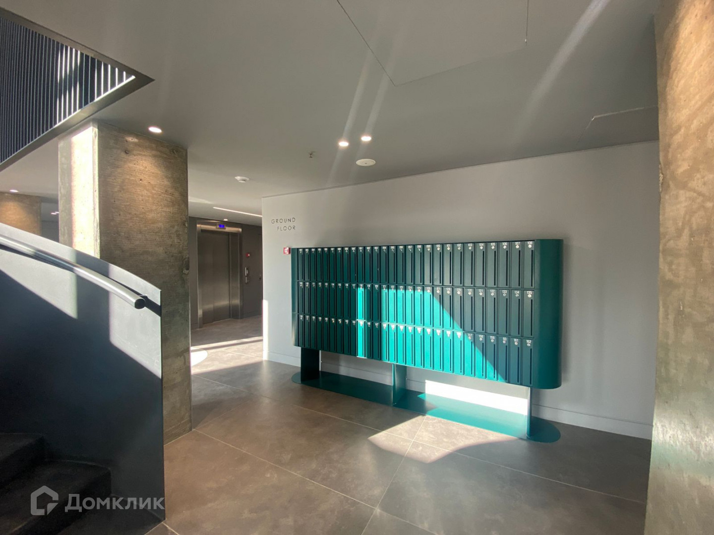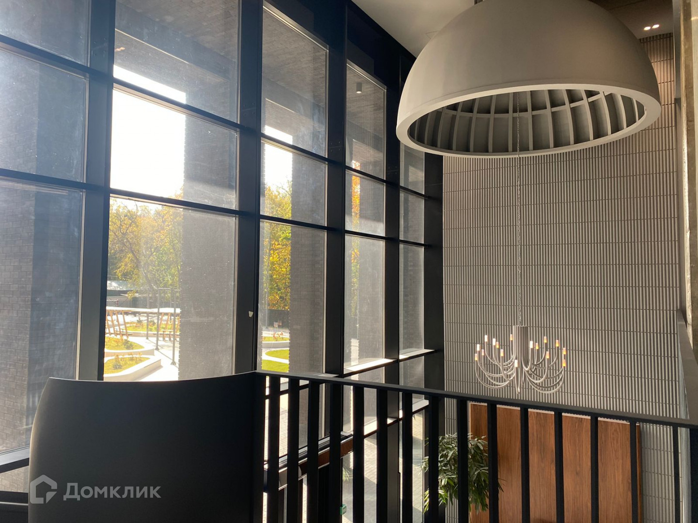 -двухуровневая Входная группа с панорамными окнами, зоной ресепшн и лаунж зоной с креслами и диванами. Есть подземный паркинг.