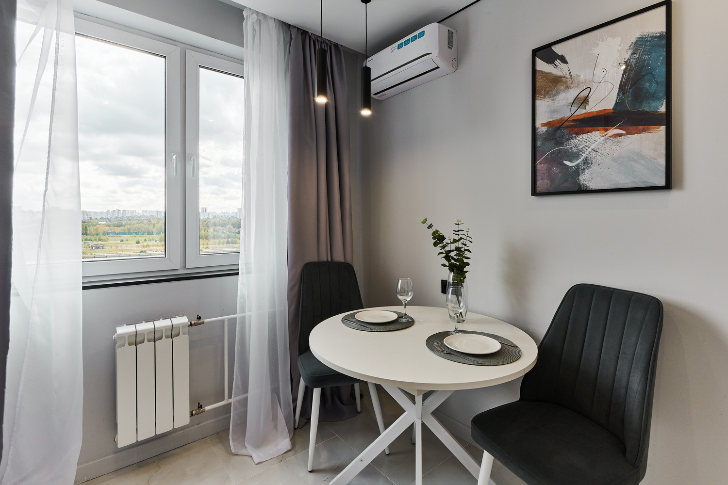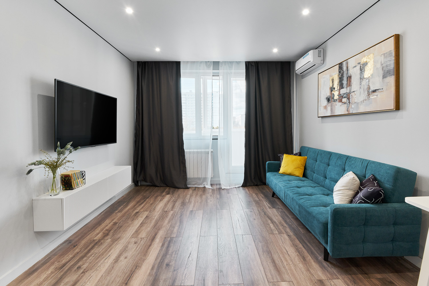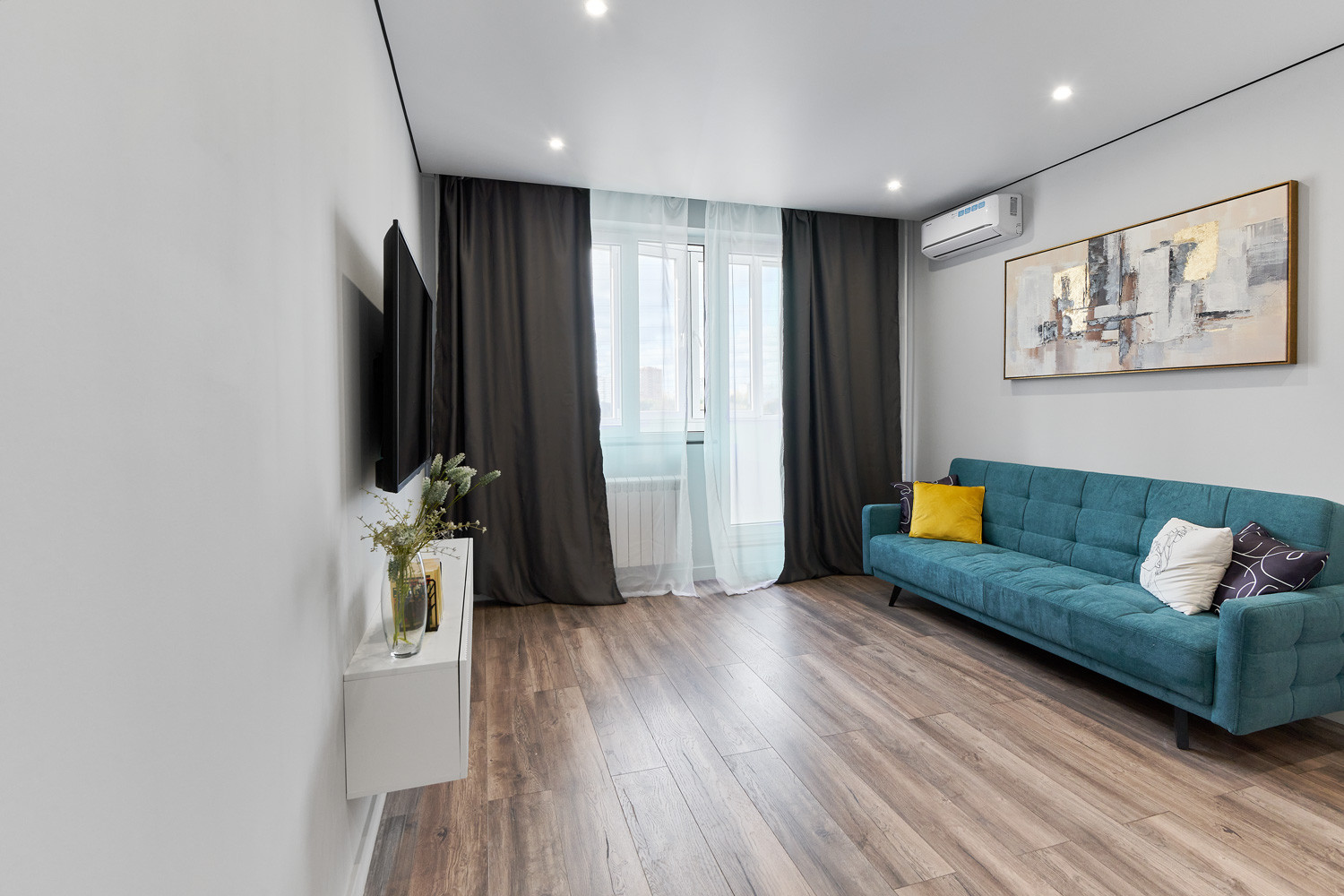 В ходе ремонта использованы качественные материалы и технологии. Полностью поменяли проводку, сантехнику, заменили радиаторы. Установлен качественный коллекторный узел с системой защиты от протечек и проточным водонагревателем. Мебель встроенная, в каждом помещении установлен кондиционер. Вся техника и мебель остается в квартире.