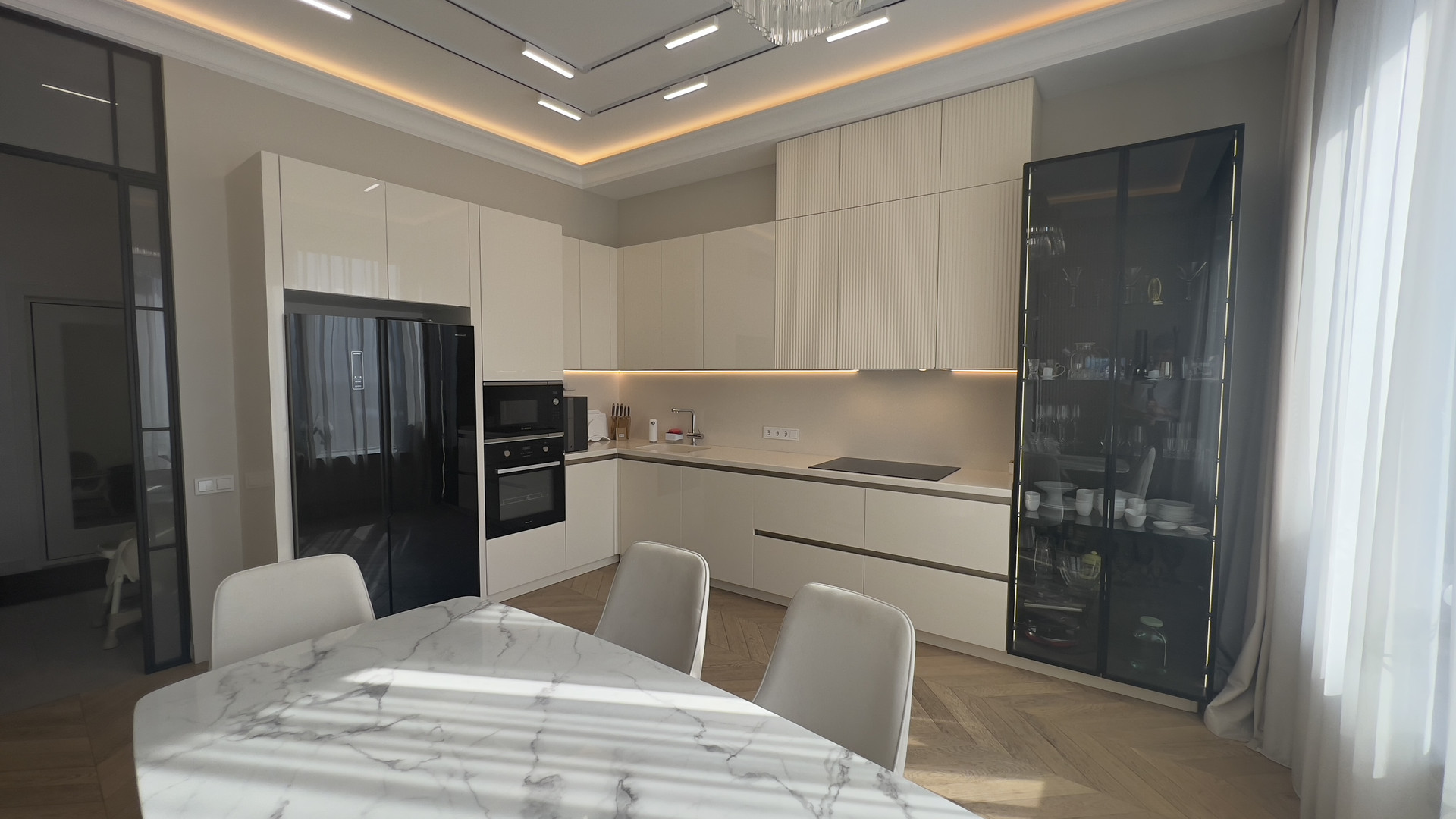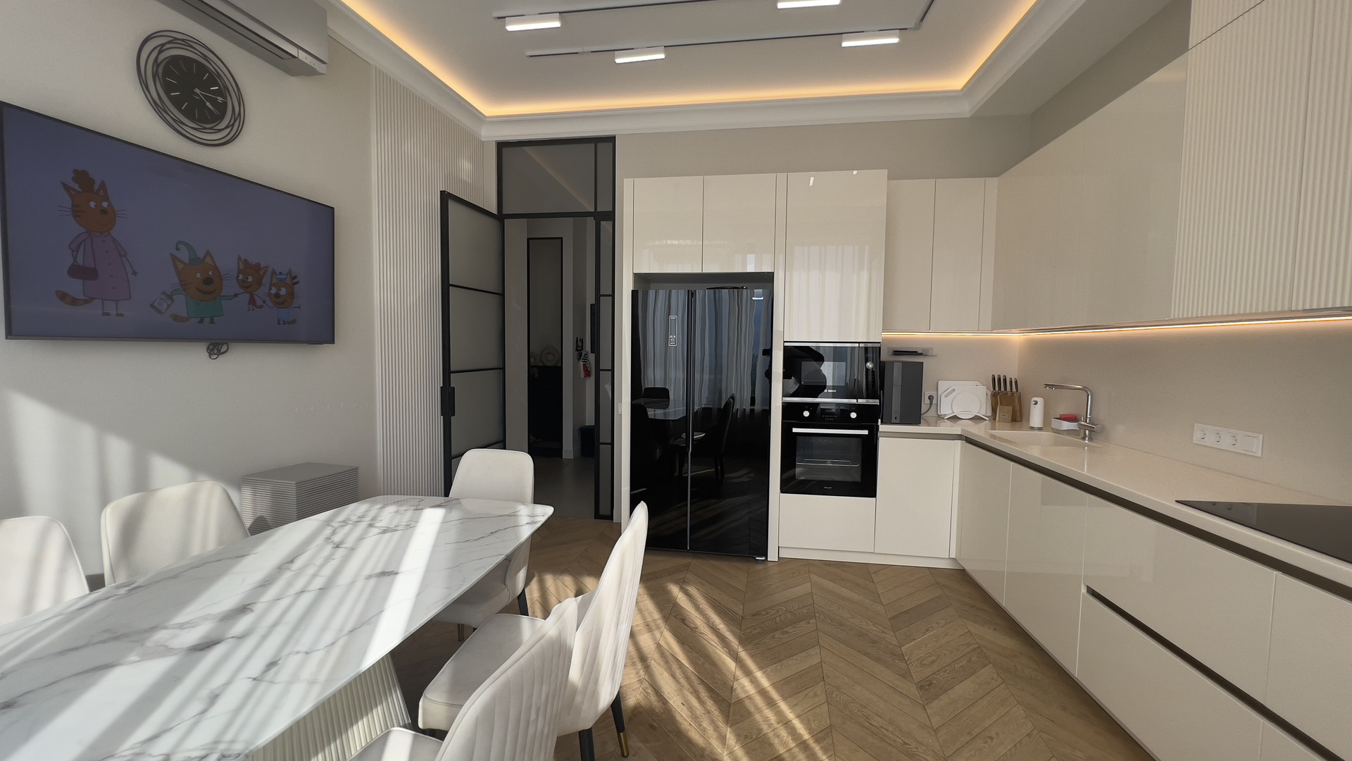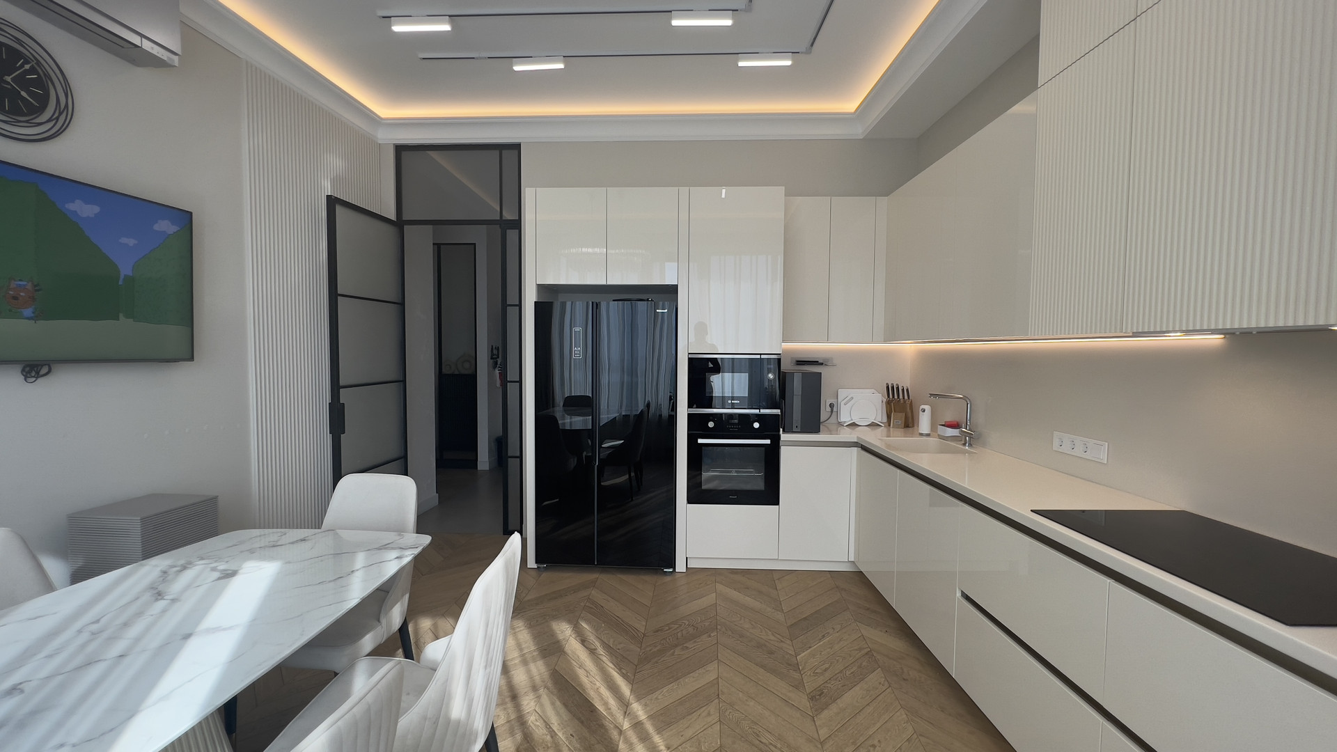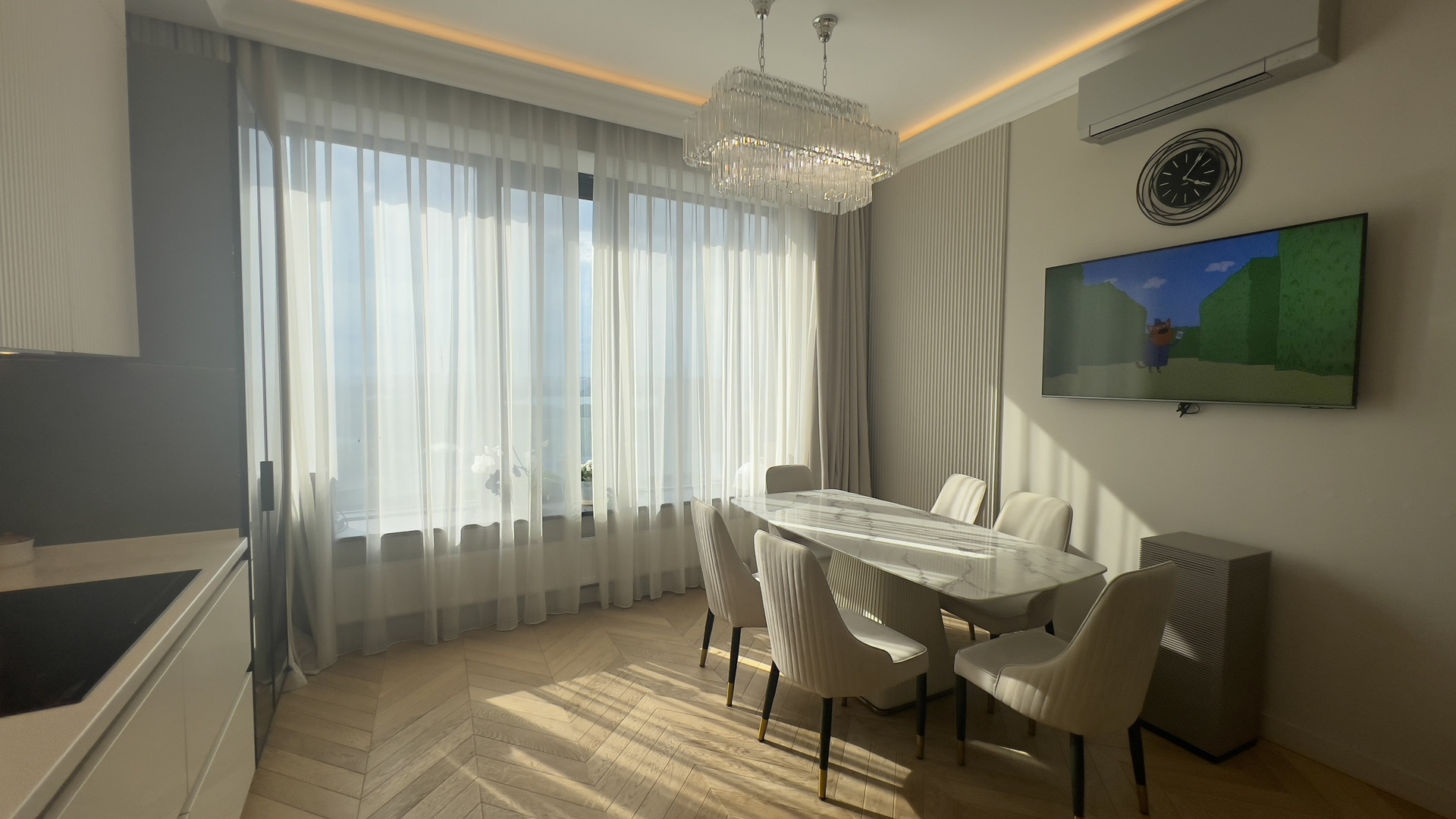 В квартире выполнен дизайнерский ремонт. В отделке использовались натуральные материалы. В стоимость входит вся необходимая техника, встроенная мебель и кухня.