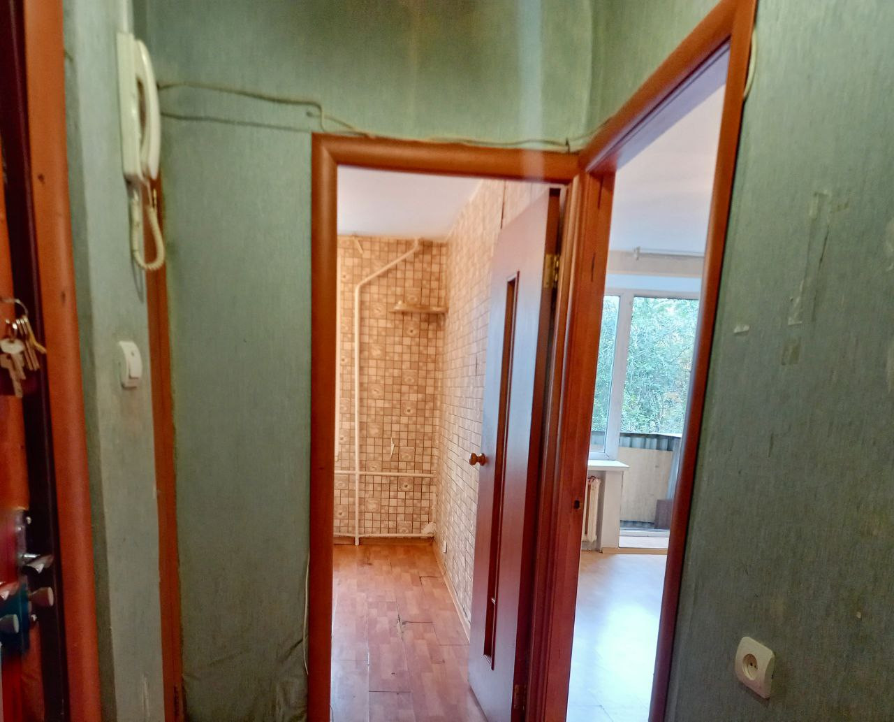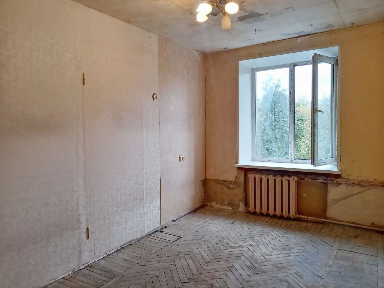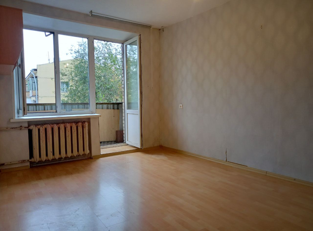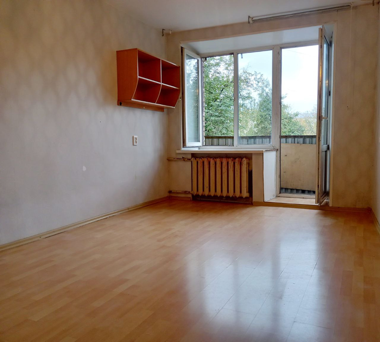 Квартира 43,1 квадратных метра, подготовлена к ремонту, вынесена вся мебель. Толстые внешние стены в 51 см из кирпича держат тепло зимой и прохладу летом. Сидя на балконе, можно любоваться закатным солнцем через крону ближайших деревьев.