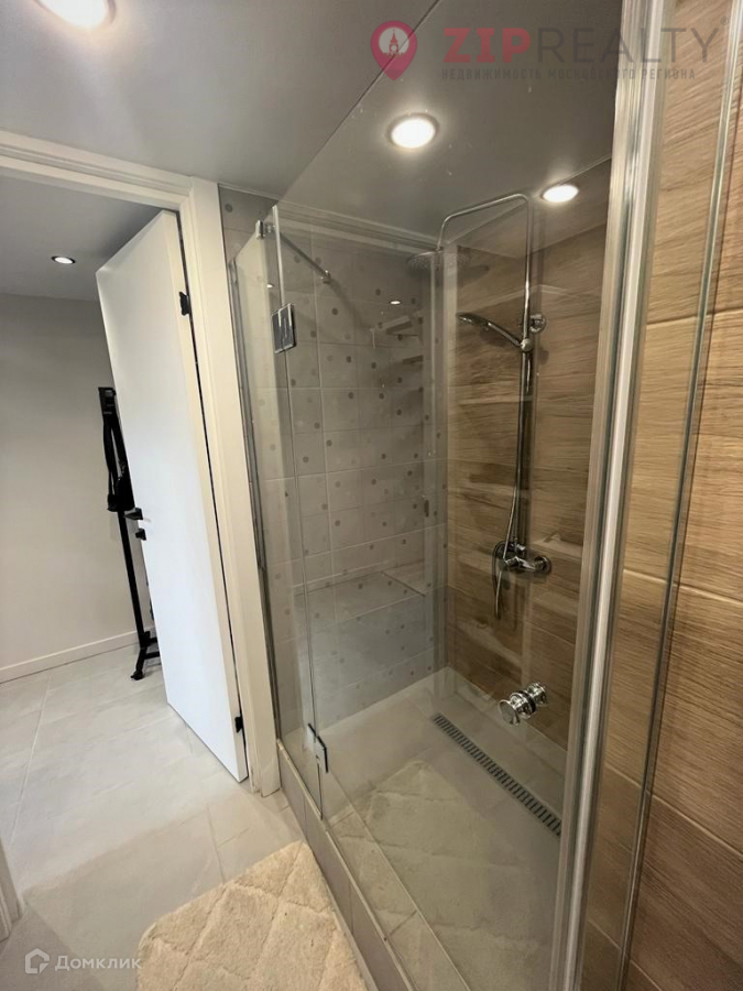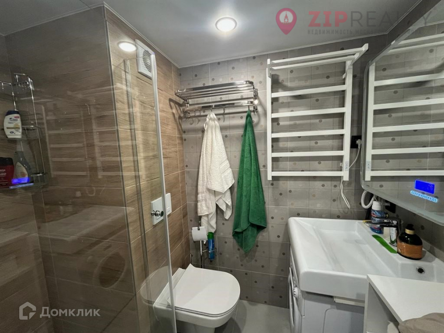 Санузел: душевая кабина из плитки, электрический полотенцесушитель, стиральная машина.