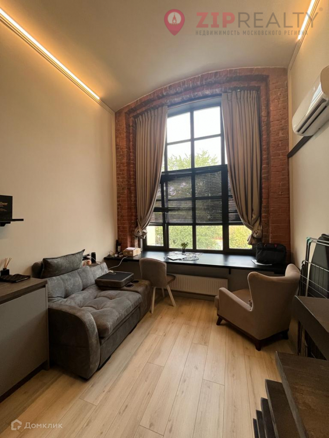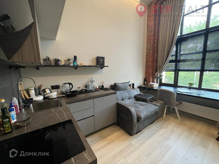 Отделка и наполнение максимально комфортны: ламинат и плитка, стены выдержаны в спокойных теплых тонах. Потолки натяжные. Привлекает внимание огромное панорамное окно, декорированное дизайнерскими шторами и жалюзи. На подоконнике установлена массивная столешница - идеальная рабочая зона. Часть стены сохраняет открытую кирпичную кладку, что придает студии особый колорит. Подключен кондиционер. На кухне: варочная поверхность, духовой шкаф, вытяжка, холодильник.
