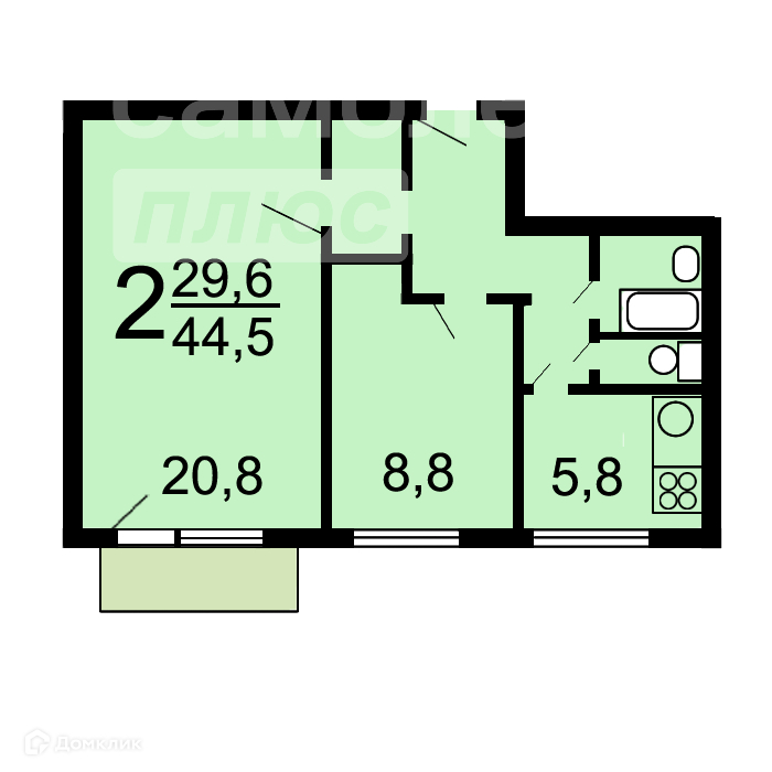 Жилая площадь 29.6 м2