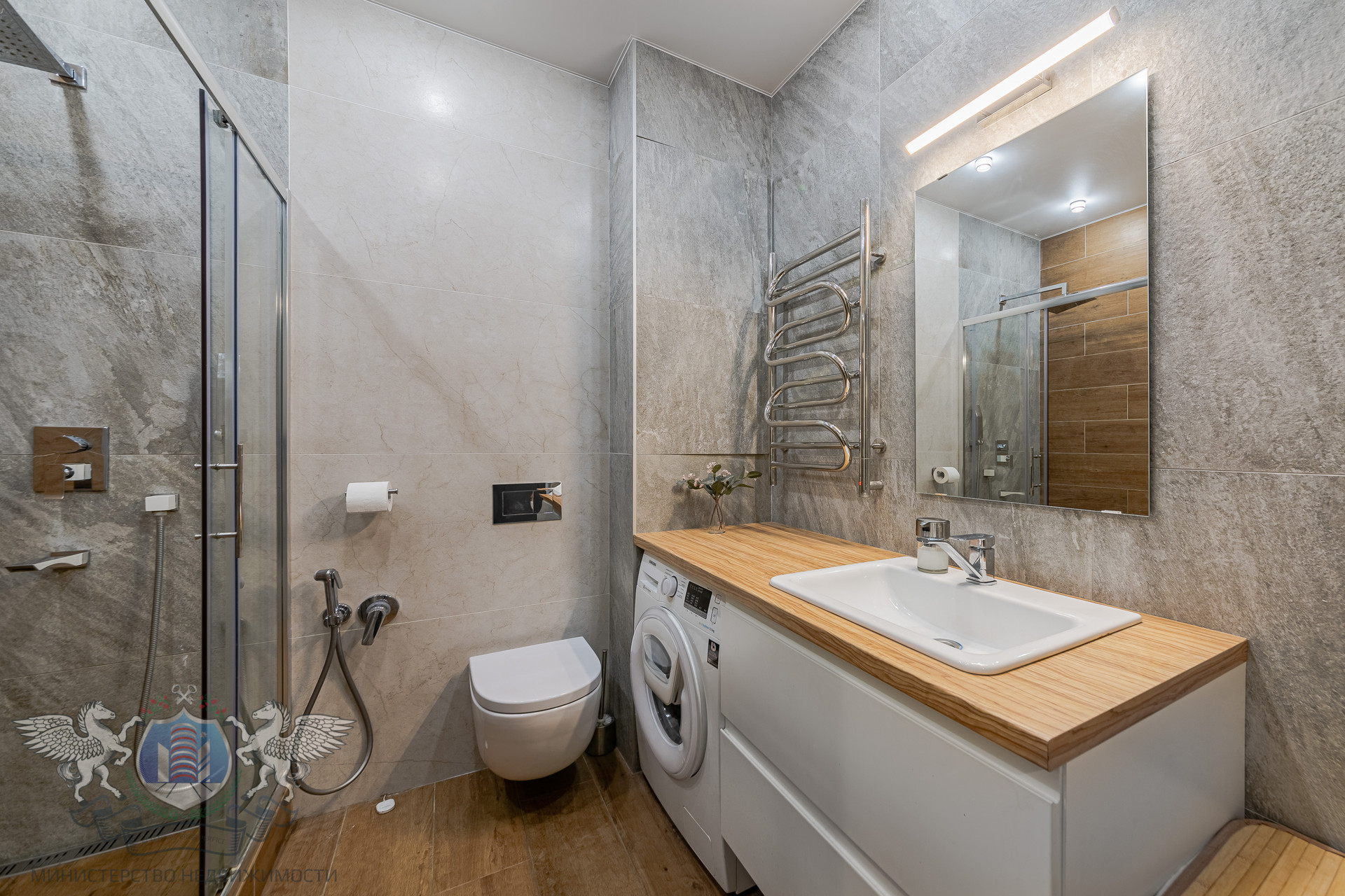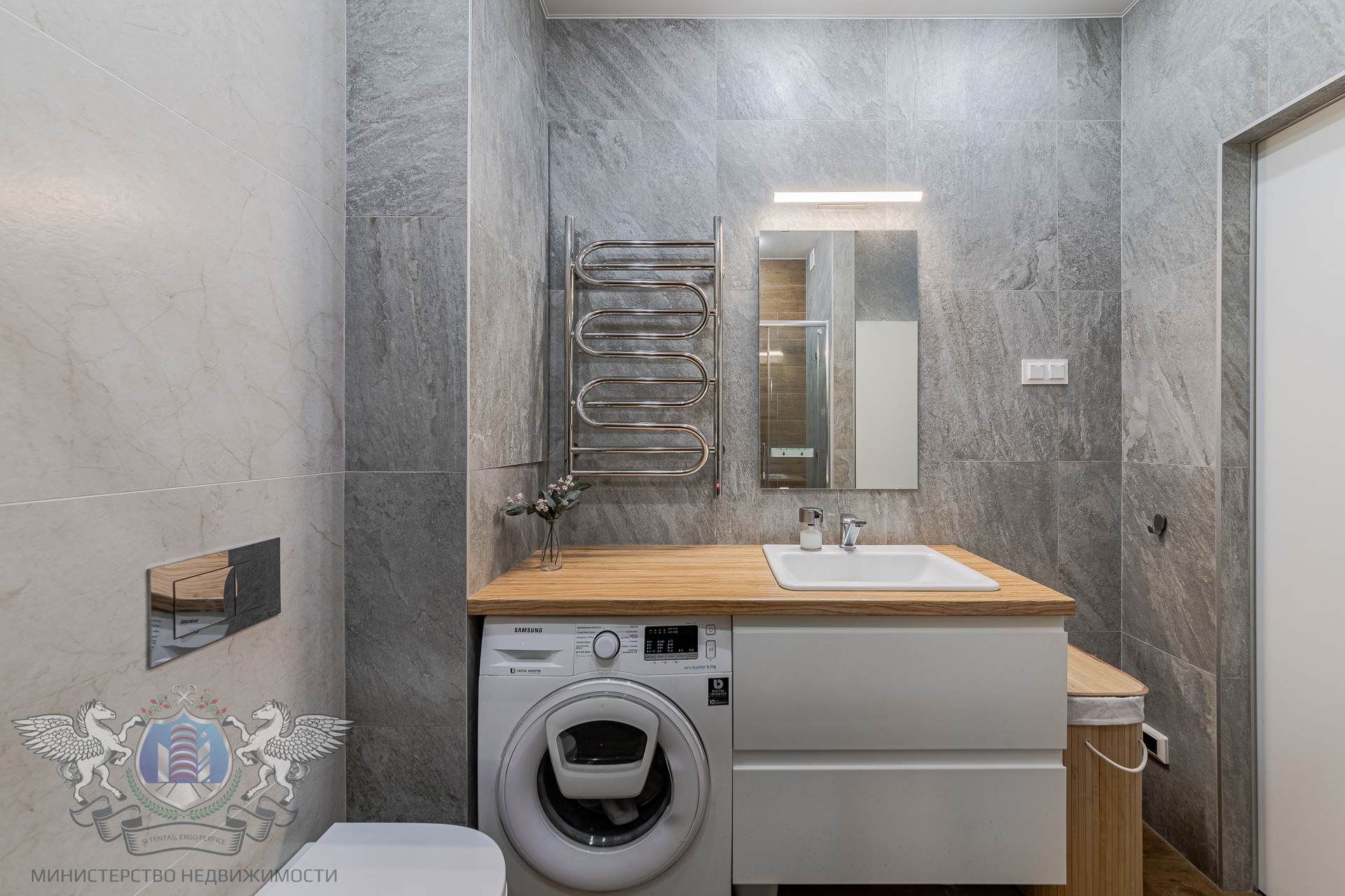 Ванная: душевая с тропической лейкой, стиральная машина Samsung, теплый пол, датчик протечек Нептун.