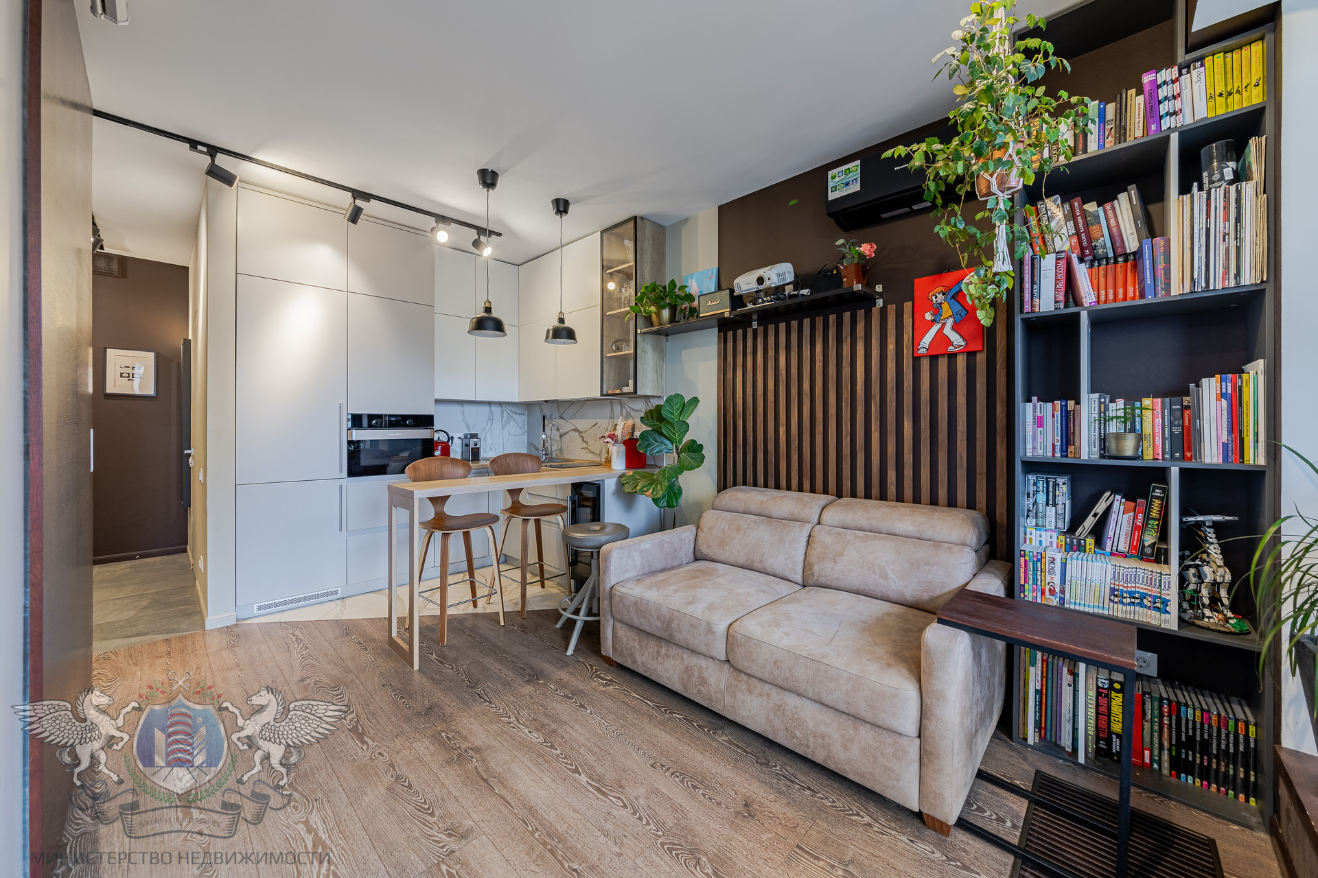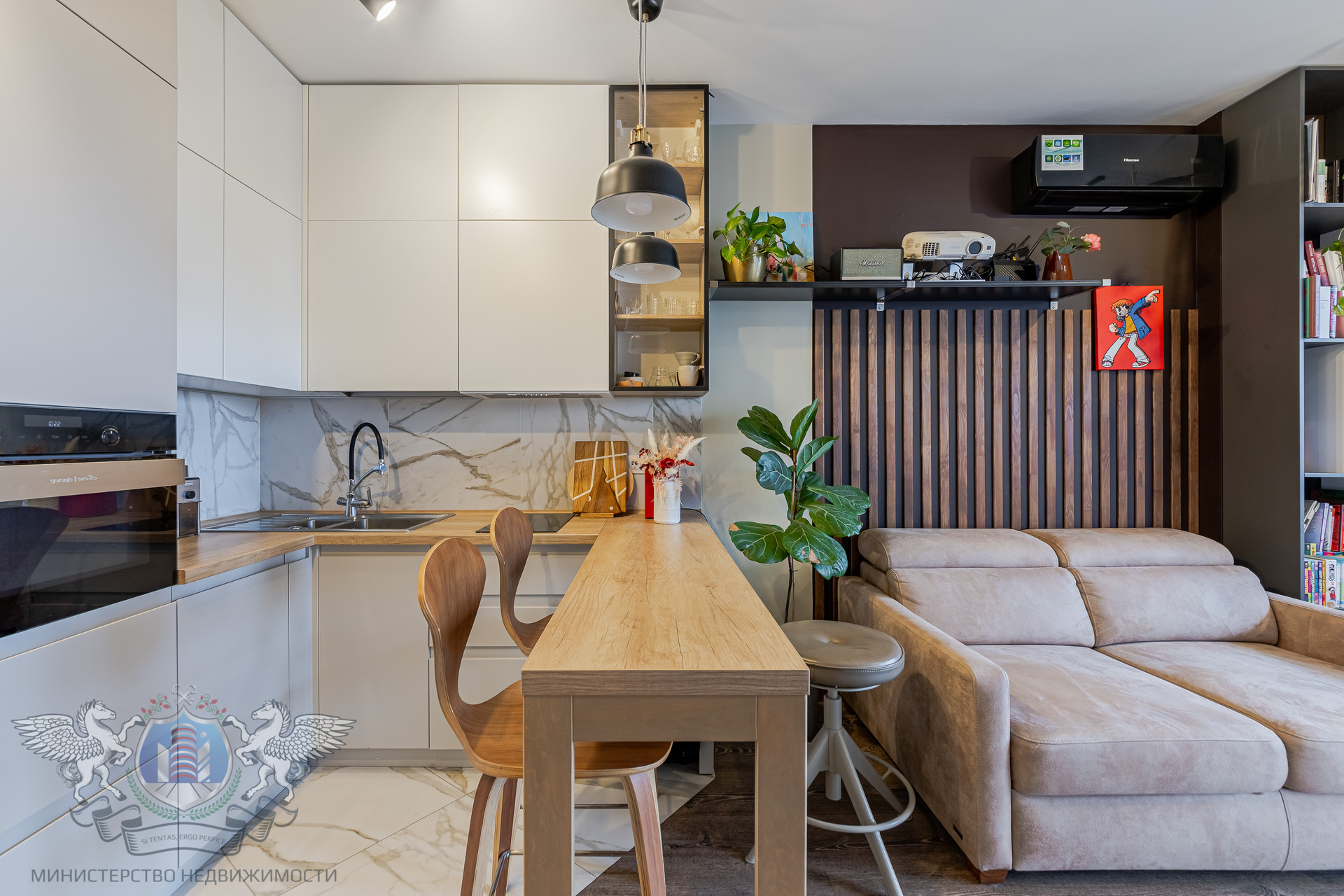 Кухня: со встроенным холодильником Ariston, духовым шкафом-микроволновкой Gorenje, посудомоечной машиной Ariston, варочной индукционной панелью и винным шкафом.