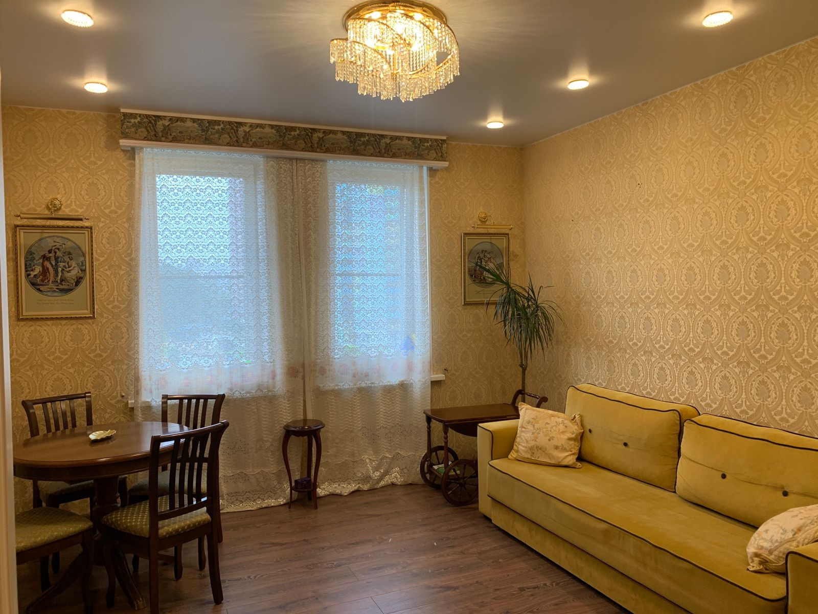 В комнате мебель из натурального дерева и большой раскладной диван.
