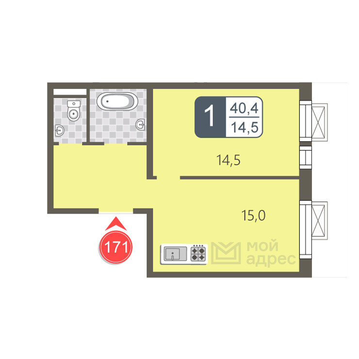 Общая площадь 40.4 м2