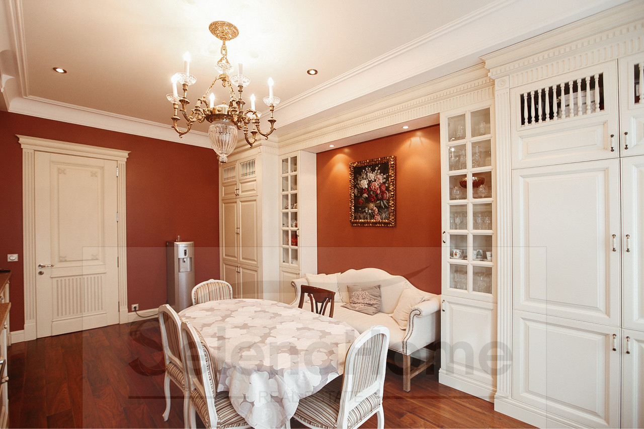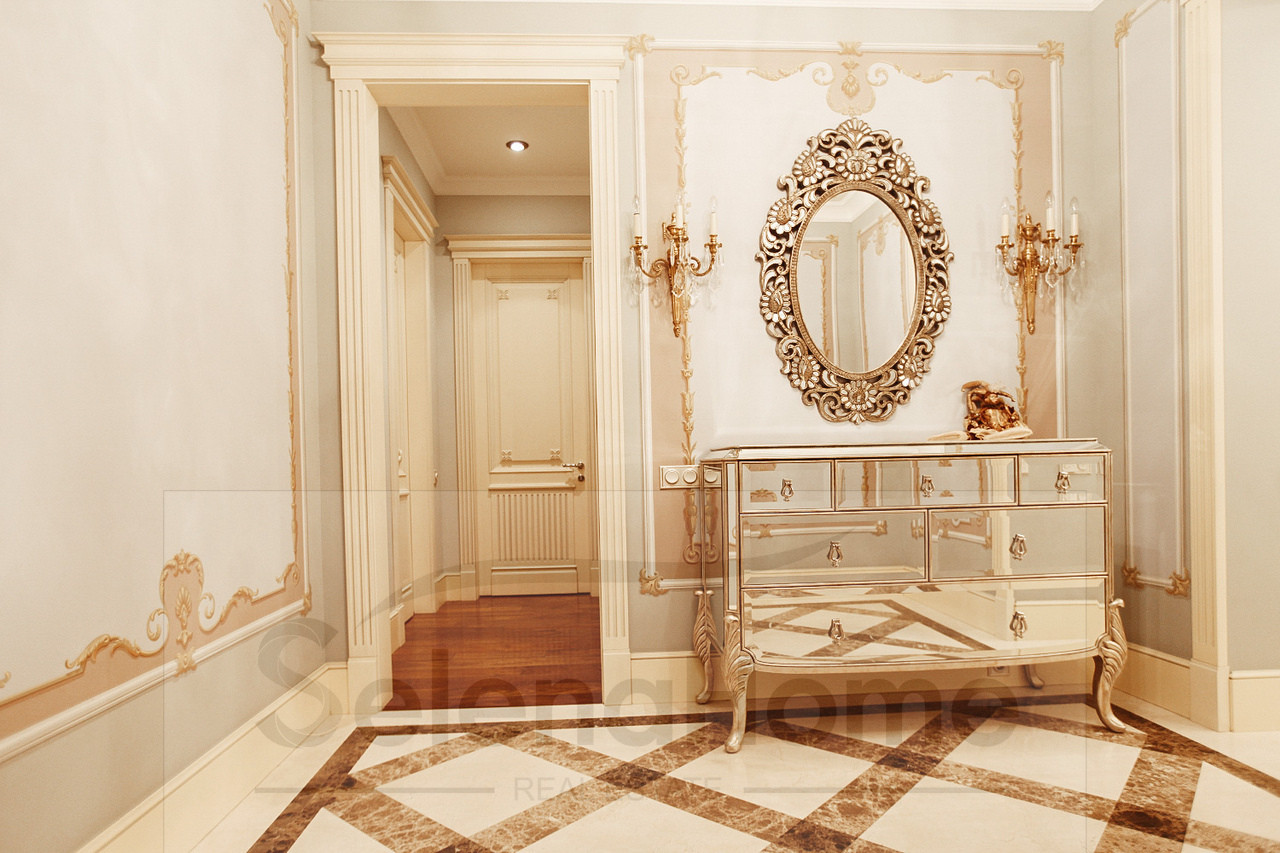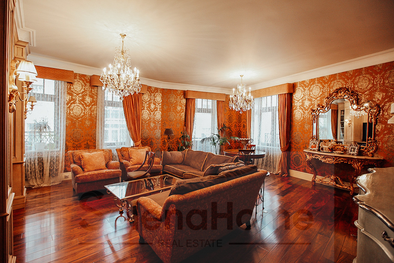 Клубный дом класса de luxe на 37 квартир. 3х сторонняя квартира. По планировке: прихожая, гардеробная, кухня-столовая 25 м2, гостиная 46 м2, две спальни с гардеробными комнатами и санузлами, две спальни с санузлами, гостевой санузел, постирочная, лоджия, балкон. Авторский дизайн-проект в классическом стиле. Укомплектована эксклюзивной итальянской мебелью и бытовой техникой. Два машиноместа в подземном паркинге включены в стоимость. Территория закрытая, по периметру и в здании видеонаблюдение и охрана.