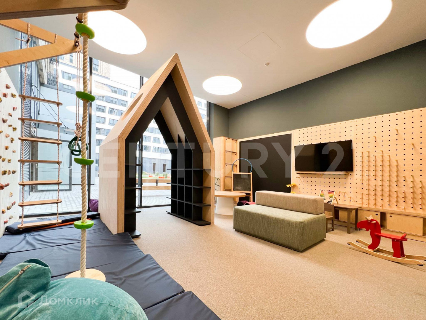 С внешней стороны дома расположен сквер со спортивными и игровыми площадками для детей разного возраста.