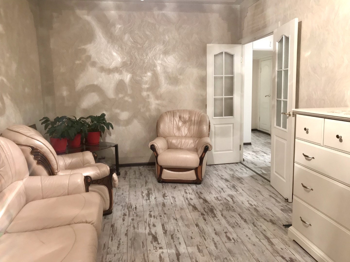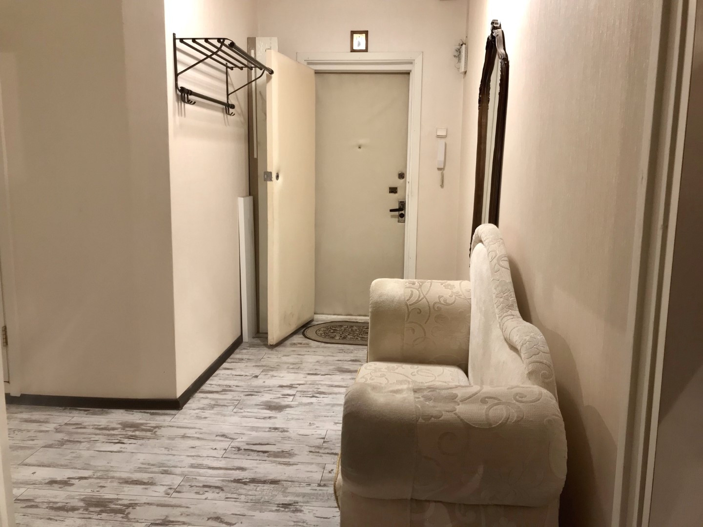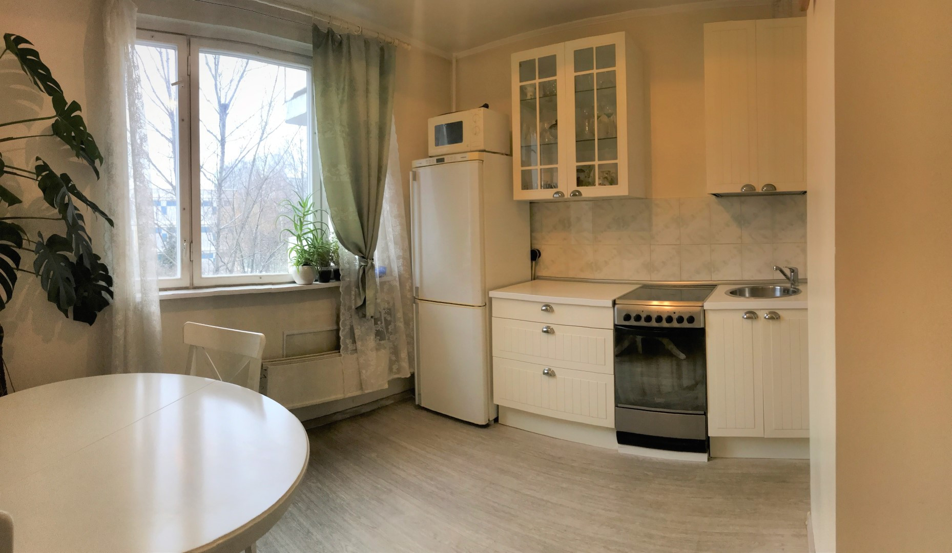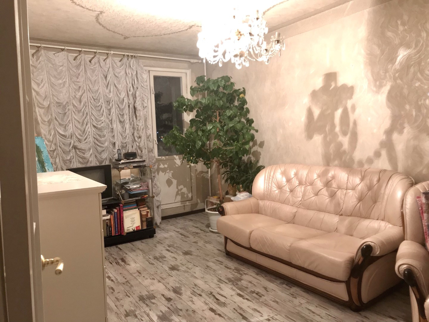 В квартире косметический ремонт (смотрите фото), пол кухни линолеум, остальные комнаты ламинат, санузел в кафеле, стеклопакеты только в маленькой комнате. Кухонная мебель, кондиционер в маленькой комнате, шкафы – все остается.
