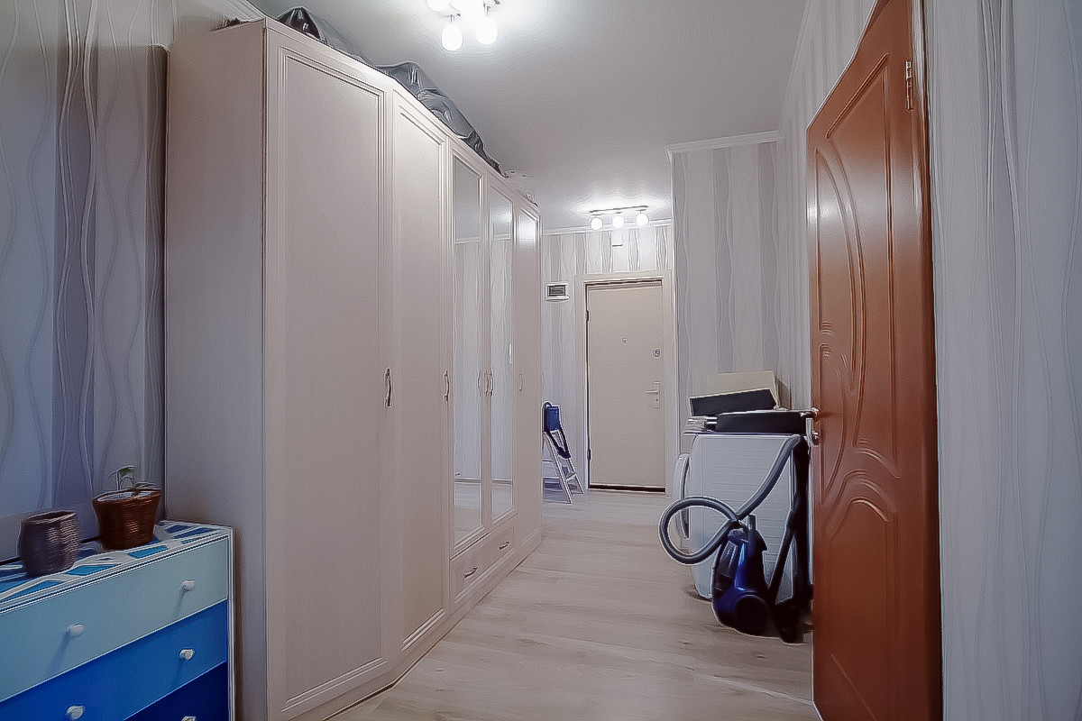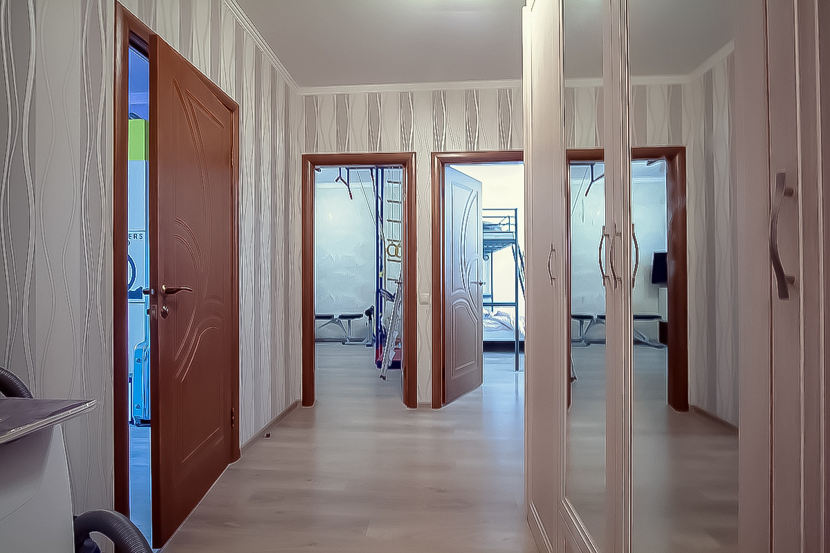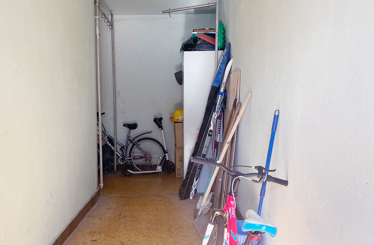 Просторный приквартирный тамбур в котором достаточно места для хранения велосипедов, лыж и прочего снаряжения. Приятные соседи.