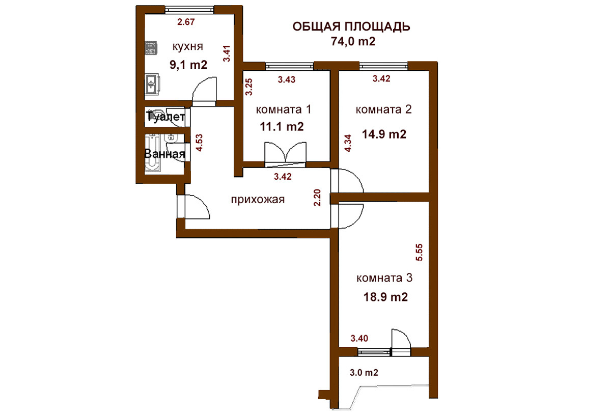 Просторная 3-х комнатная квартира Общей площадью 74 кв.м. без учета площади застекленной и утепленной лоджии площадью 3,2 кв.м.