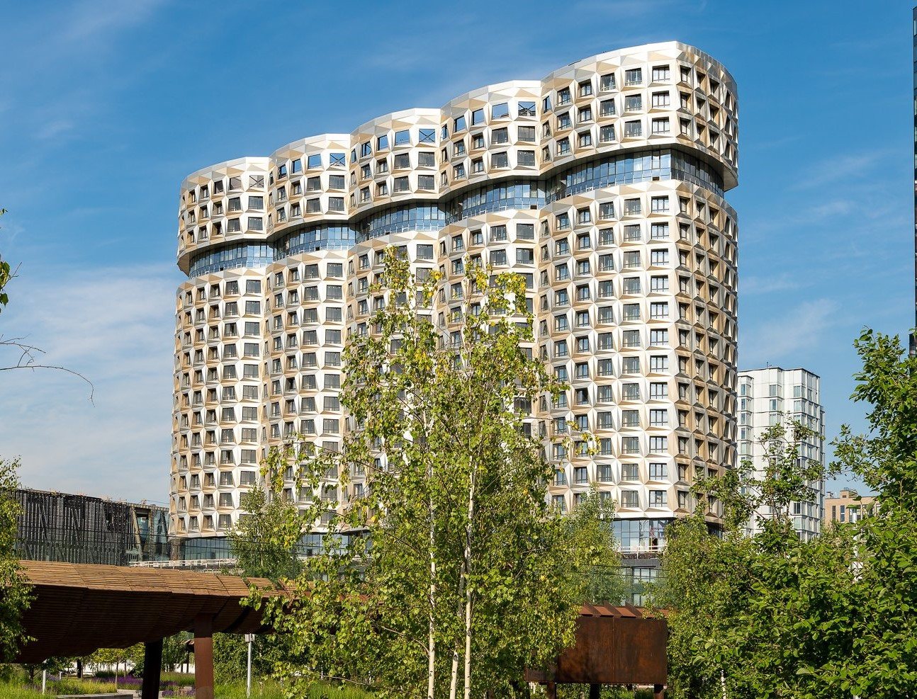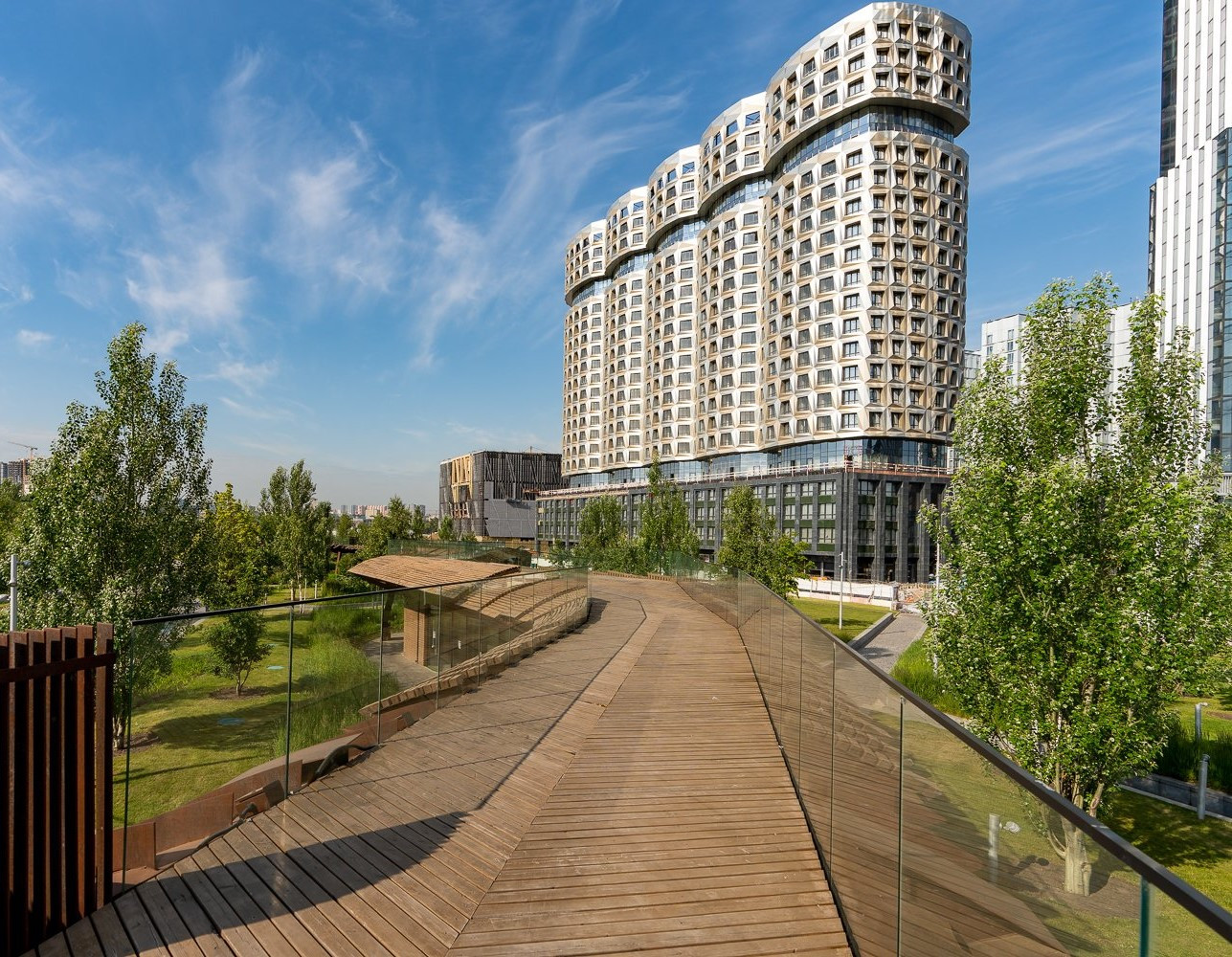 ПРЕИМУЩЕСТВА - звёздный состав российских и зарубежных архитекторов - создателей комплекса, авторский дизайн входных групп, дворы без машин, сигнализация, системы видео наблюдения и электронный доступ, многоуровневые подземные паркинги под каждым домом, + паркинг для гостей района, многообразие планировок, расположение жилых домов в тихой уютной части комплекса, панорамное остекление - окна в пол (стеклопакеты Schukо (пр-ва Германия)), часть кв-р, на верхних этажах зданий с возможностью установки каминов, окнами выходящими на набережную Москва-реки, бульвар, парк
