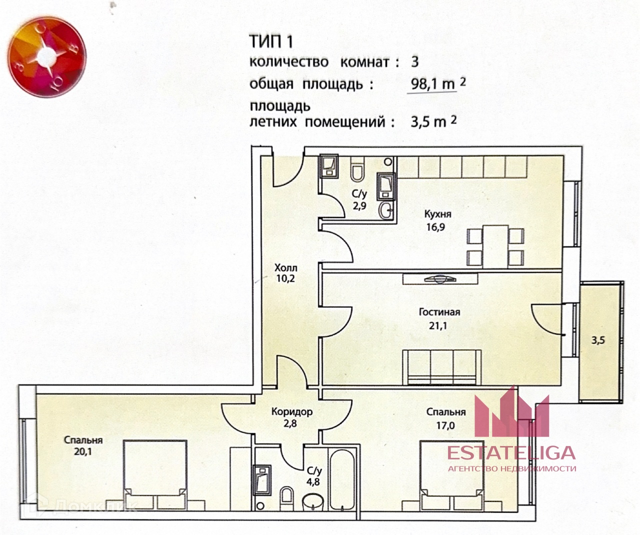 Количество комнат 3