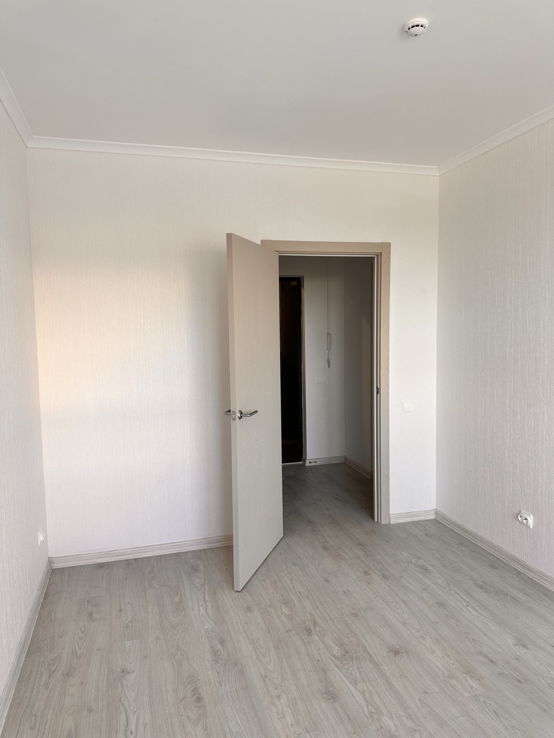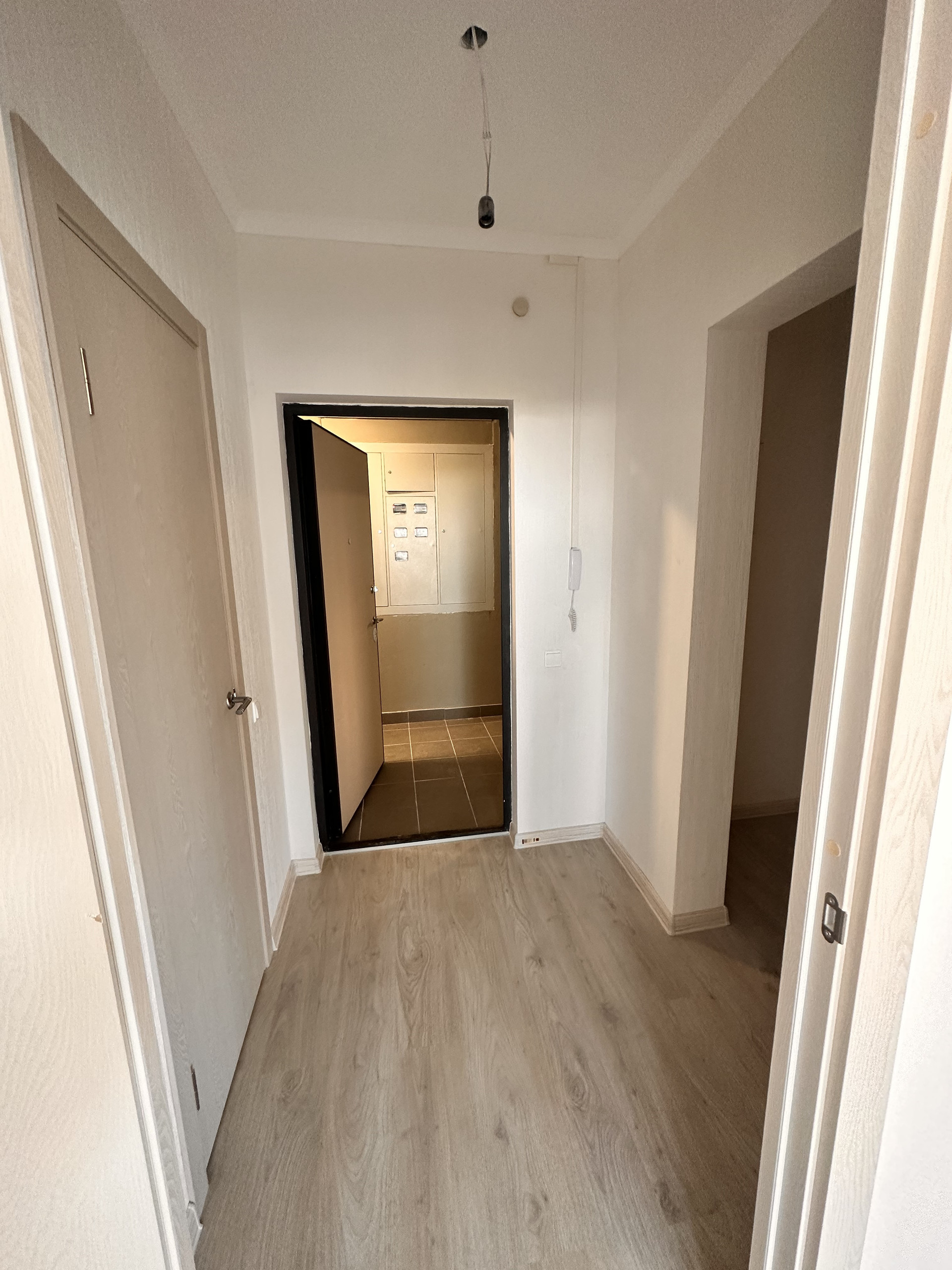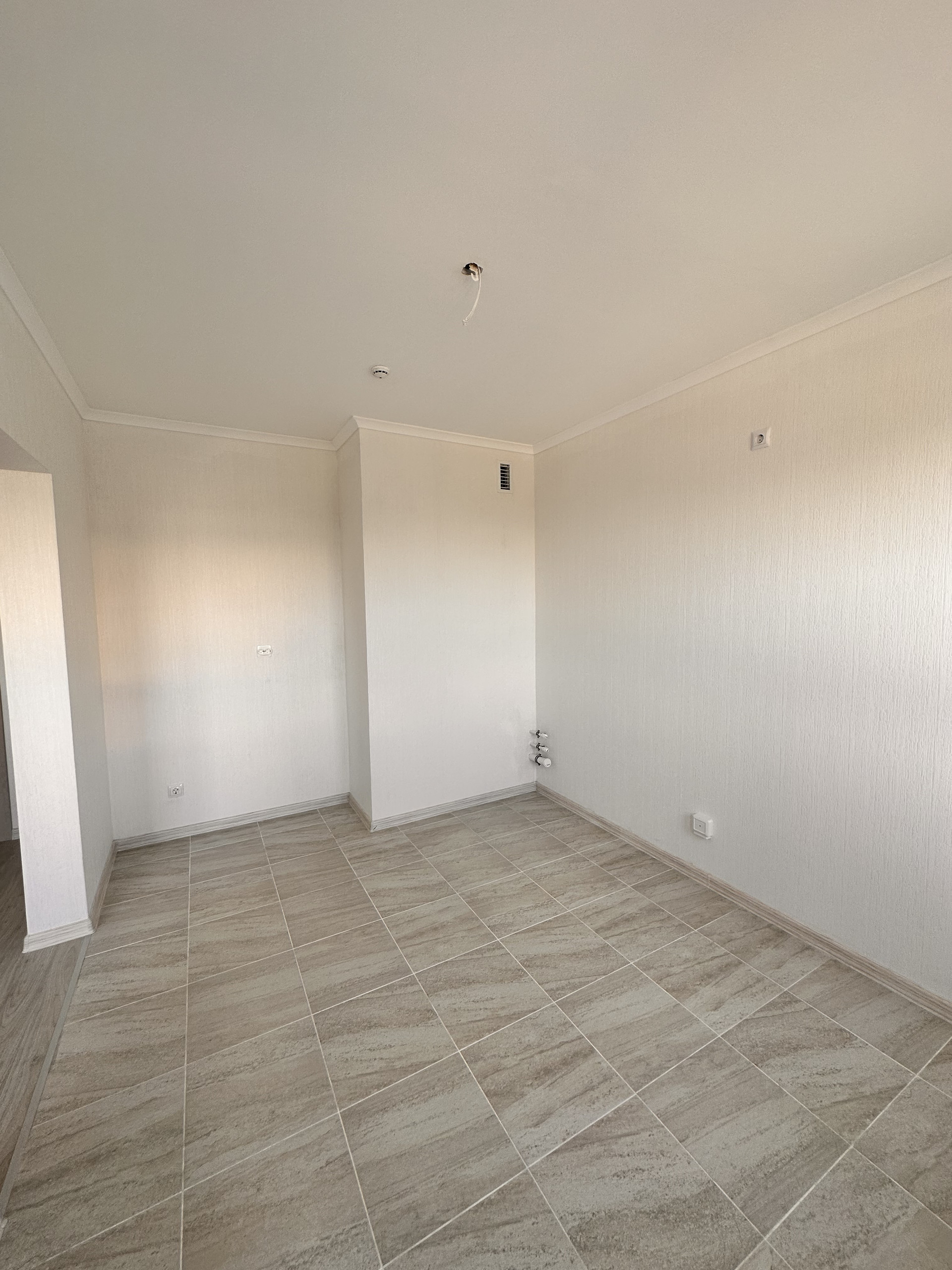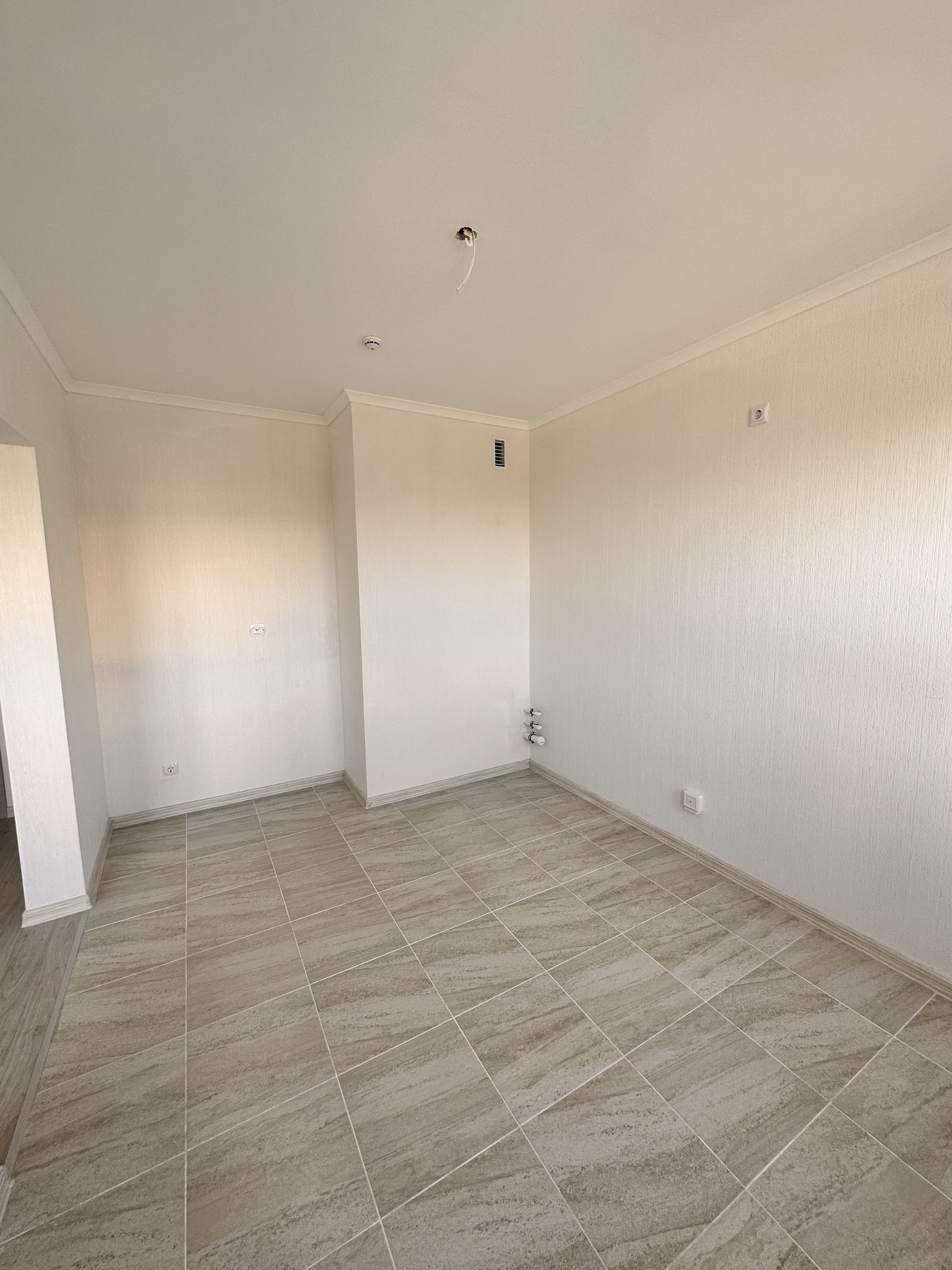 При желании комнату и кухню можно изолировать. На стенах обои, на полу плитка Керама Мараци и ламинат. Отделка в светлых тонах. Все готово, можно завозить мебель и жить.