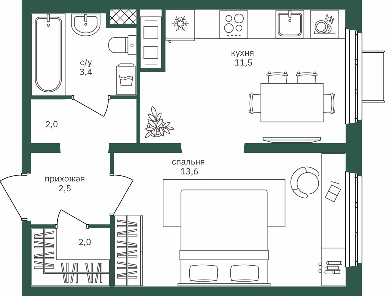 Евро планировка: без балкона, комната-спальня - 14 кв.м., кухня-гостиная - 11,5 кв.м., отдельная гардеробная, санузел совмещённый, просторная прихожая.