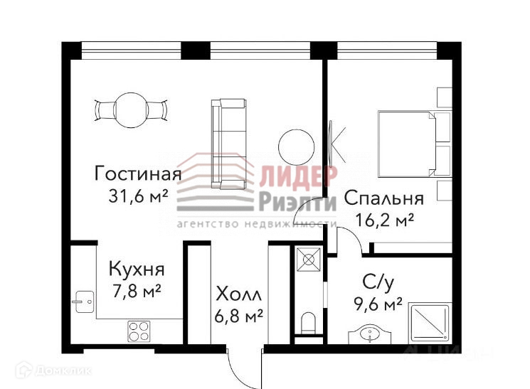 Жилая площадь 47.8 м2
