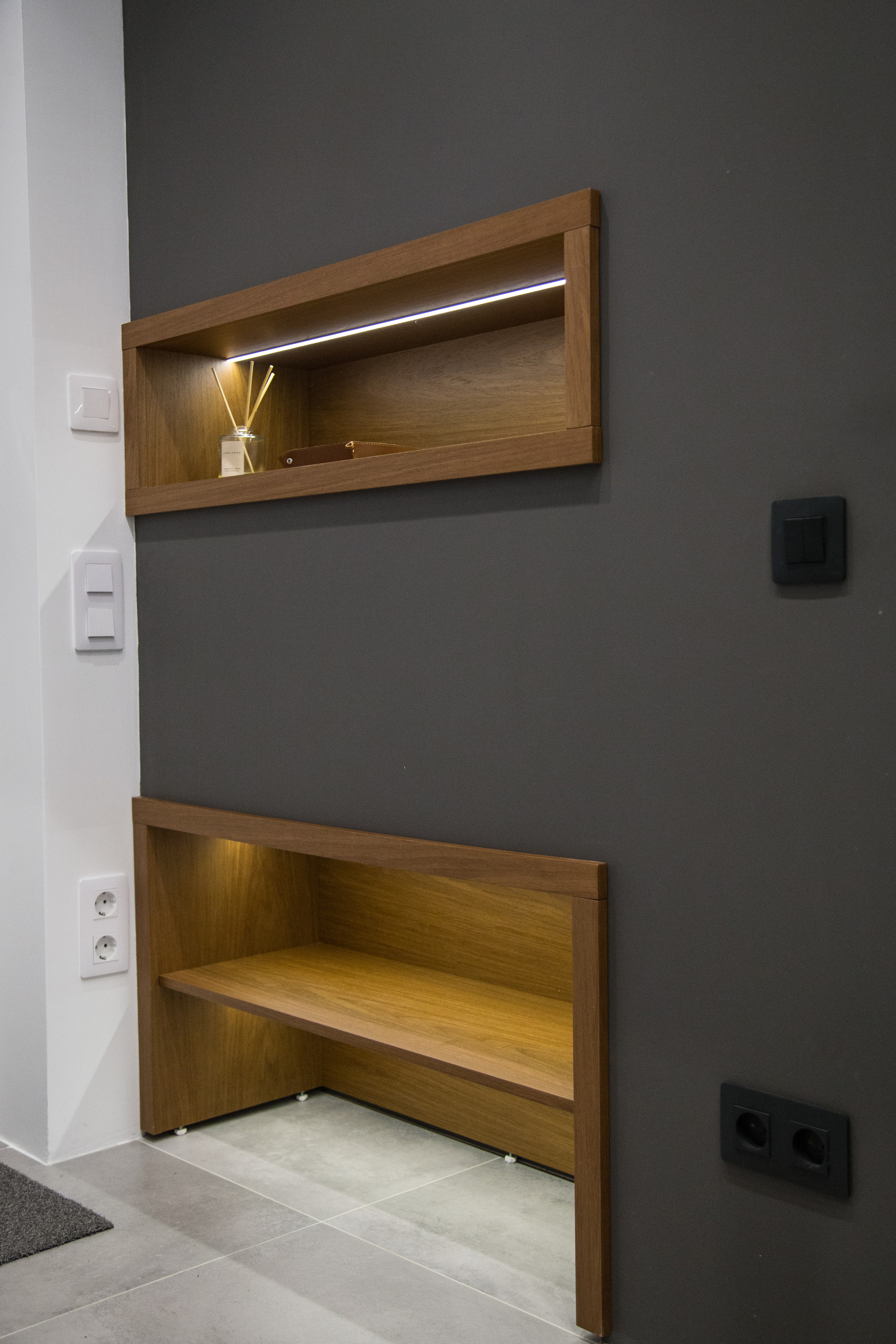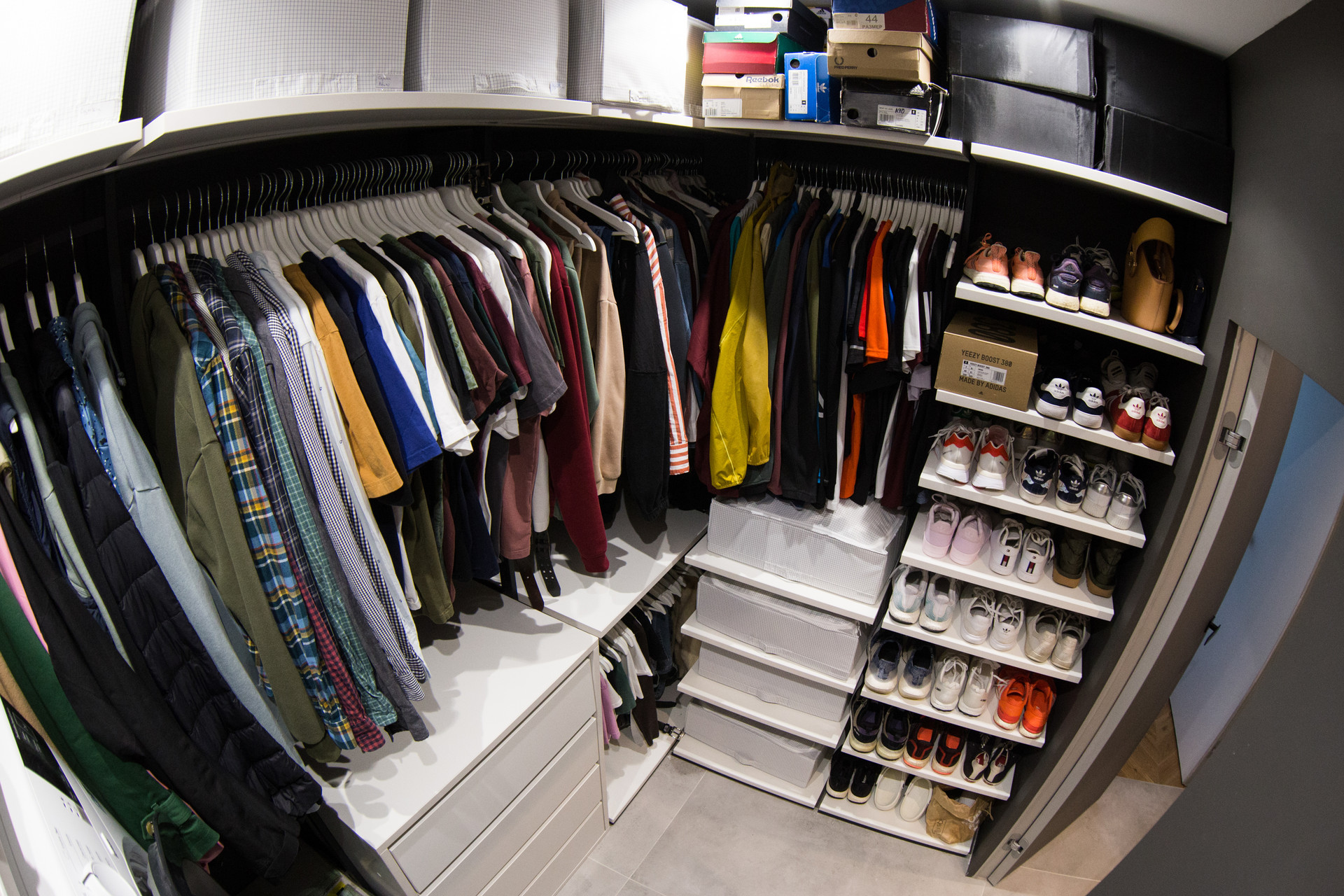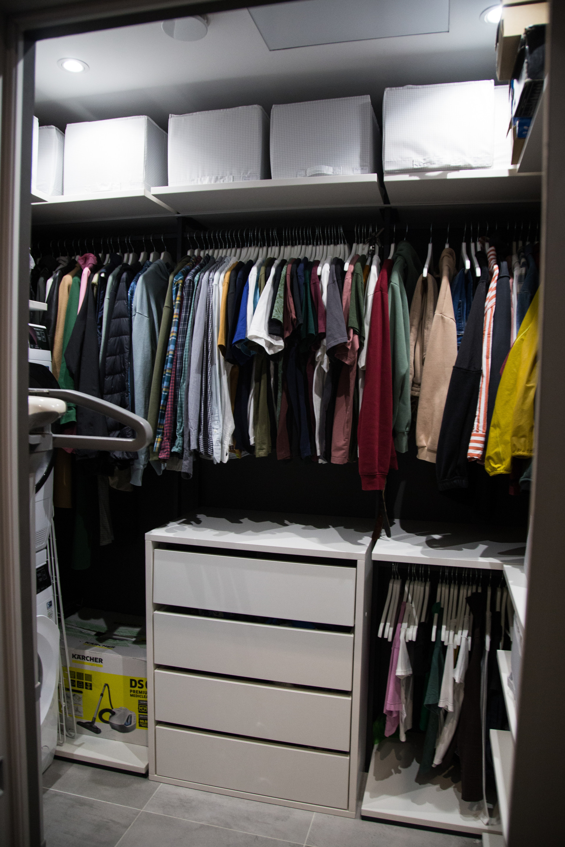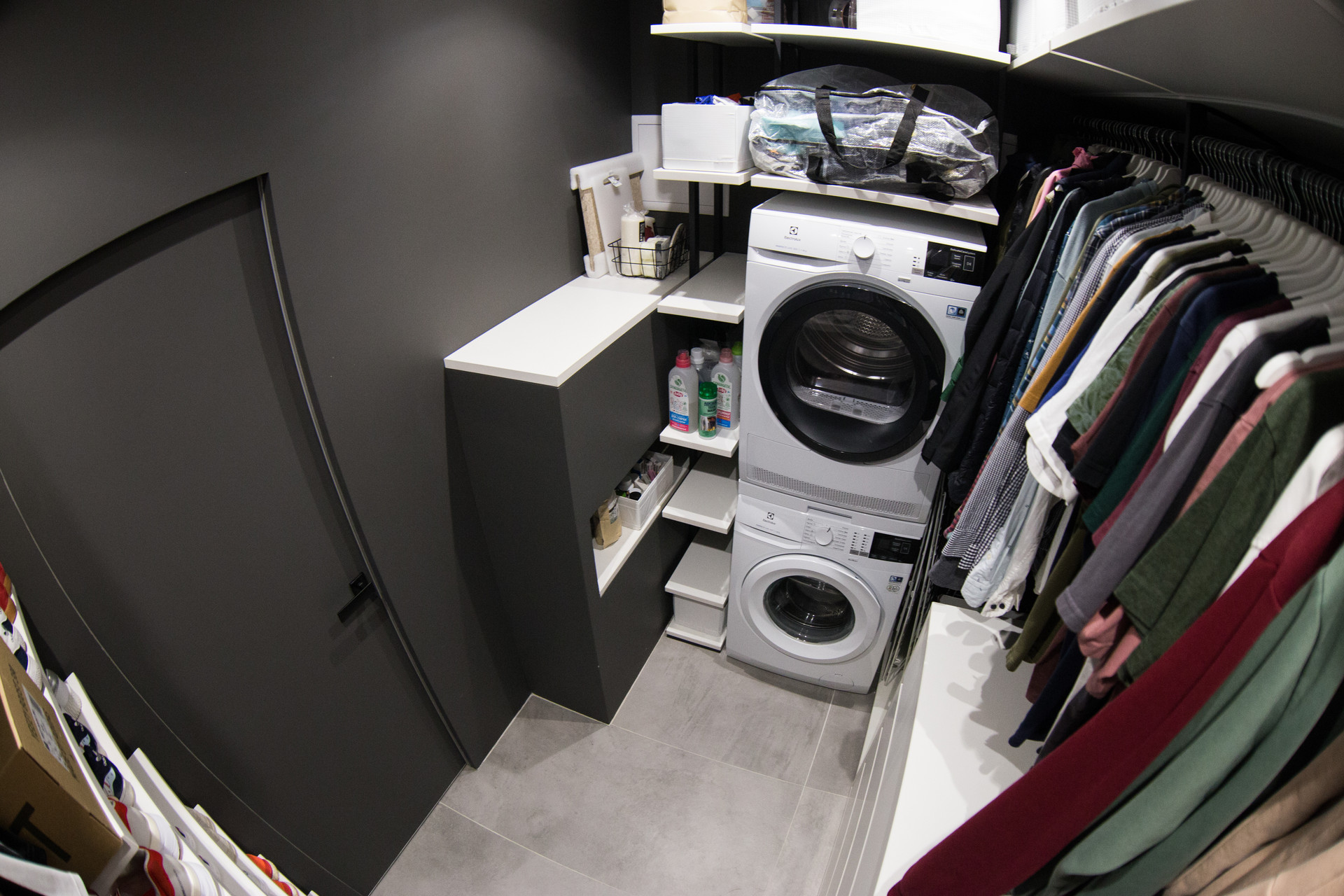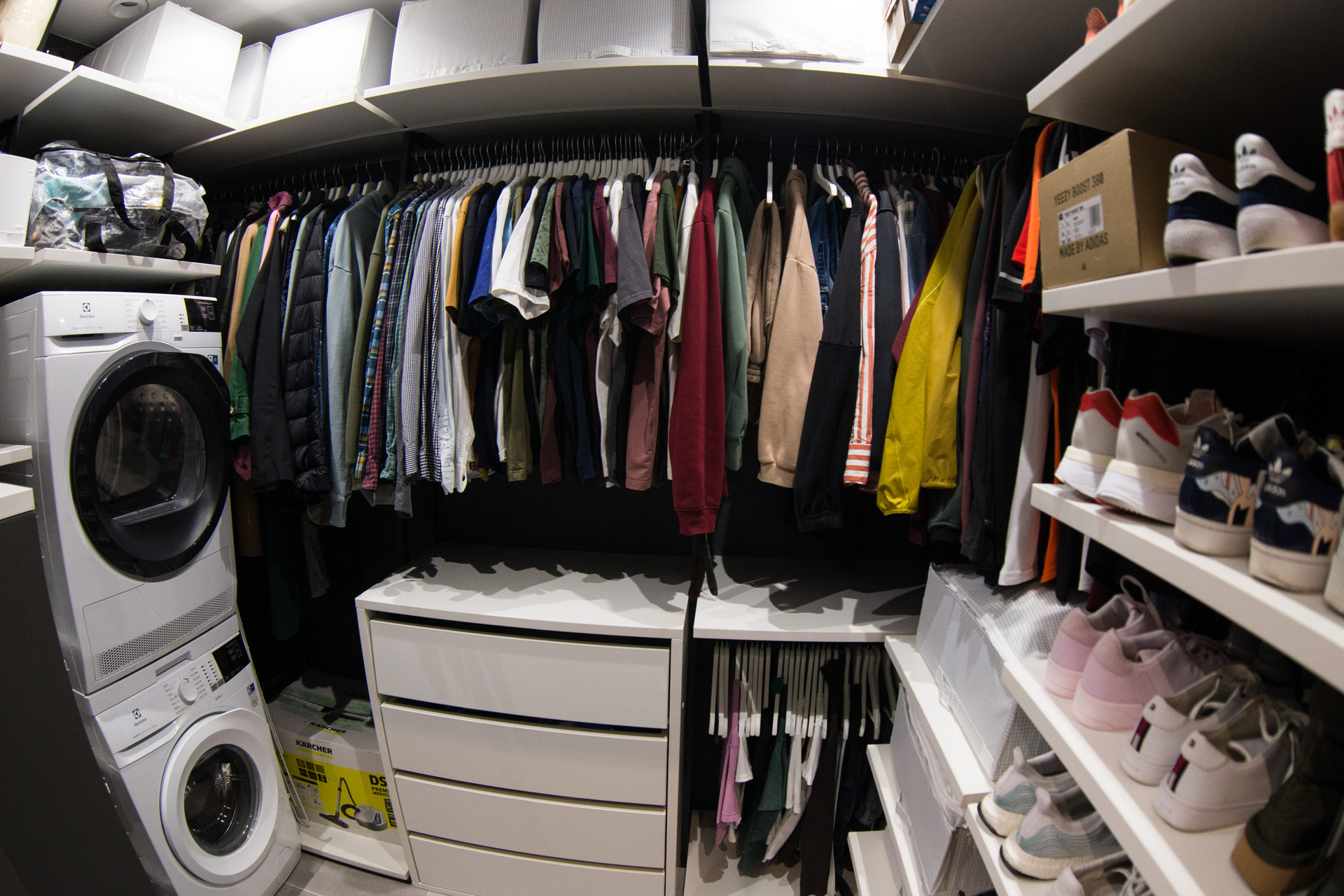 В квартире имеется вместительная гардеробная, сделанная на заказ. Кровать и диван с подъемными механизмами, что создает дополнительные места для хранения.