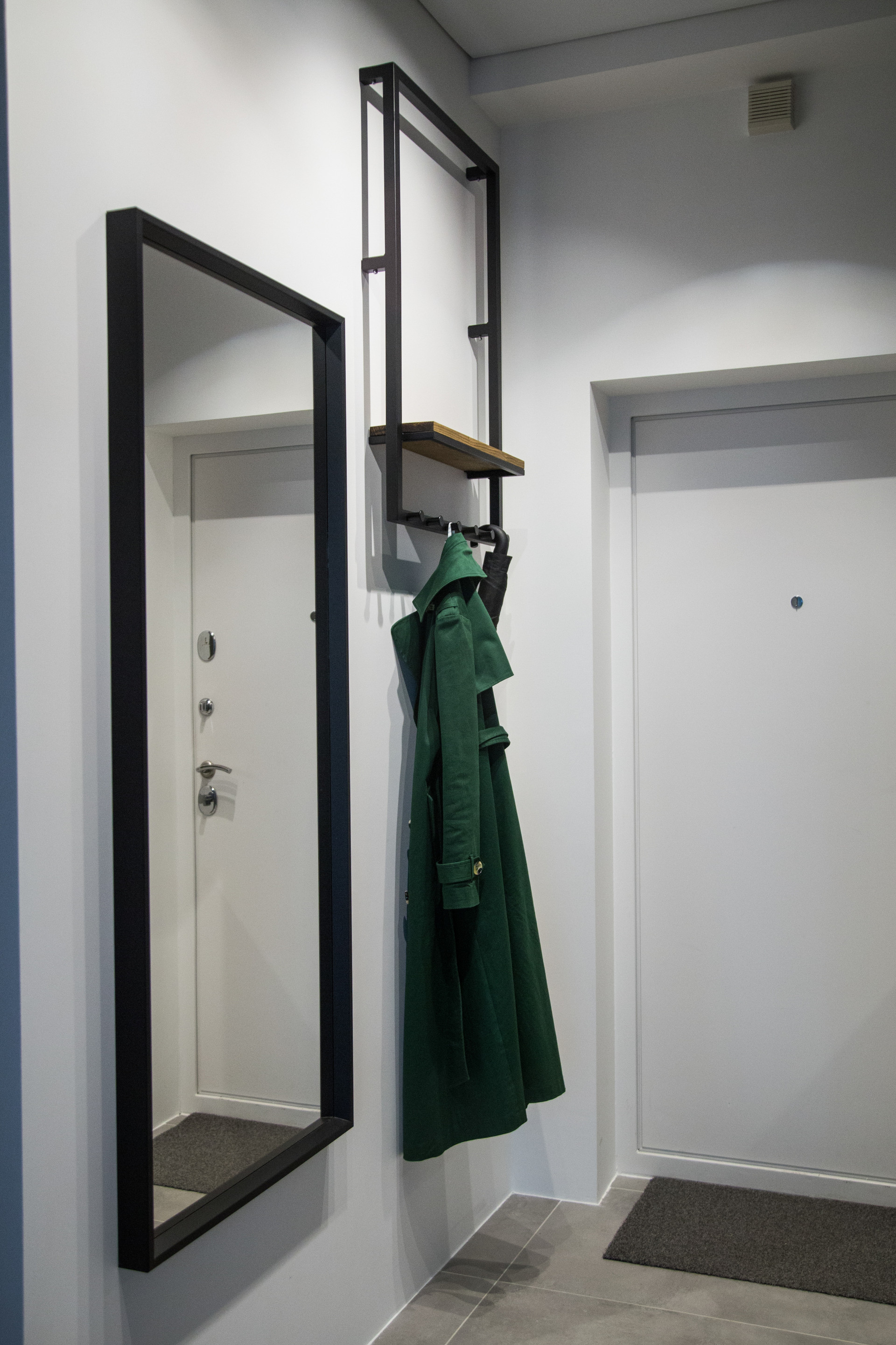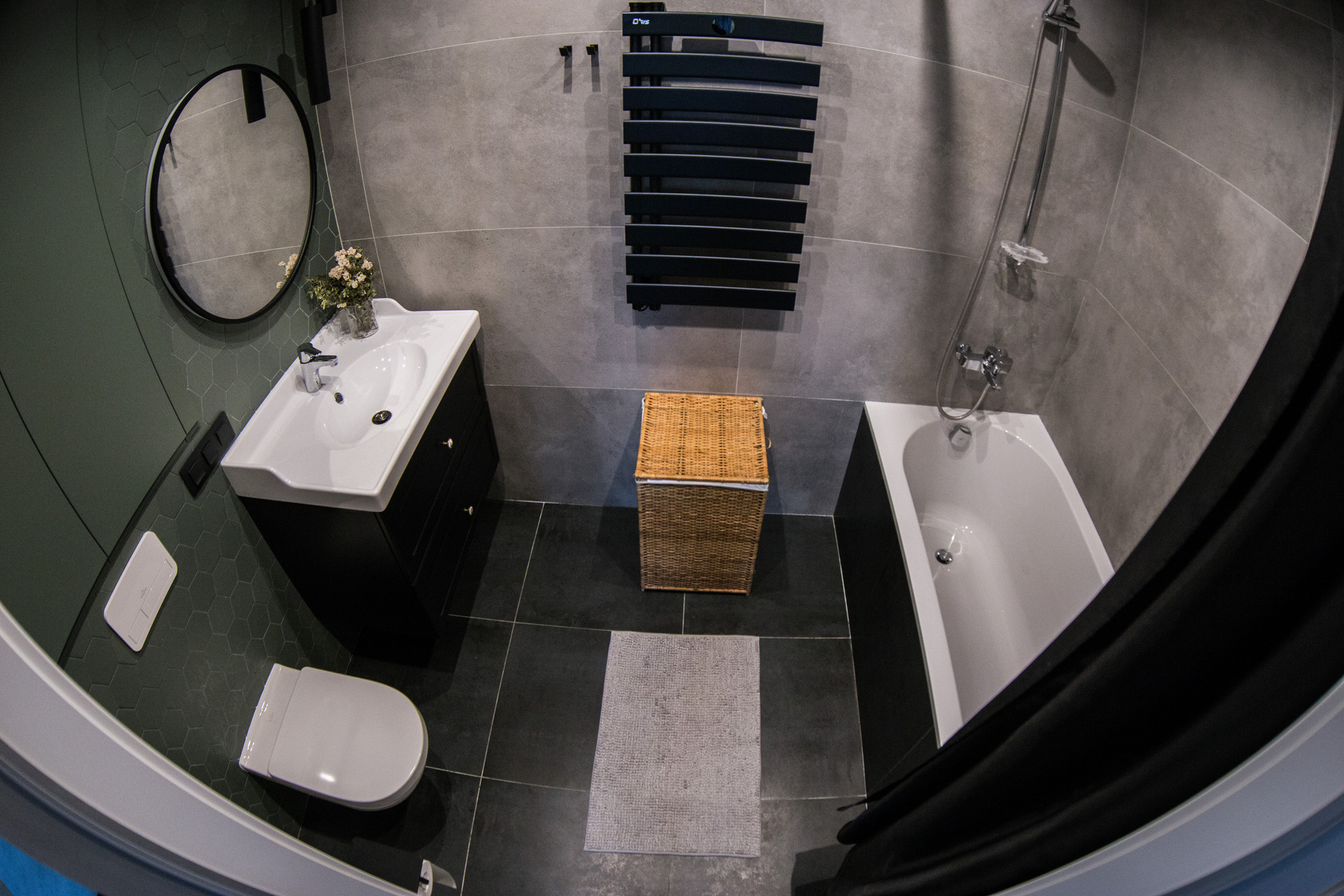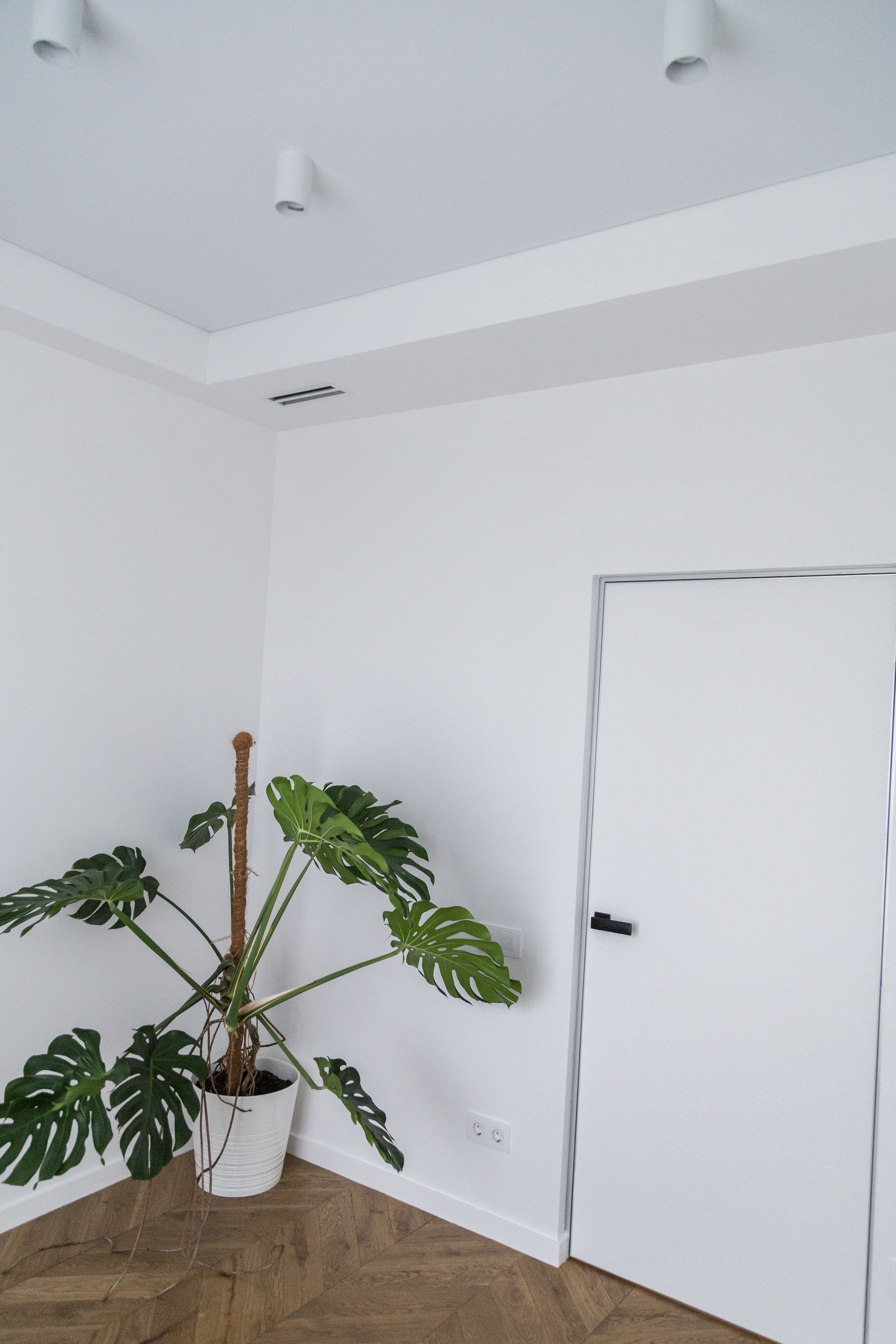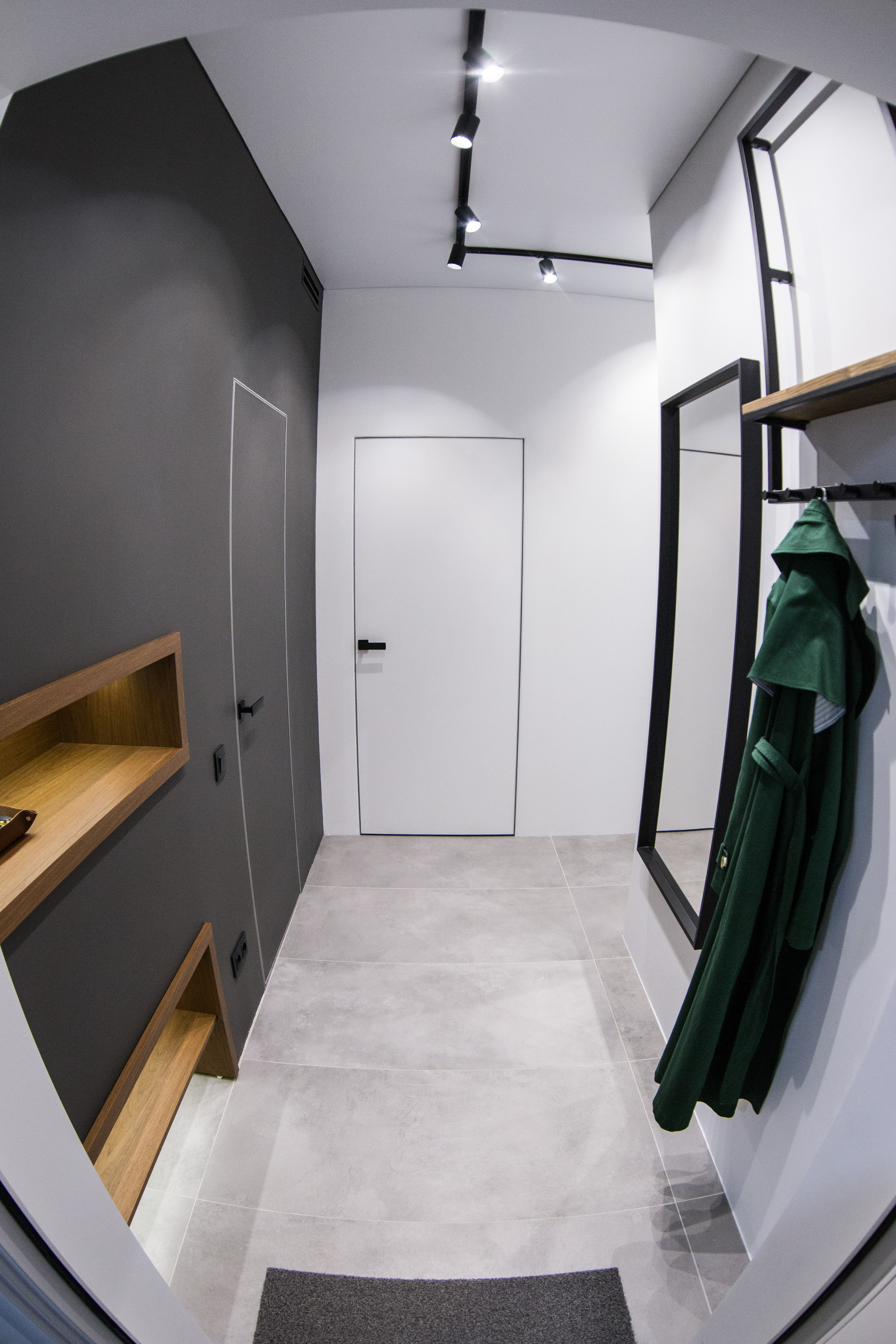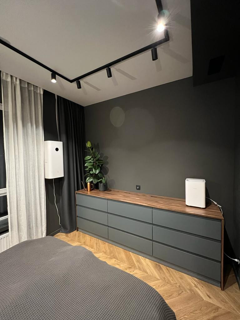 Вся квартира покрашена краской Little Green, на полу лежит крупноформатный керамогранит и дубовая инженерная доска, французская елка. Трехзонный подогрев пола с автоматическим управлением, установлен канальный кондиционер, все стены прилегающие к внешней стороне дома дополнительно имеют теплоизоляционный слой, на полу и на потолке и смежной стене с соседями установлена шумоизоляция.