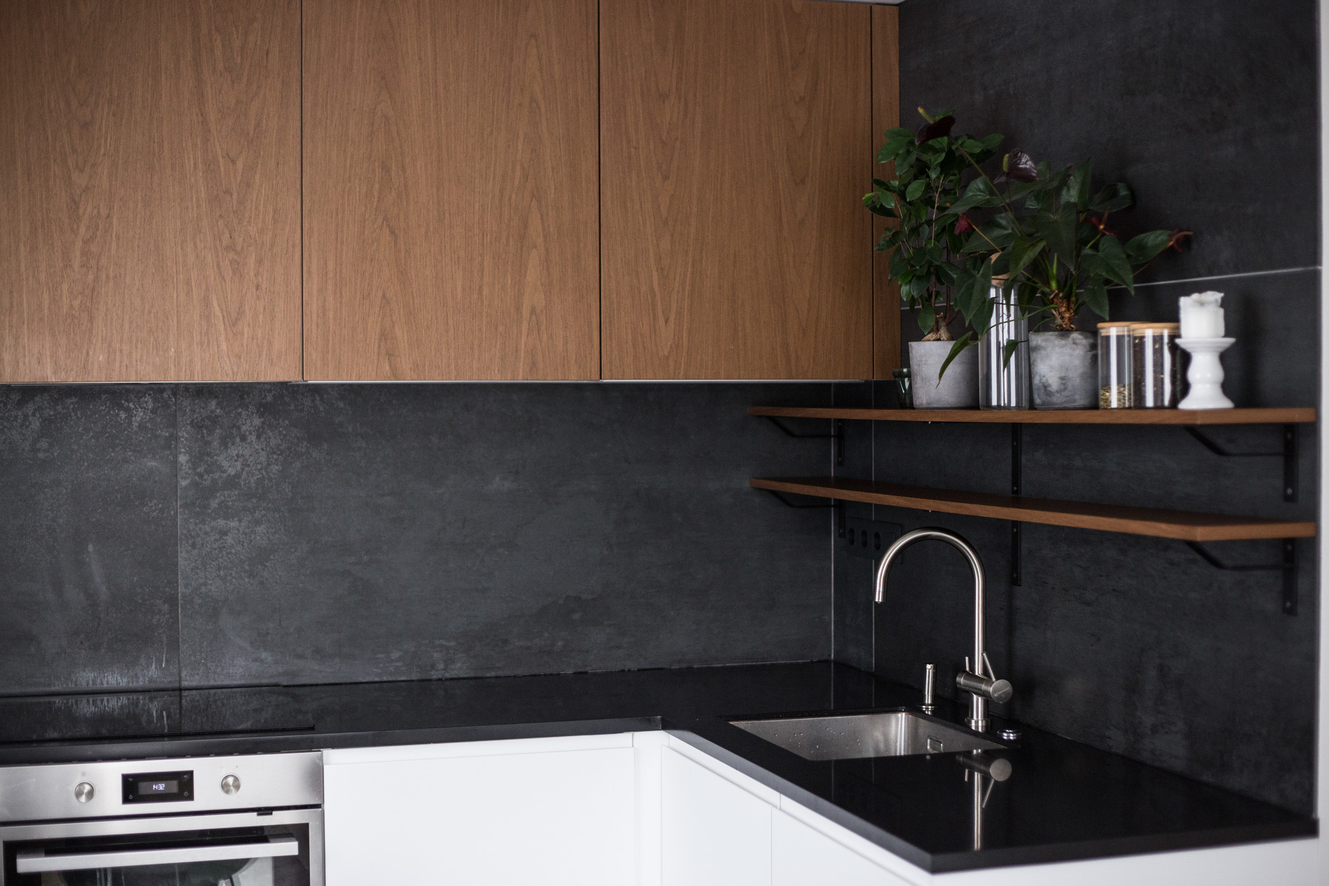 Вся техника на кухне Икея (Electrolux), индукционная плита, самый вместительный холодильник из серии с полной системой No frost, посудомойка с экономичными режимами работы, вытяжка, духовка с автоматической системой отчистки. Нижний и средний ряд кухни - Икея, средний ряд шкафов из дубового шпона сделан на заказ.