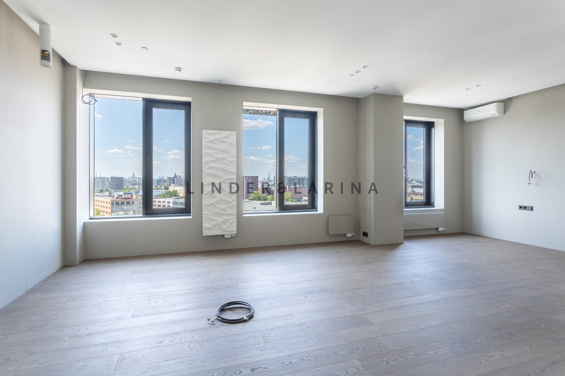 В квартире выполнен качественный дорогостоящий ремонт в современном минималистичном стиле, в отделке использовались лучшие материалы, готовы передать утвержденный дизайн проект. Планом предполагается зона спальни, отделенная стеклянной перегородкой, имеющая вместительную (6 кв.м.) гардеробную комнату, и просторную кухню-гостиную. При входе также спроектирована зона хранения, сан. узел совмещенный. Высокие (3,3 м.) потолки и окна (2,1 м.) наполняют пространство естественным светом. Безусловным плюсом квартиры является панорамный вид на город, есть возможность наблюдать р. Москву, Сити, Университет, Храм Христа Спасителя и др.