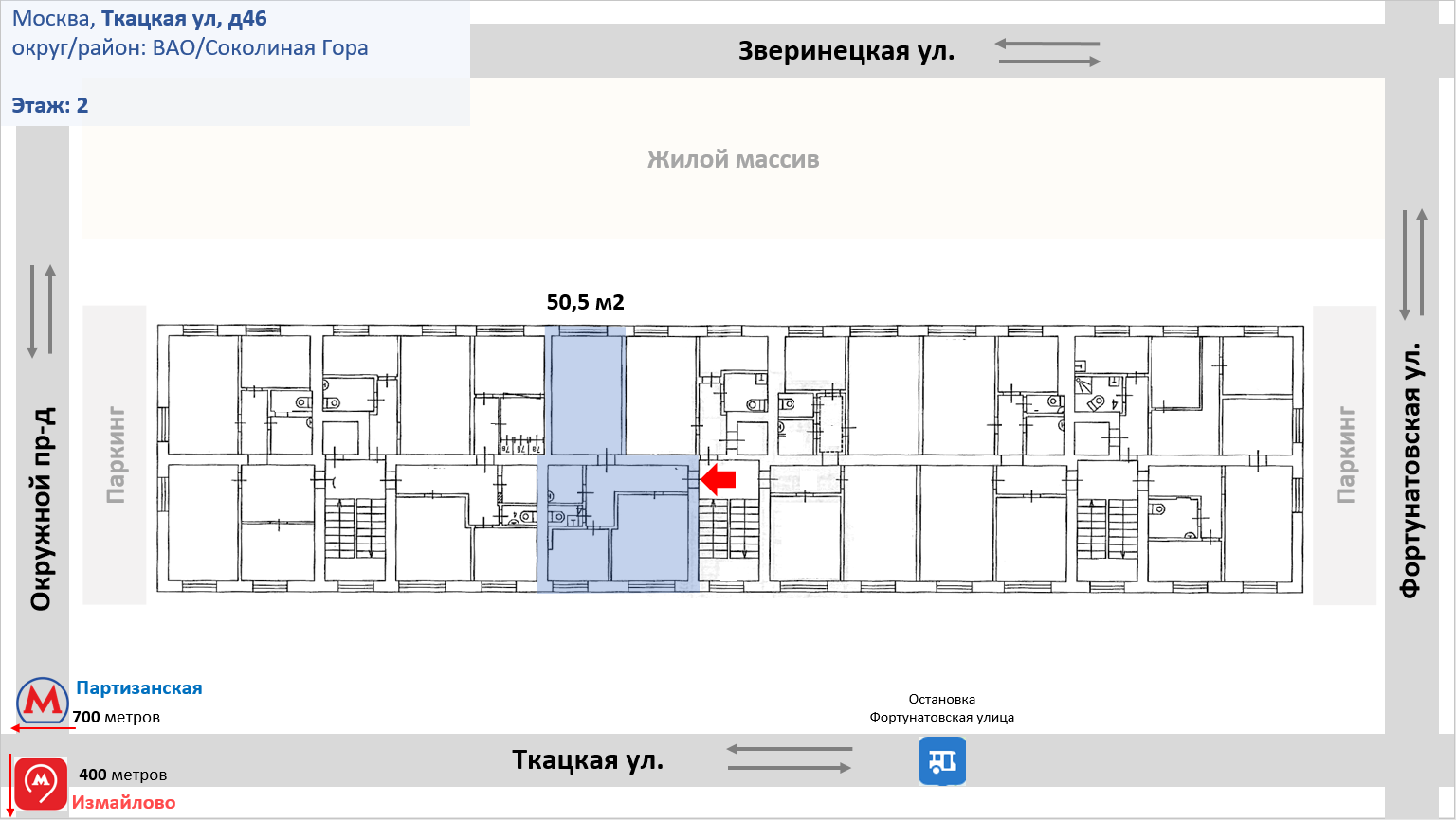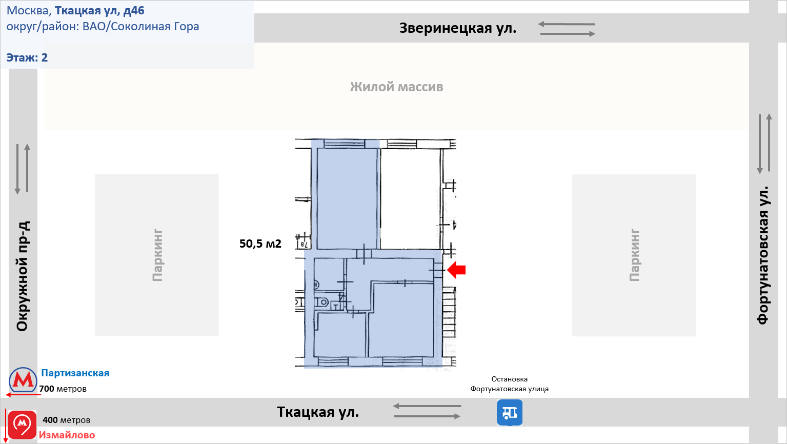 2-комнатная квартира, 50.5 м2, этаж 2 / 5, на продажу в Москве, Ткацкая улица, 46