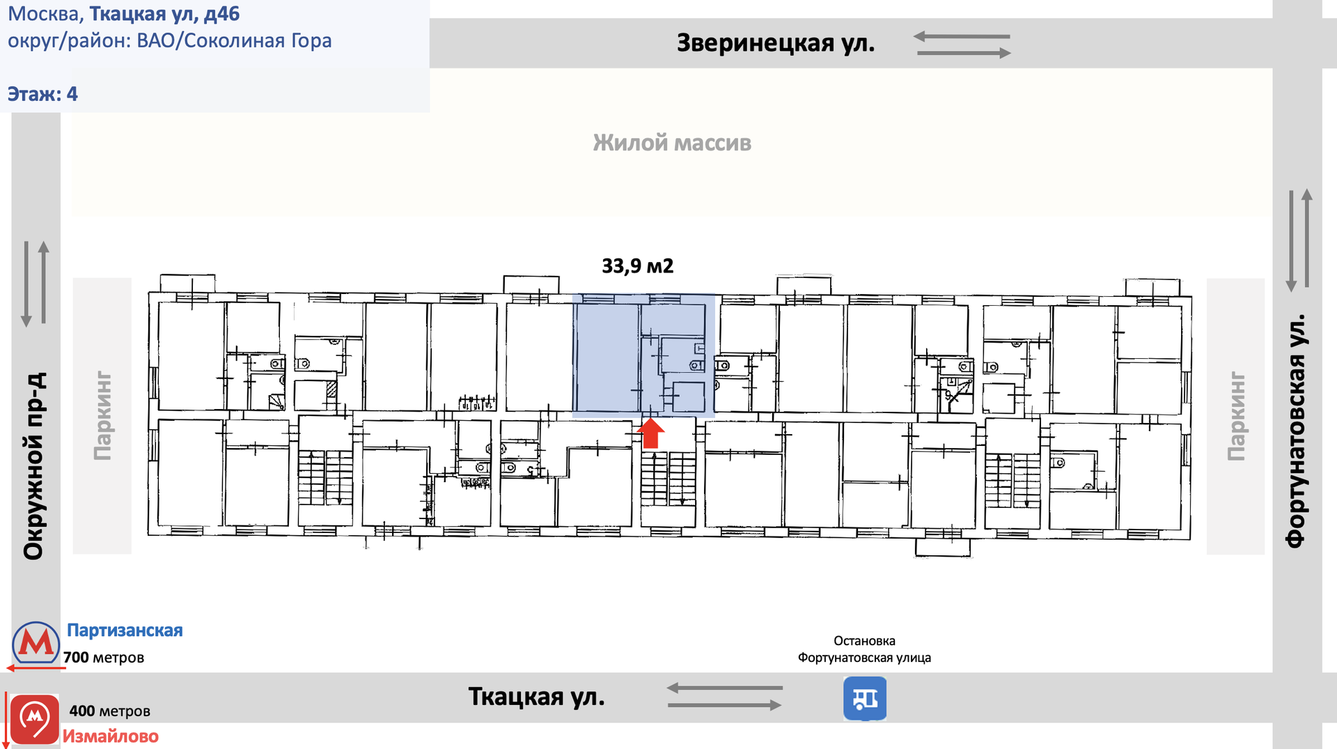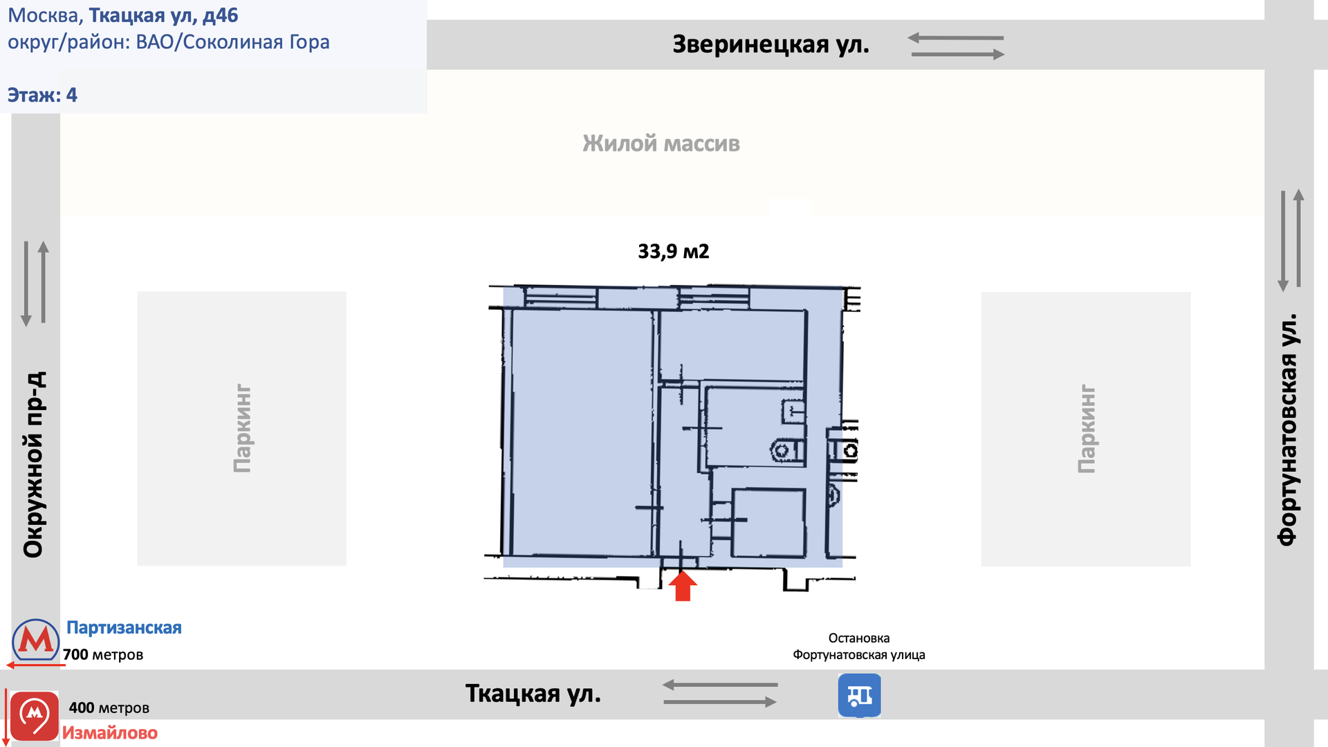 1-комнатная квартира, 33.9 м2, этаж 4 / 5, на продажу в Москве, Ткацкая улица, 46