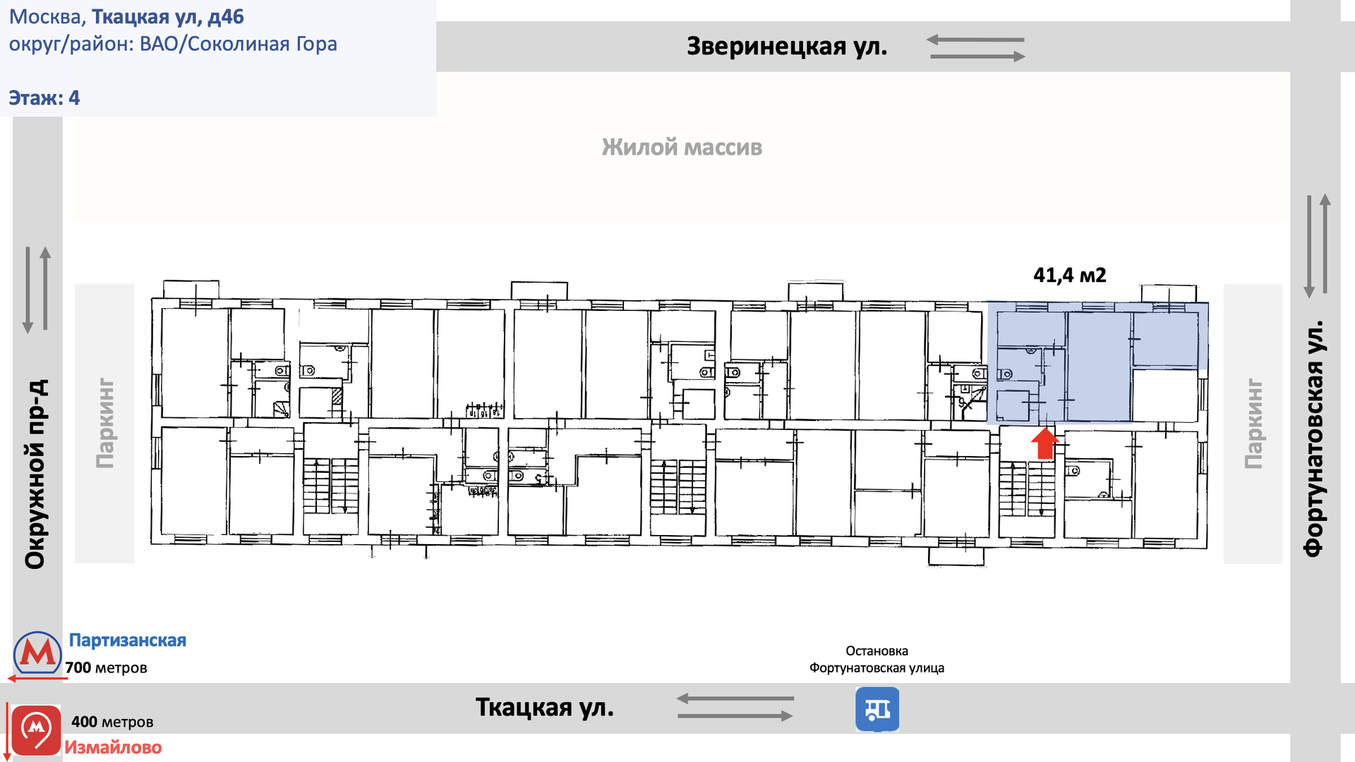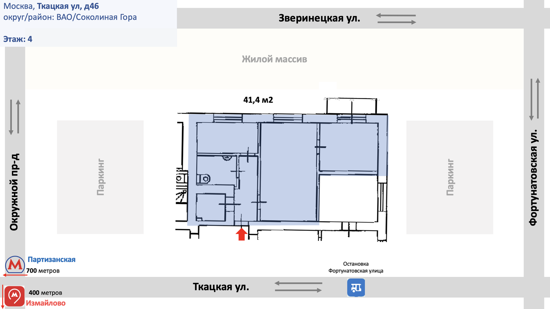 Пешая доступность к метро Партизанская и МЦК Измайлово.